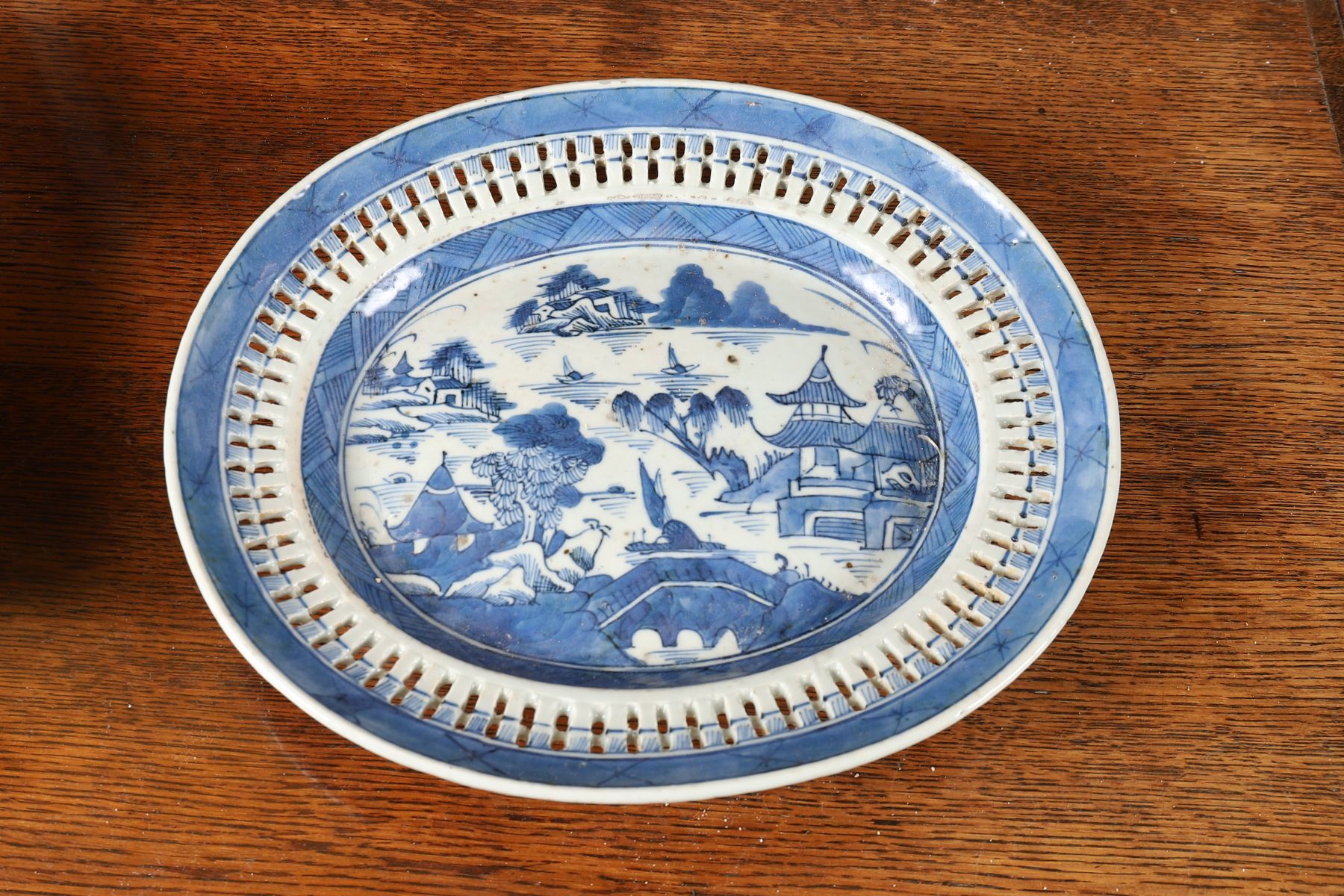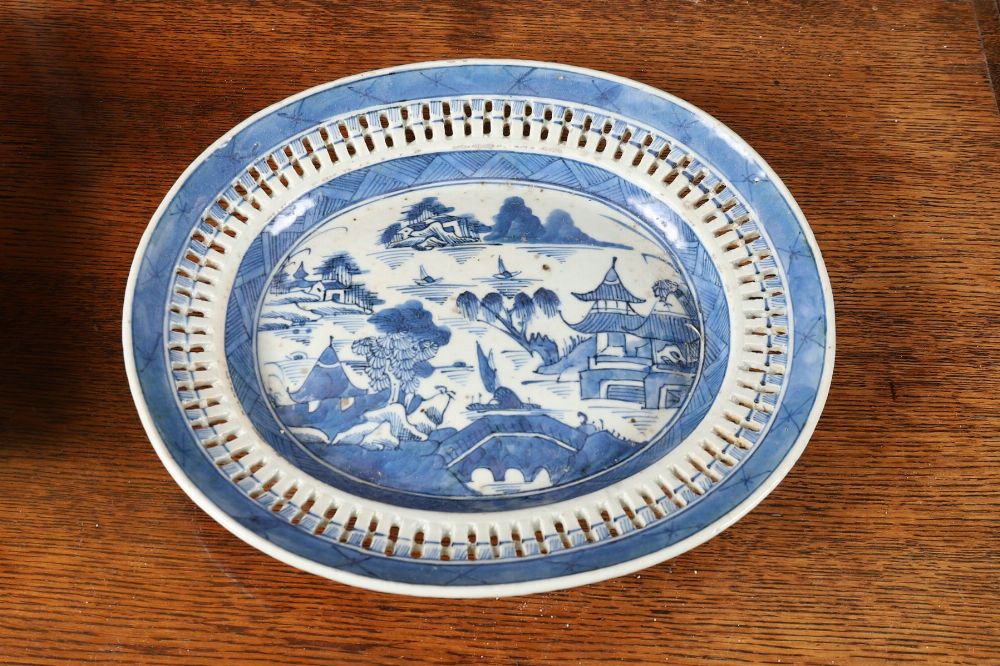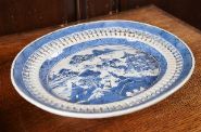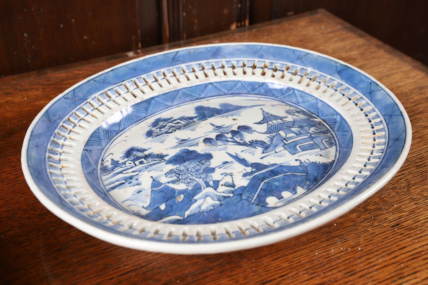 A Chinese Qing dynasty blue and white porcelain charger, the central panel painted with a landscape scene of pavilions, bridges and figures, within a pierced reticulated border and patterned rim. 18th / 19th century.