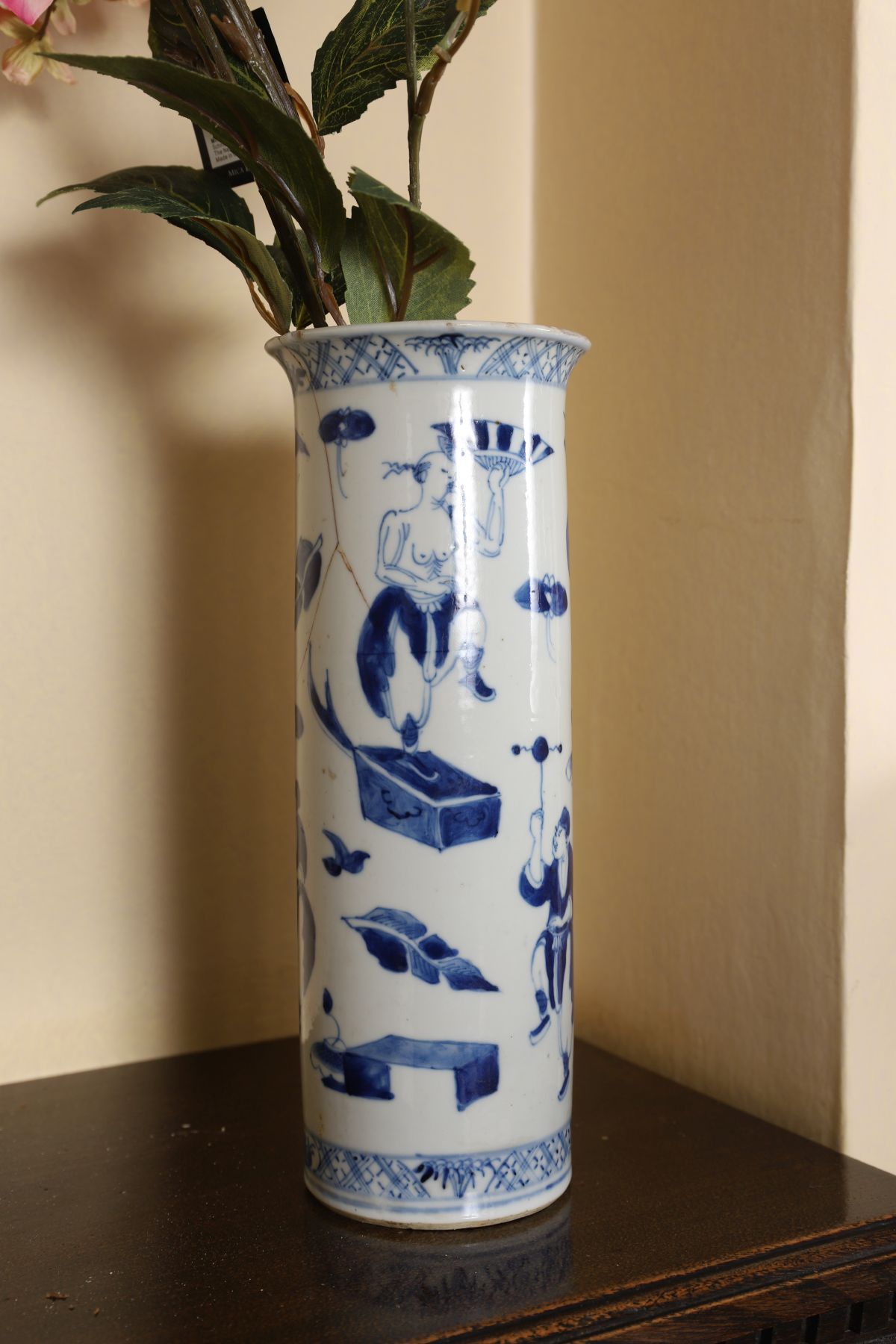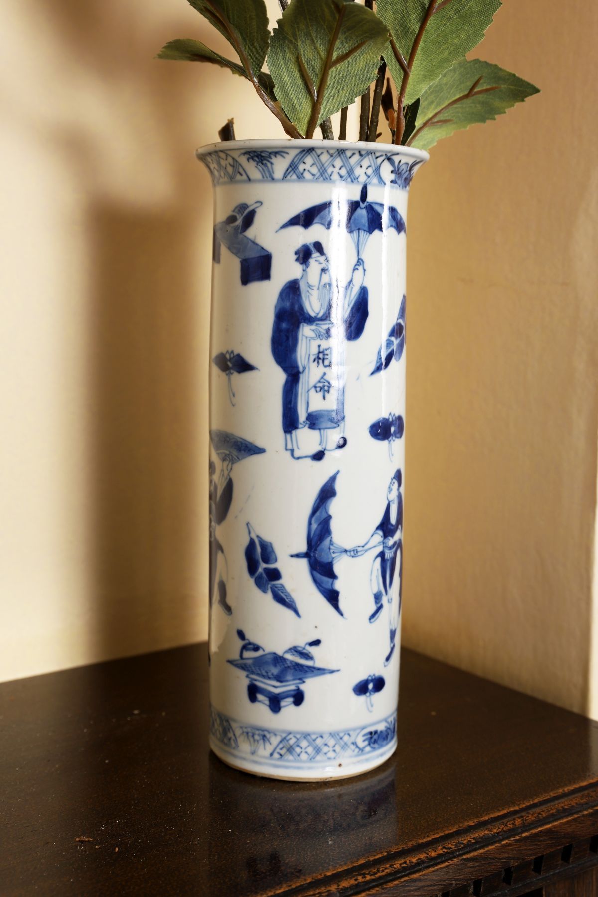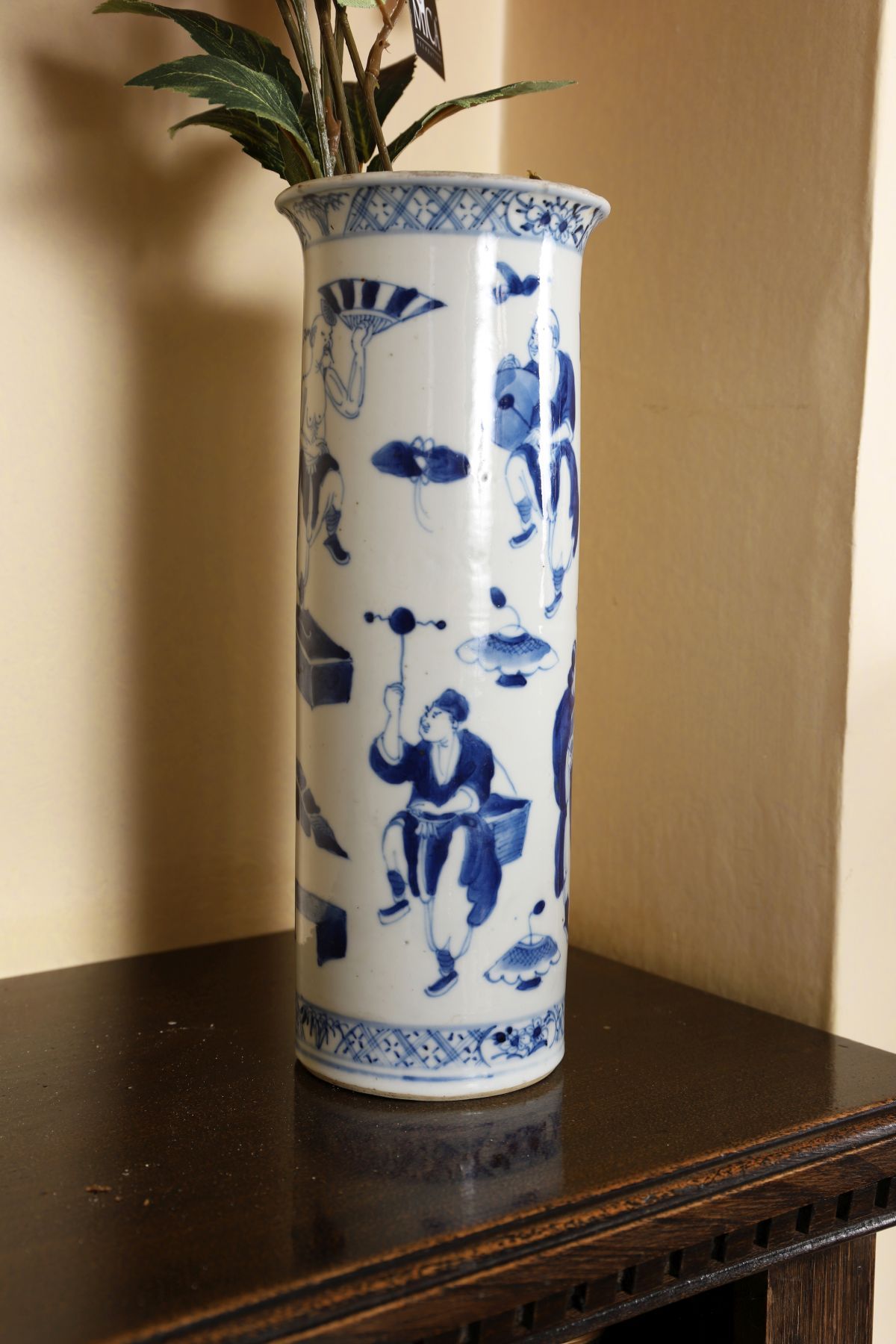 A Chinese Qing blue and white sleeve vase of cylindrical form, decorated in cobalt blue with figures, foliage and decorative motifs, beneath a patterned border at the rim. The base bearing a painted 4-character mark to base.