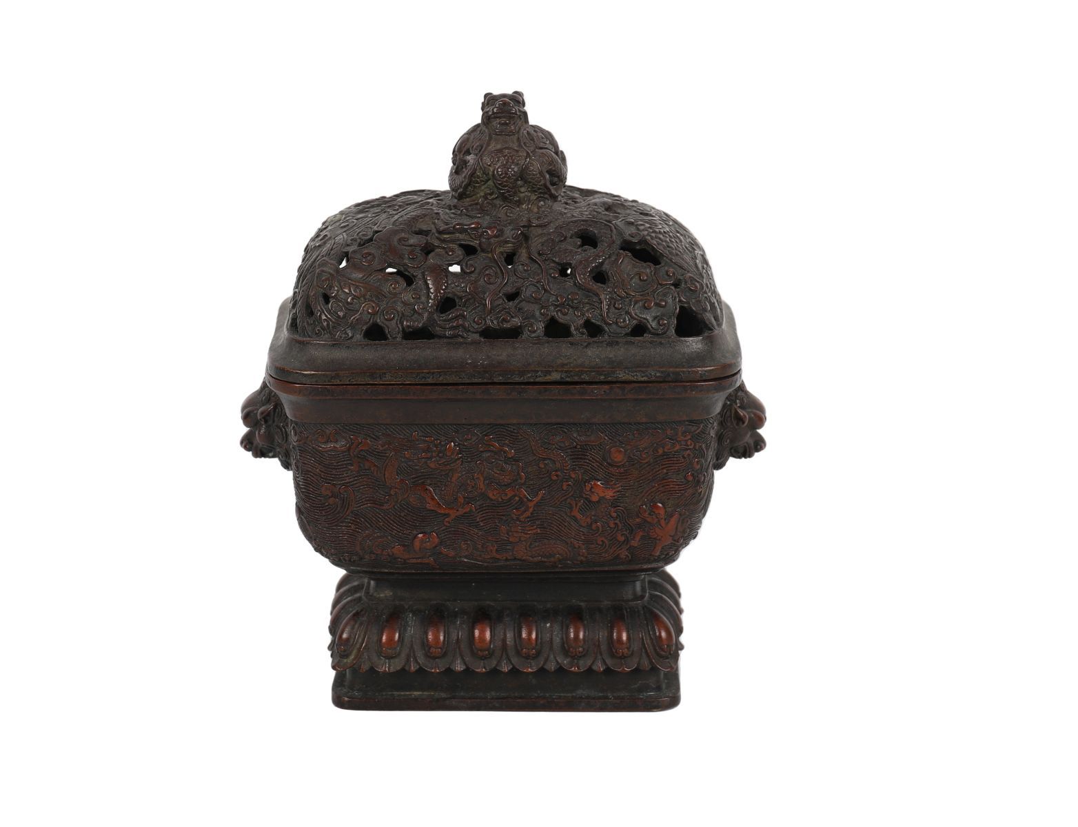 Square-section form with finely pierced domed lid surmounted by a dragon finial, the sides cast with scrolling dragons in relief, raised on a lotus base.