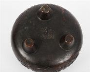 Of compressed globular form with twin arch handles, cast with foliate relief decoration and standing on three short feet.