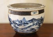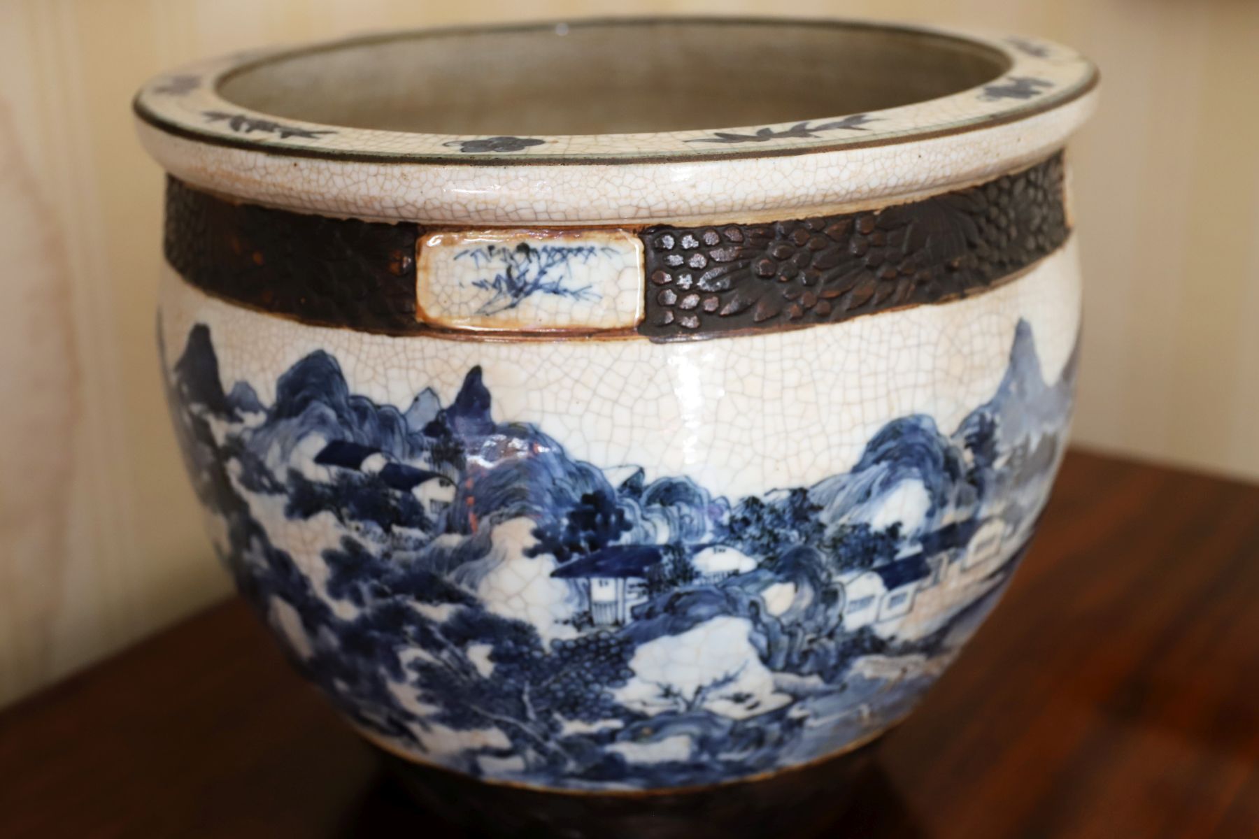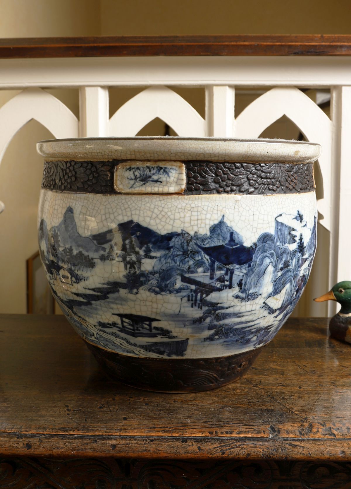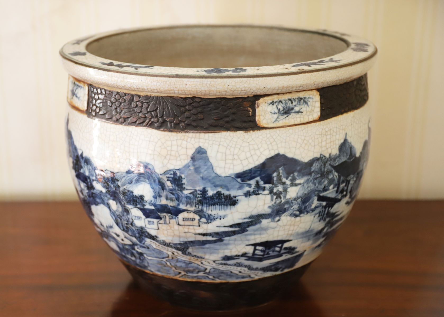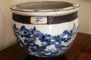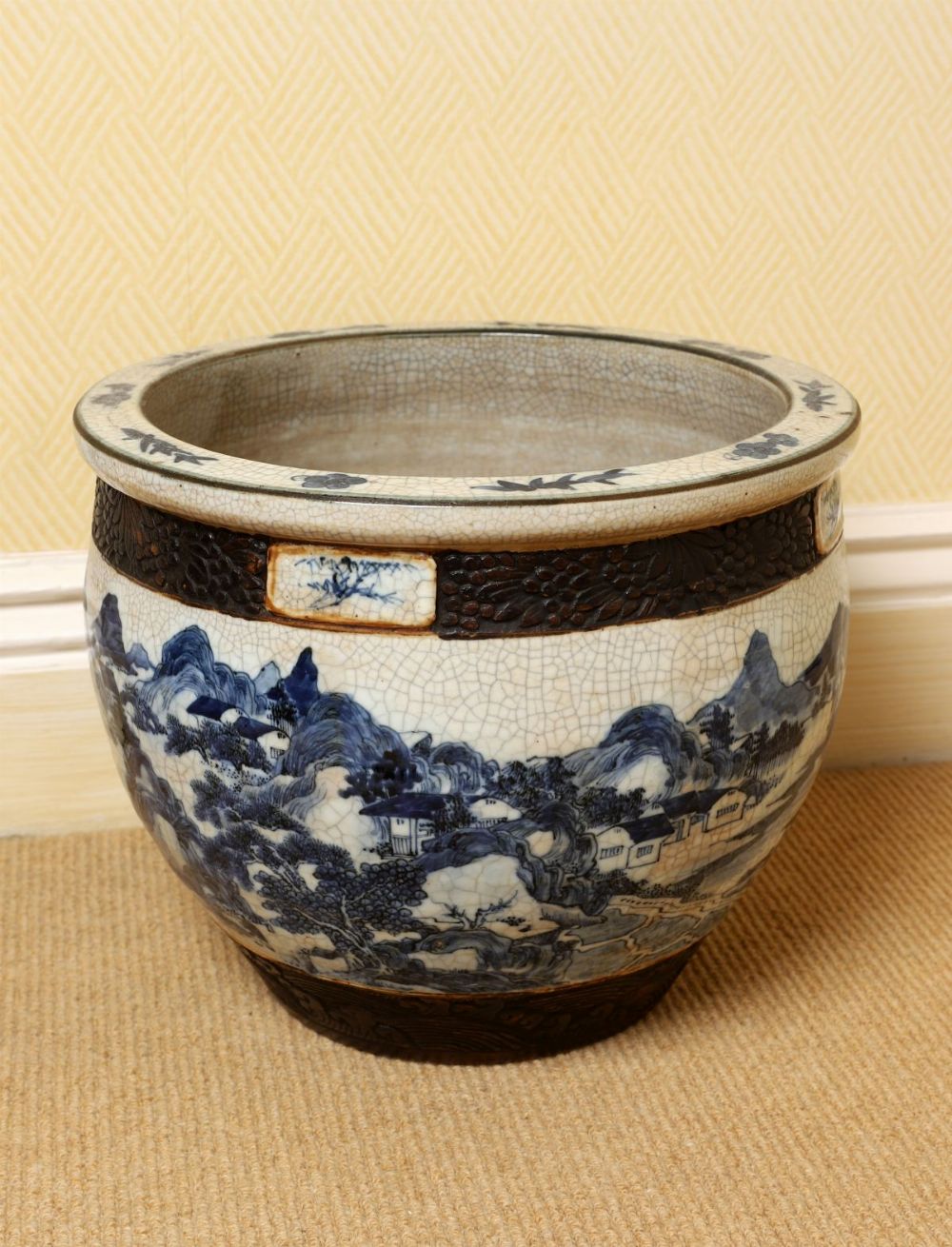 Lot 560 CHINESE QING DYNASTY BLUE AND WHITE CRACKLE-GLAZE JARDINIERE