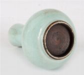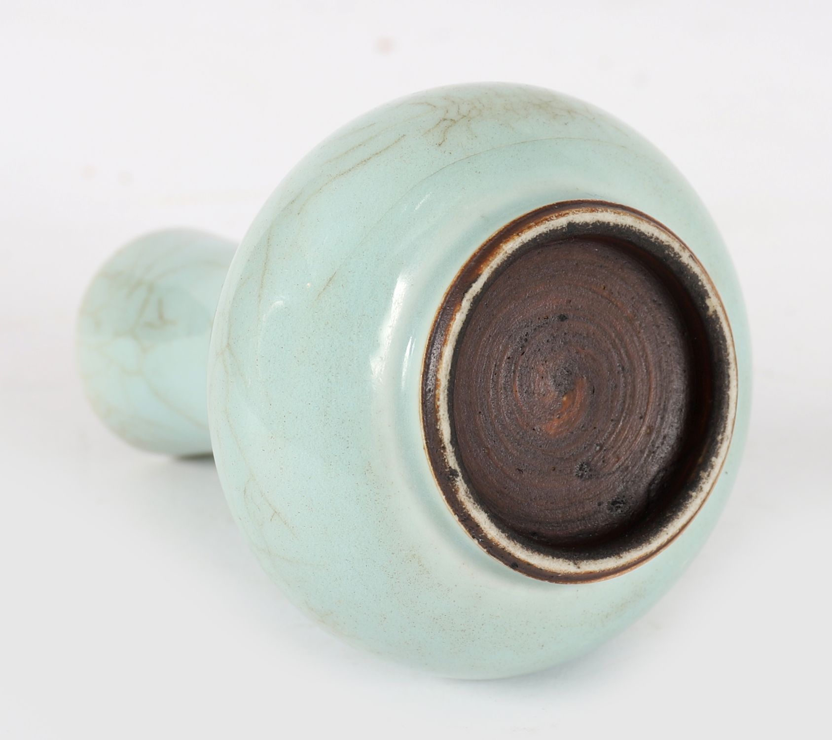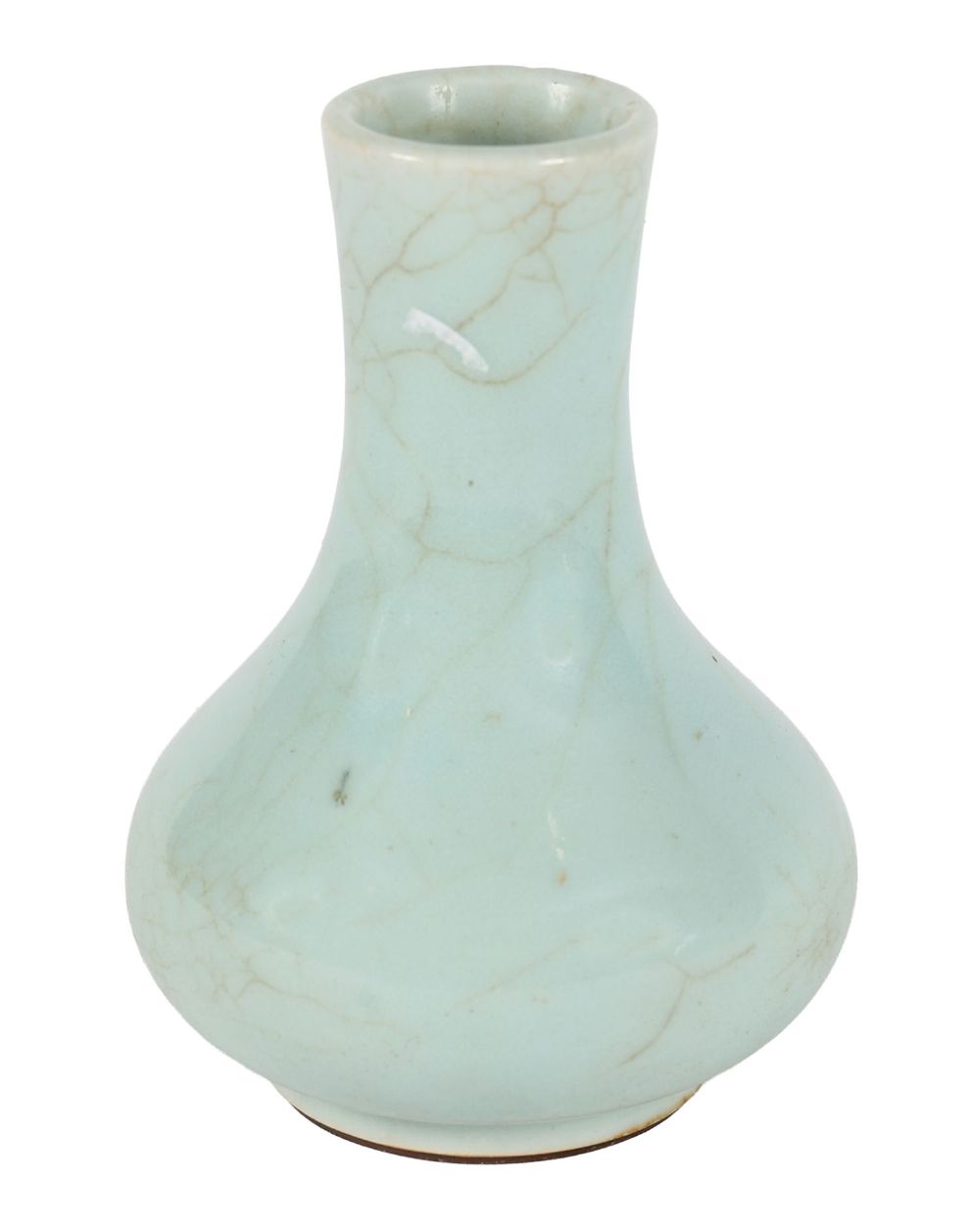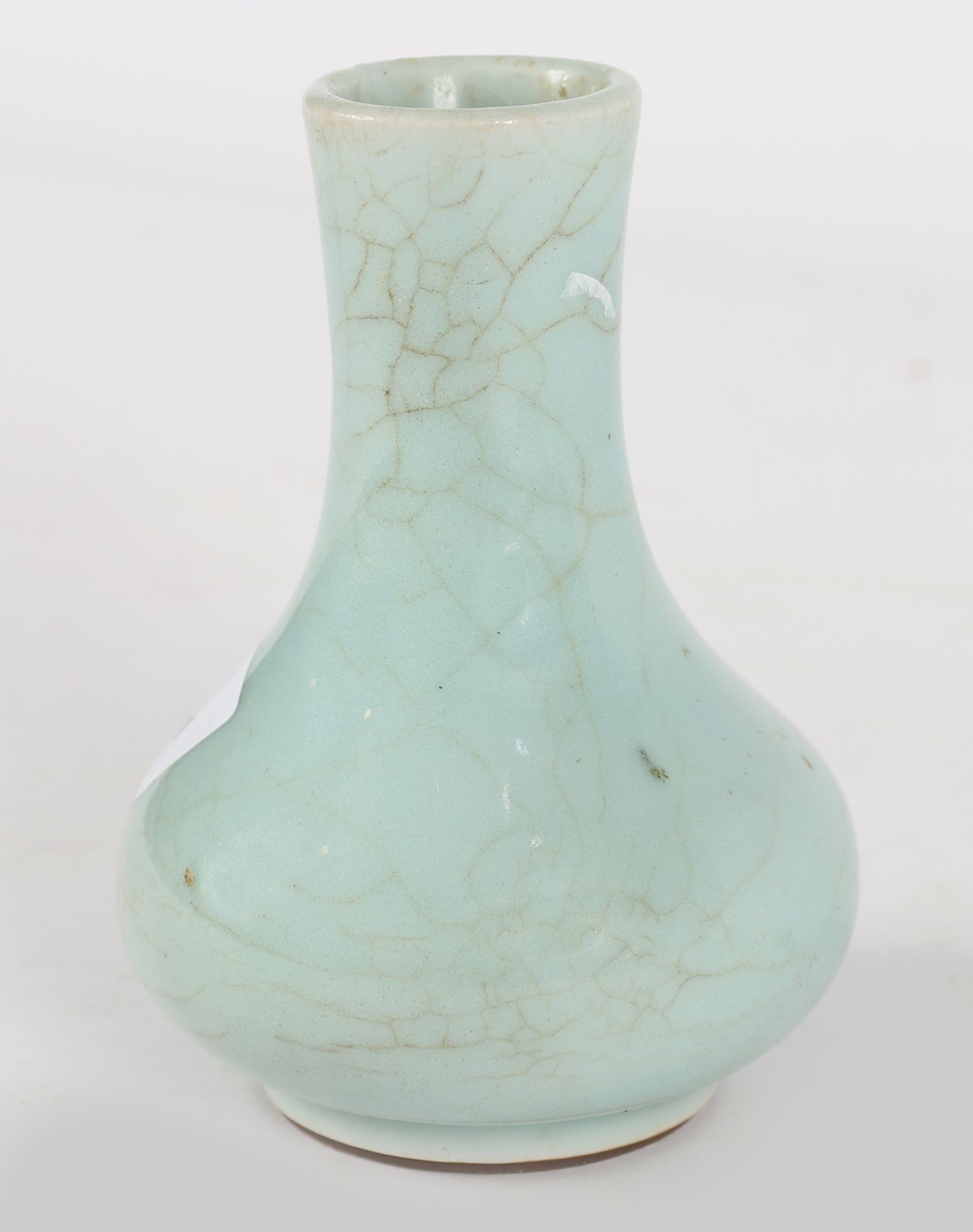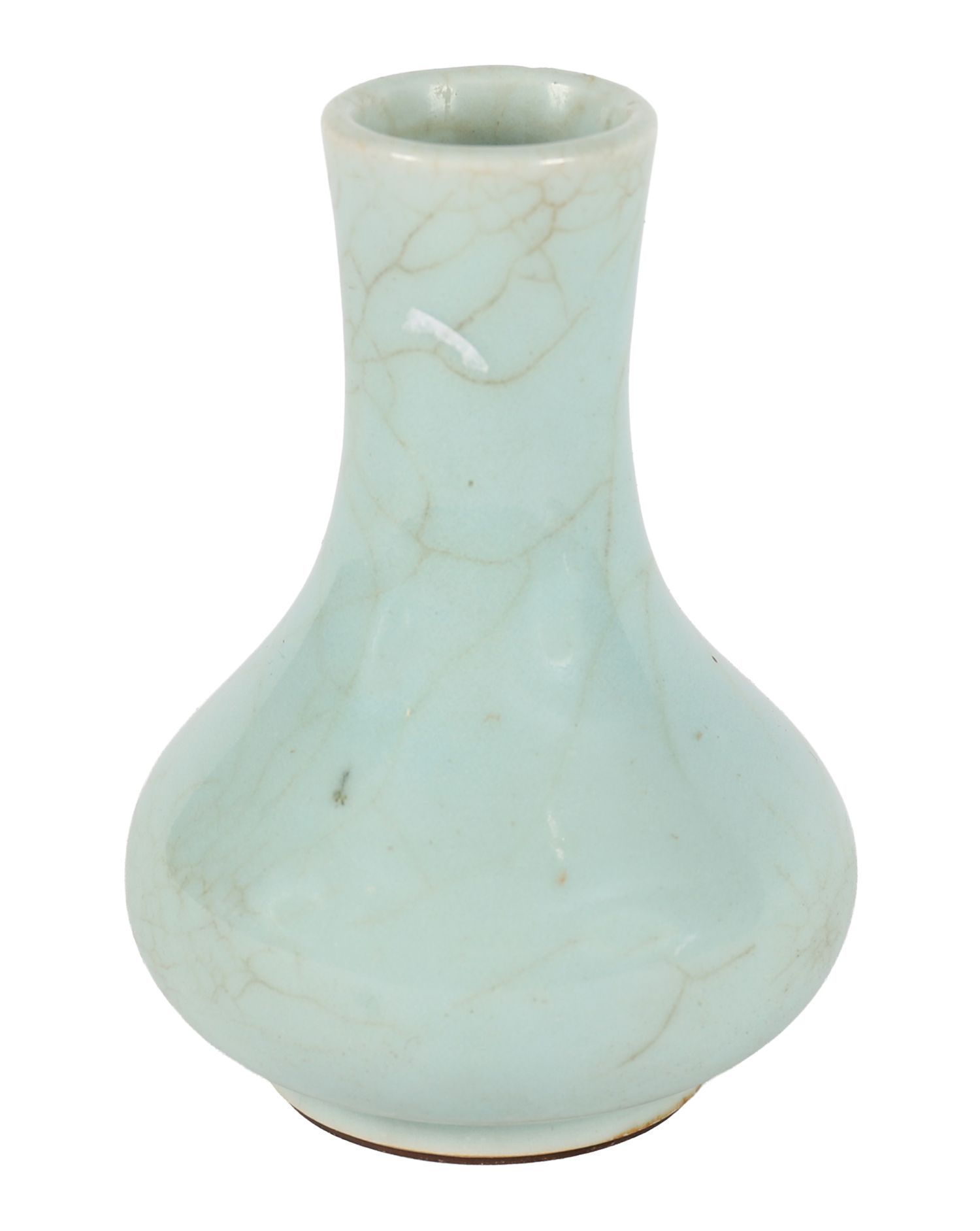 A small Chinese Qing dynasty porcelain bottle vase with pale celadon glaze, the surface displaying an attractive network of fine crackle. Of elegant bulbous form with a narrow neck and slightly everted rim.
