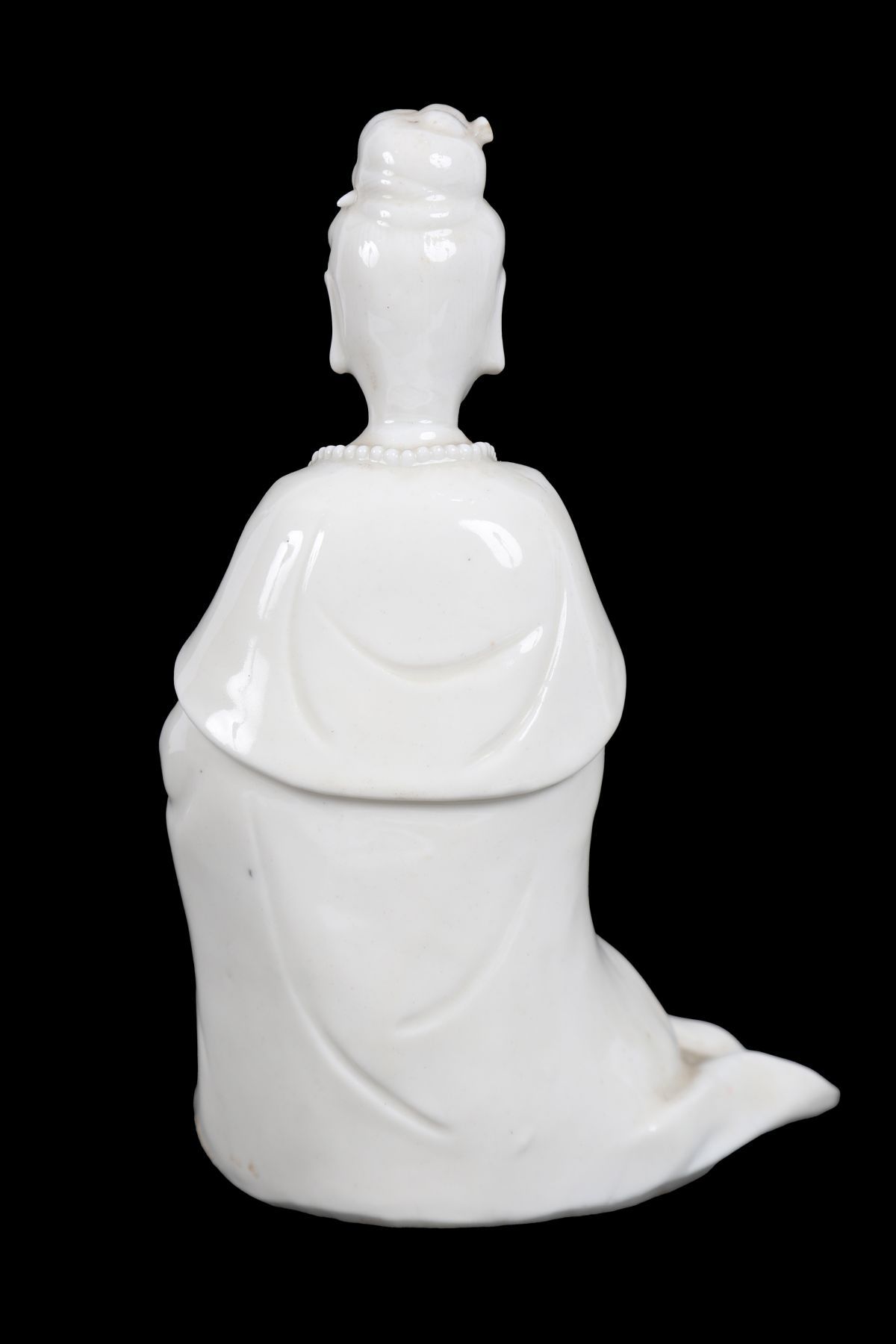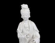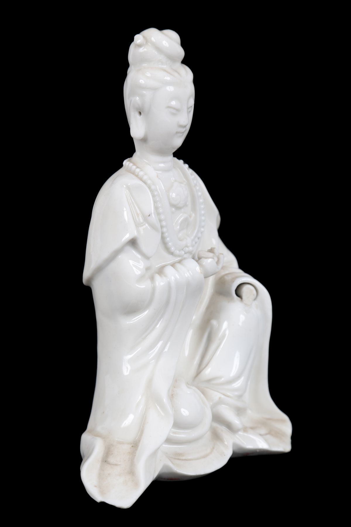 Modelled seated in flowing robes, with serene expression and beaded necklace, the hands positioned to hold a ritual object, finished in a soft blanc-de-chine glaze, raised on an integral base.