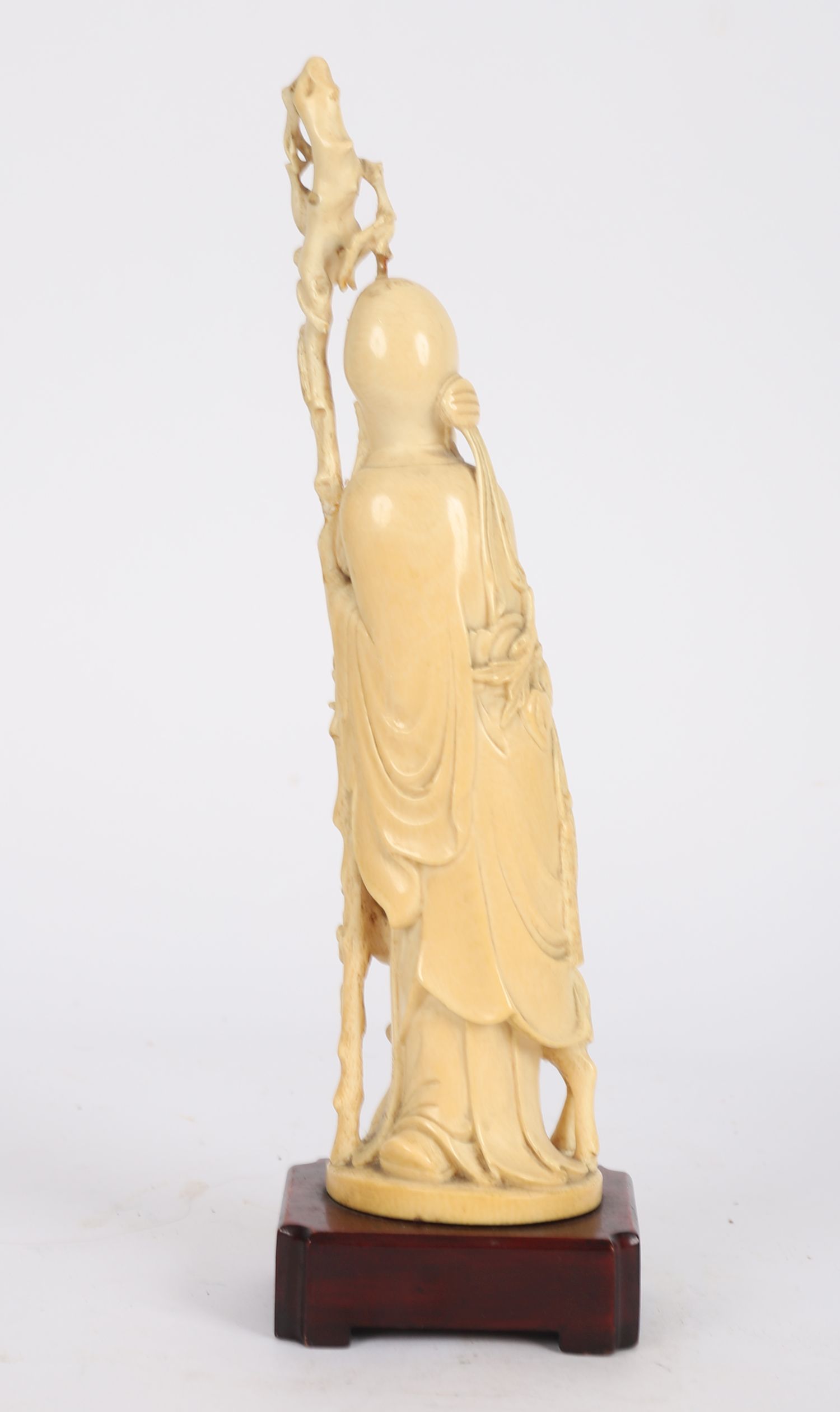 A finely carved Chinese ivory figure of a Lohan, depicted with serene expression, flowing robes, and symbolic attributes.