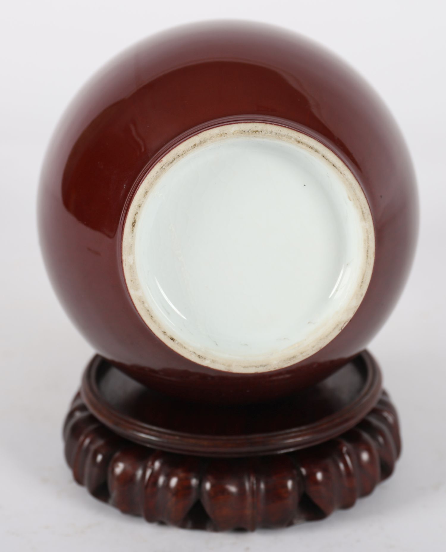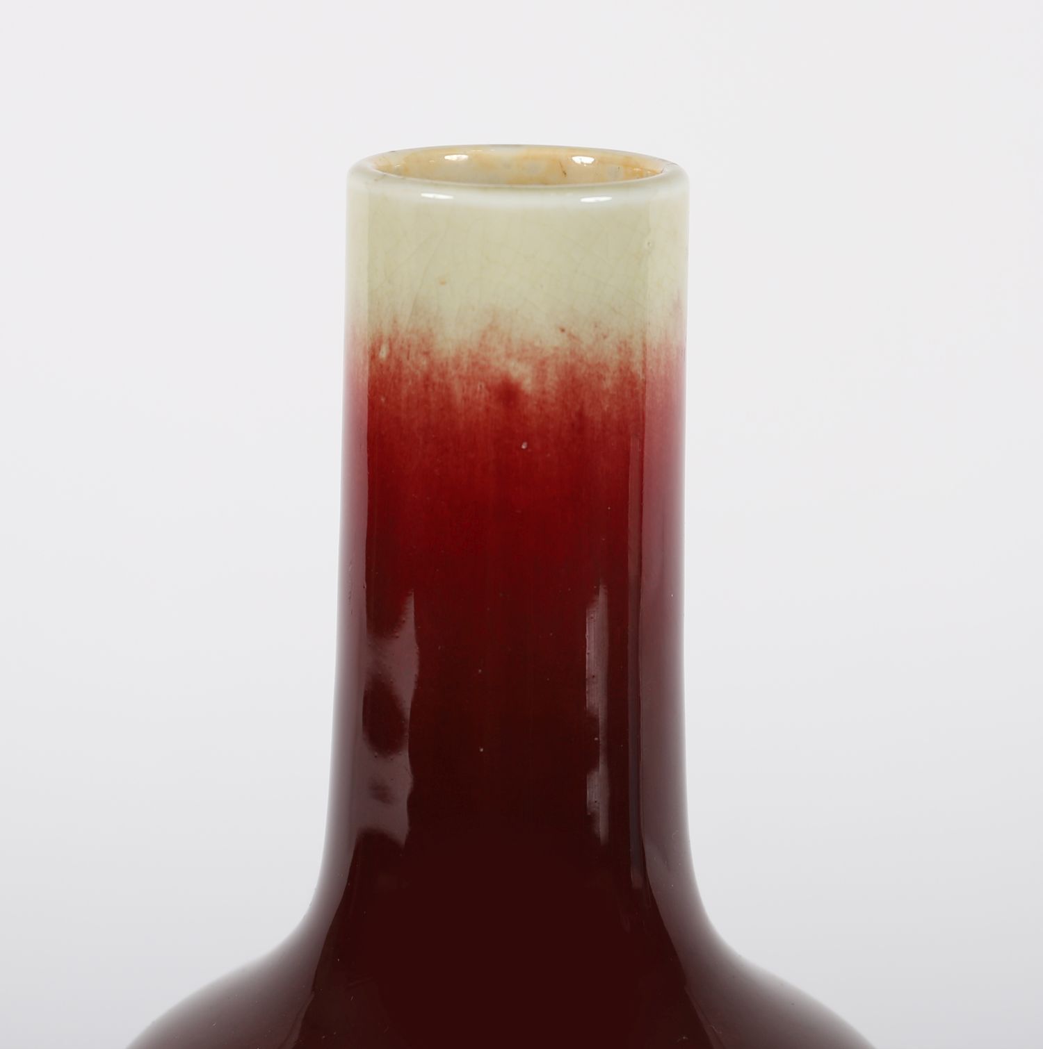 A Chinese Qing dynasty porcelain bottle vase with a sang-de-boeuf (oxblood) glaze, graduating to a pale ivory-toned rim. The glaze is rich and lustrous, pooling attractively at the base and thinning toward the neck, with visible crackle to the interior glaze. Raised on a carved hardwood stand.
