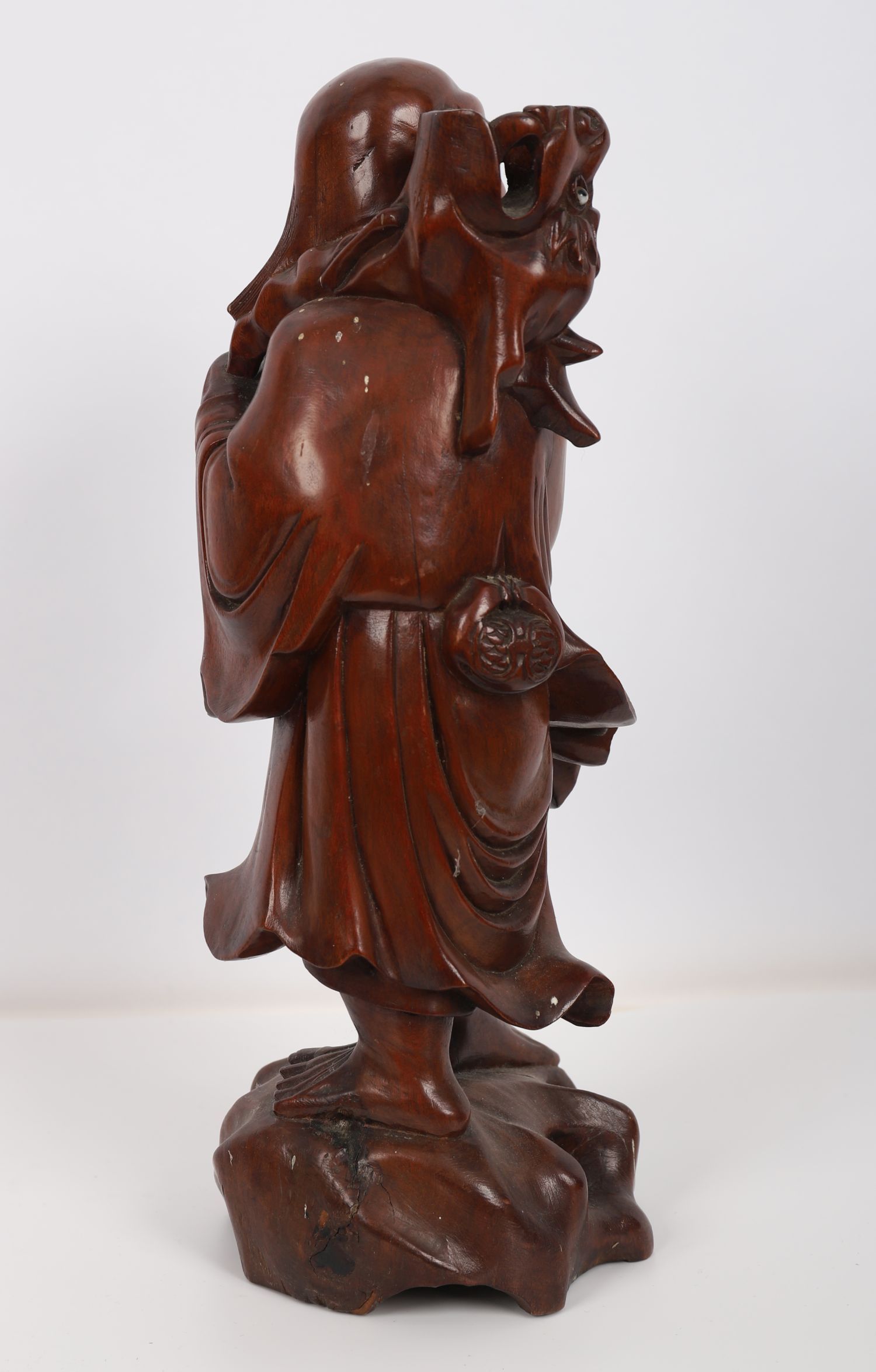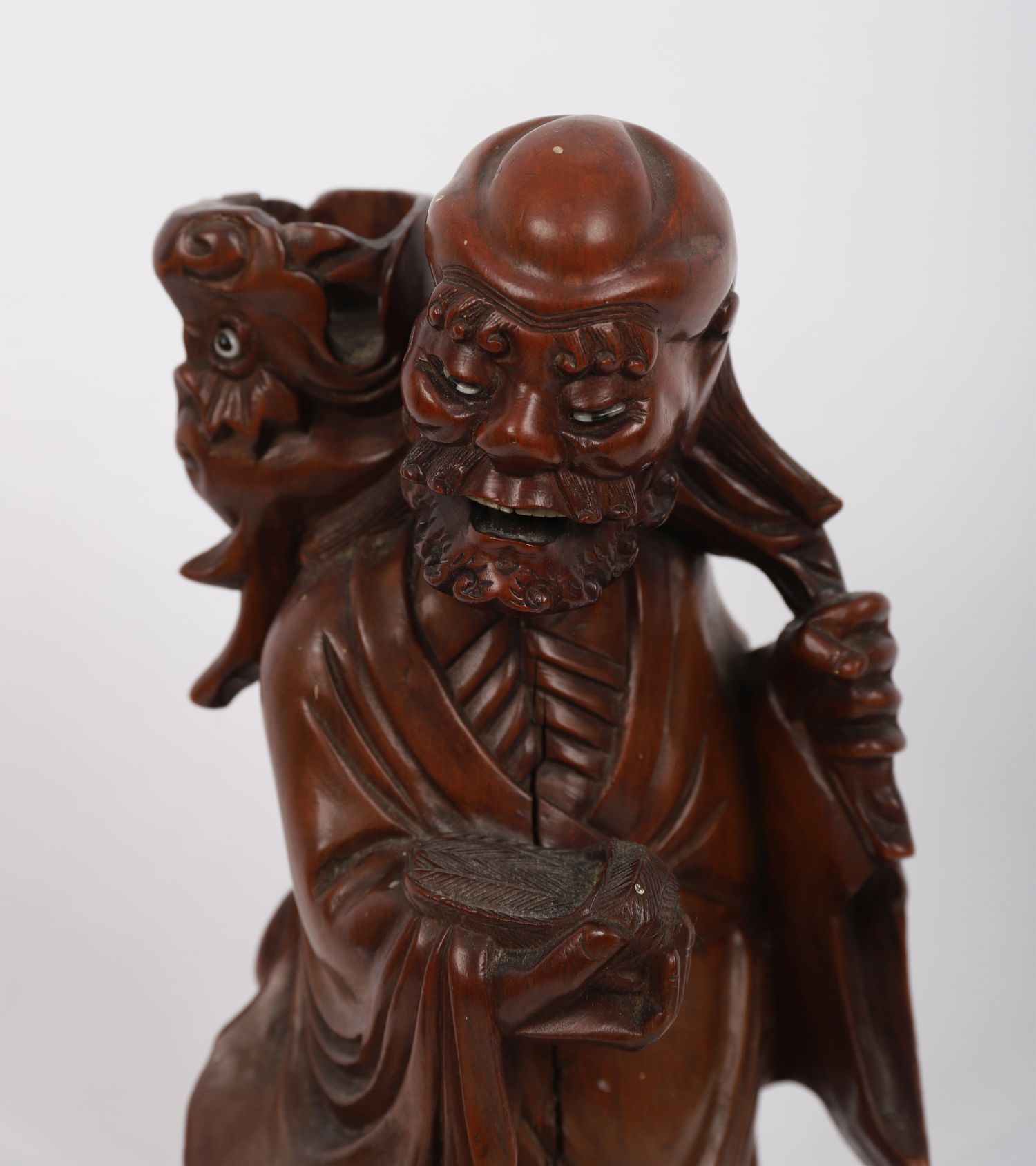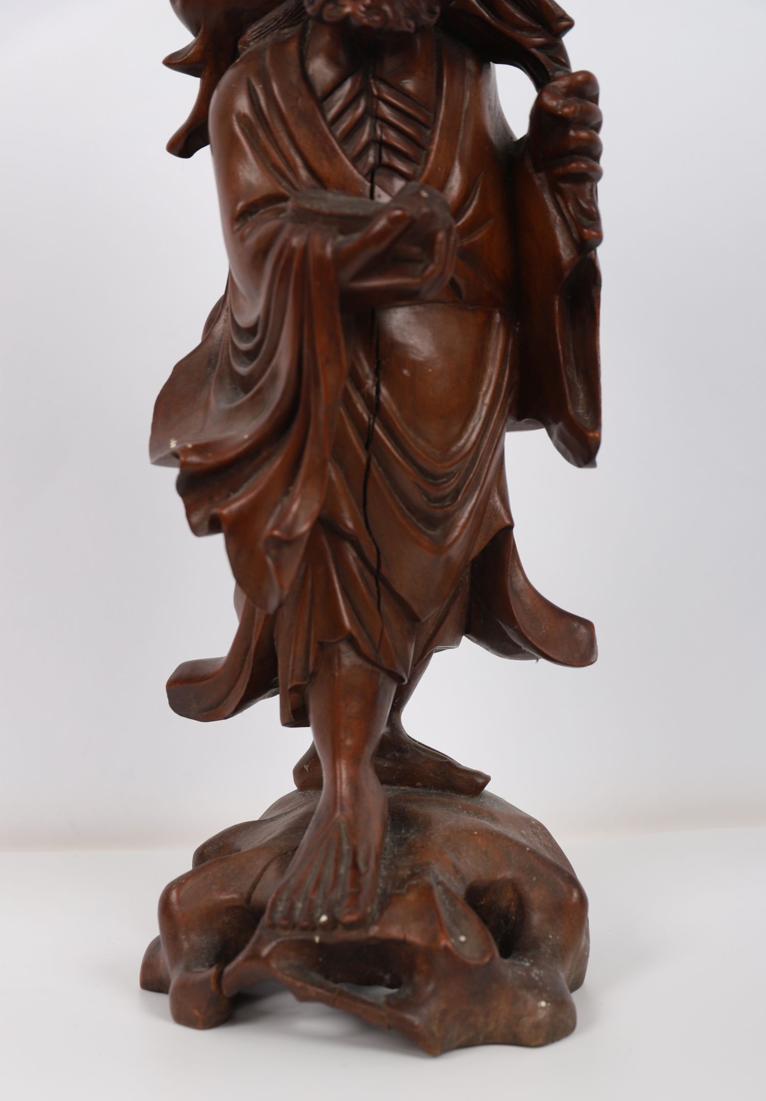 Finely carved hardwood figure of a Lohan, depicted with expressive features and flowing robes, standing upon a pierced rootwork base, Qing Dynasty.