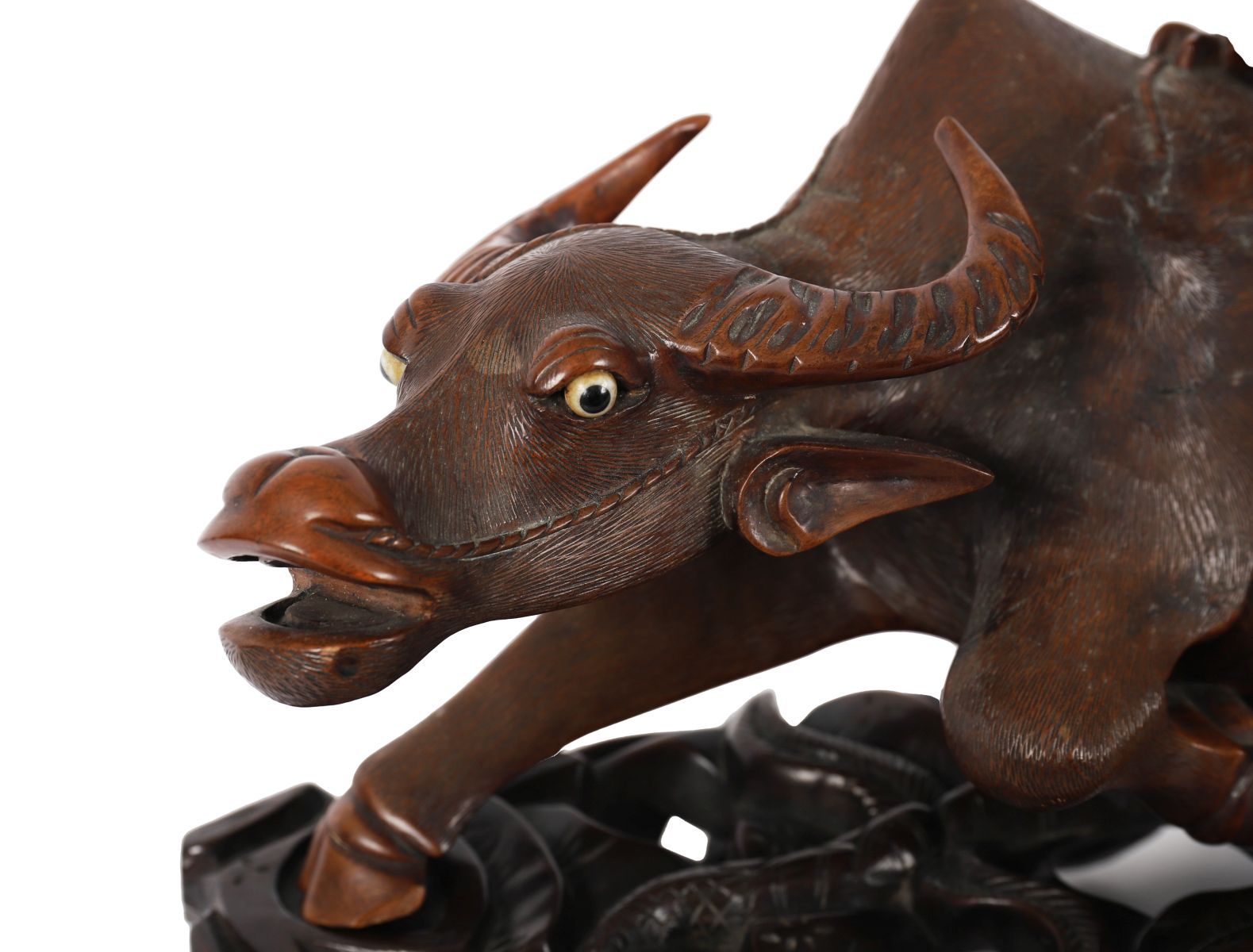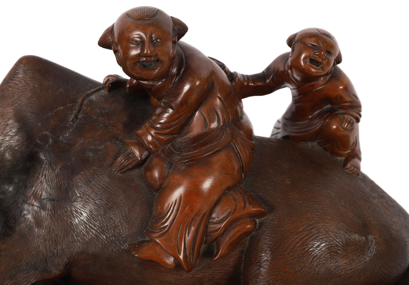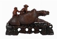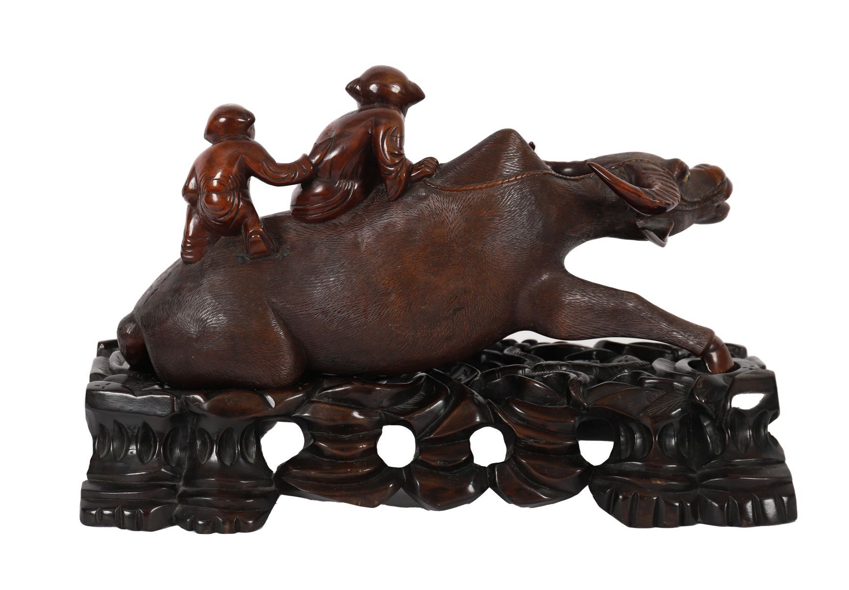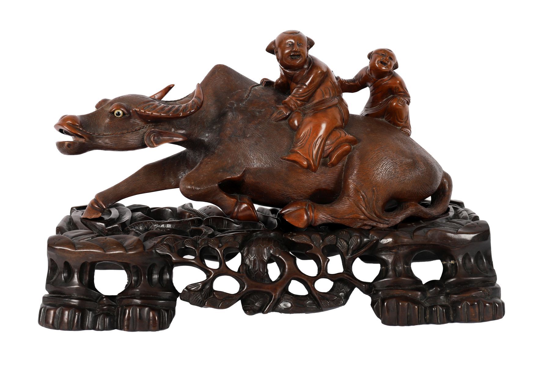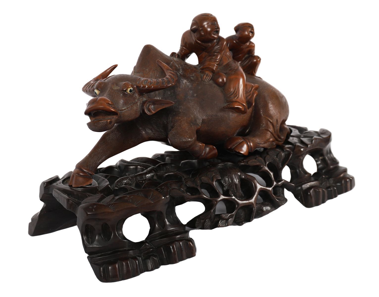 A Chinese Qing-period carved hardwood group depicting a water buffalo with young scholars seated and standing upon its back, raised on a pierced and carved base with foliage and rockwork. Chinese, 19th century.