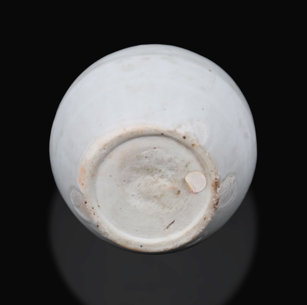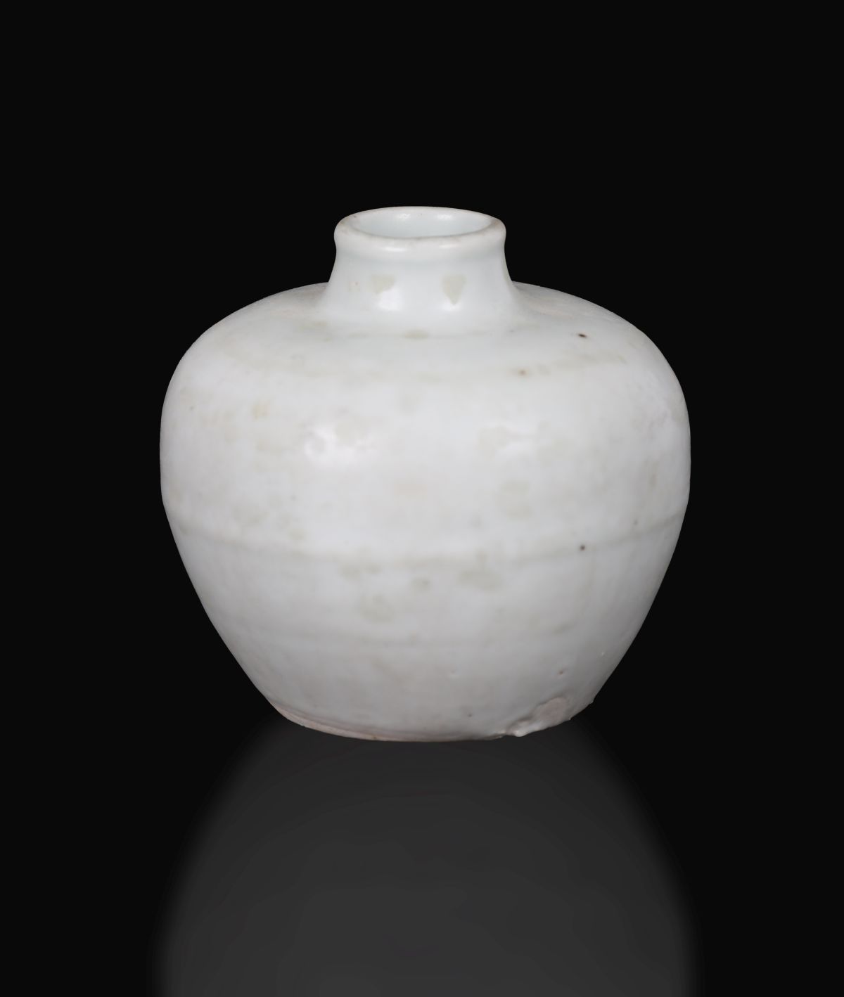 A small Qingbai glazed porcelain vase of globular form with short neck and everted rim, the translucent bluish-white glaze pooling in fine tones around the shoulders.