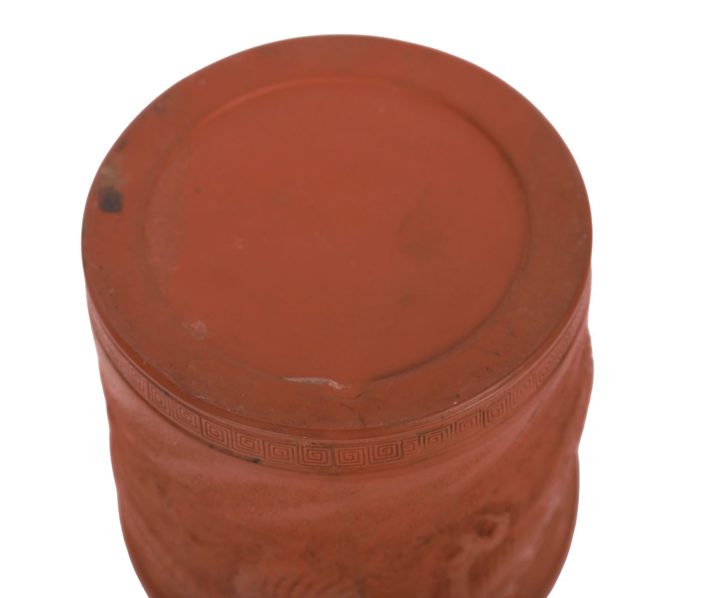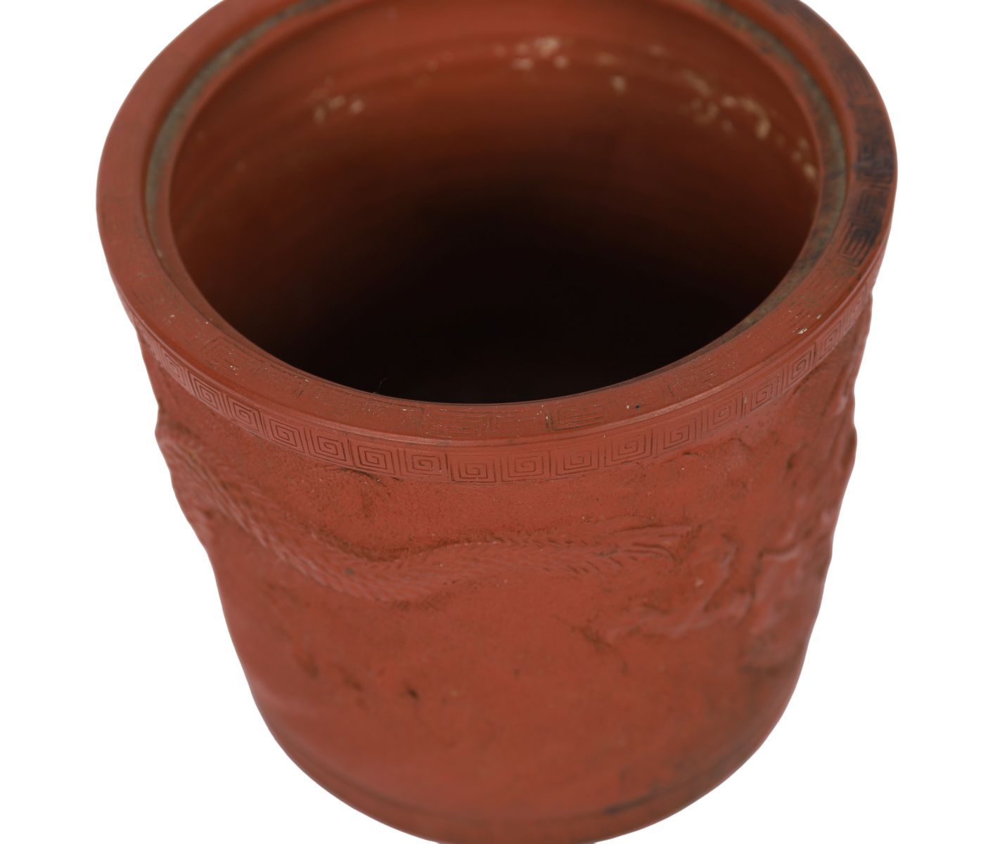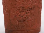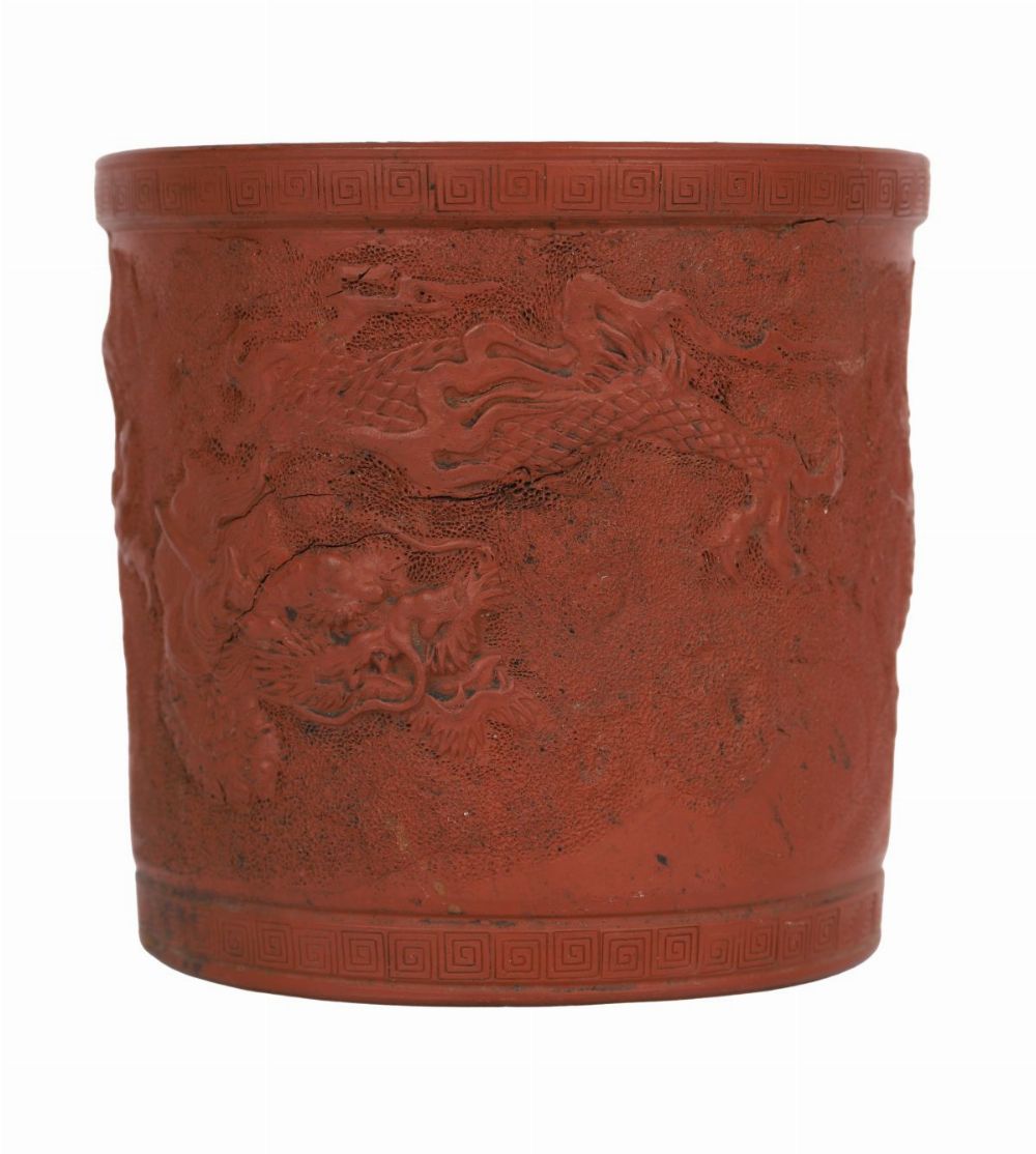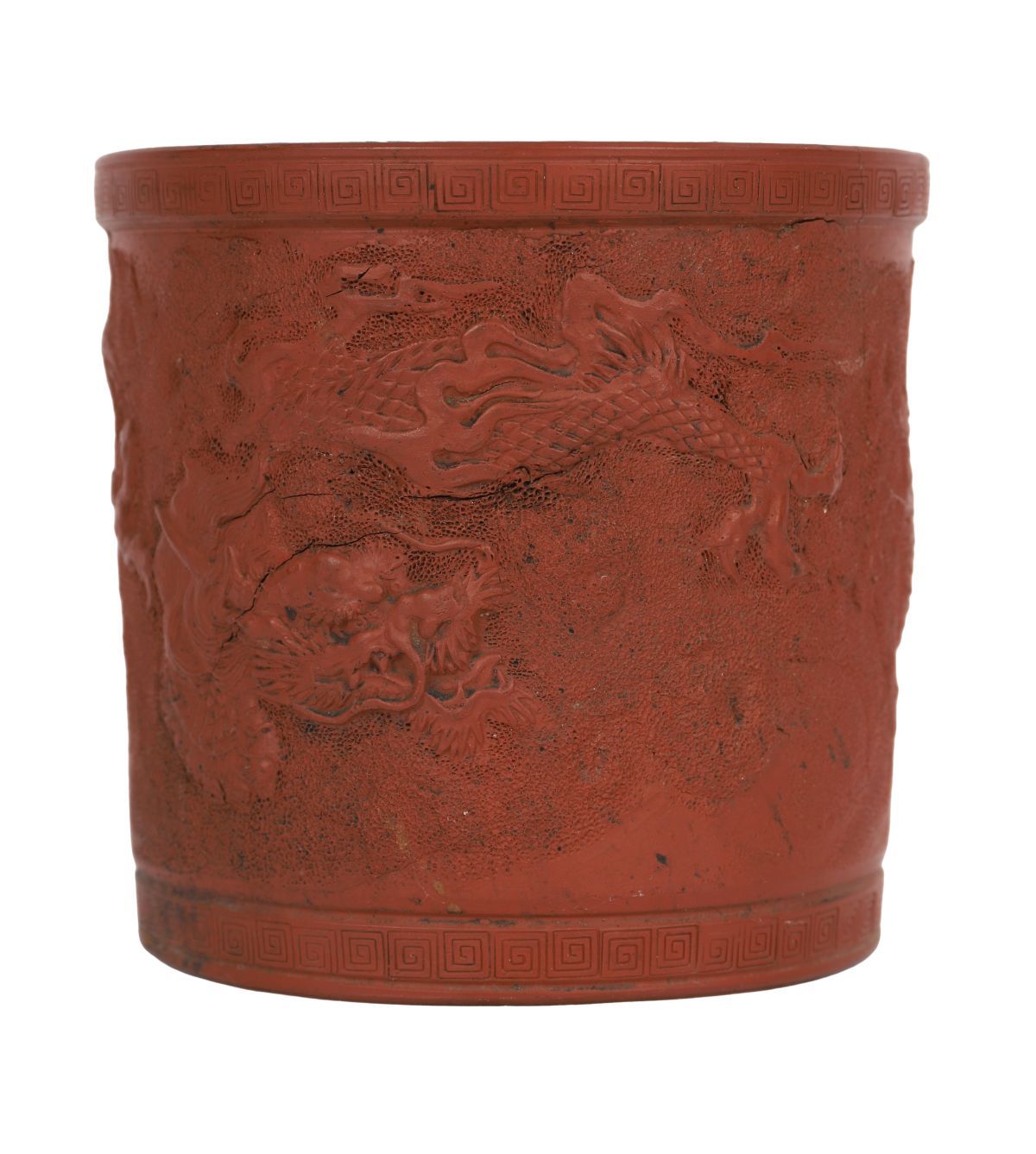 Possibly Yixing, late 19th – early 20th century. Cylindrical form decorated in relief with dragons among clouds, unglazed red-brown body.