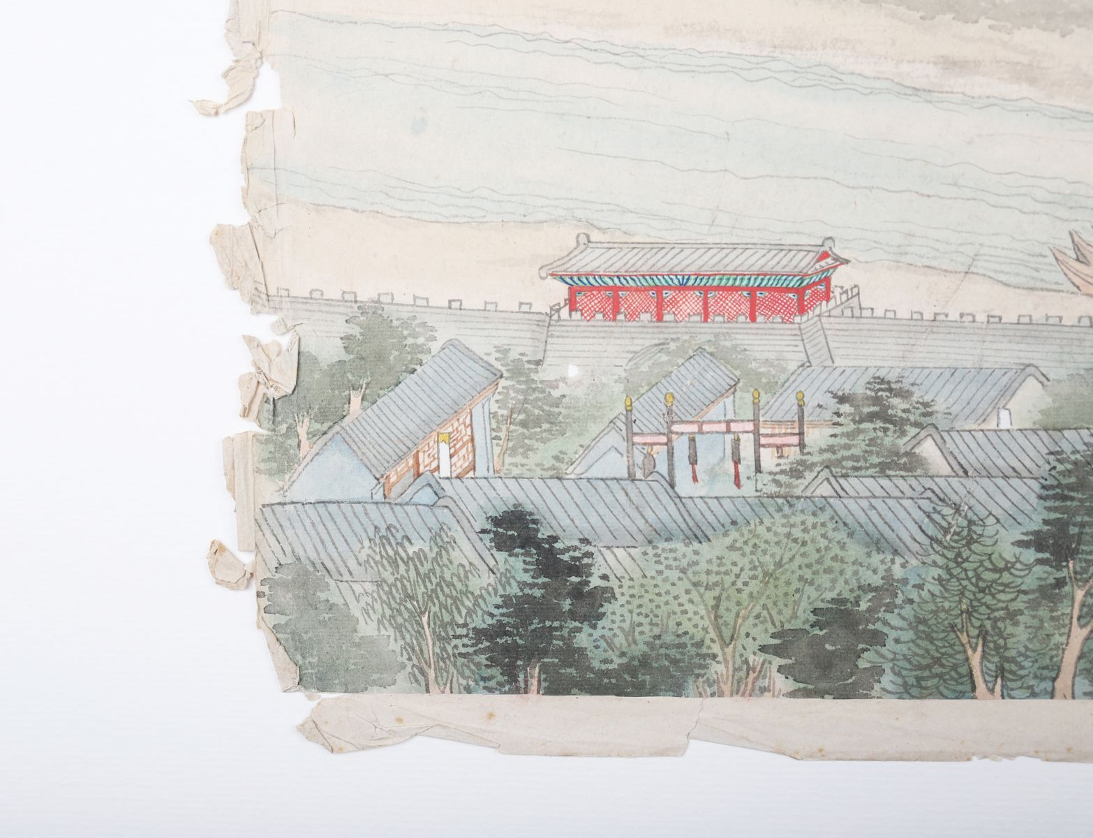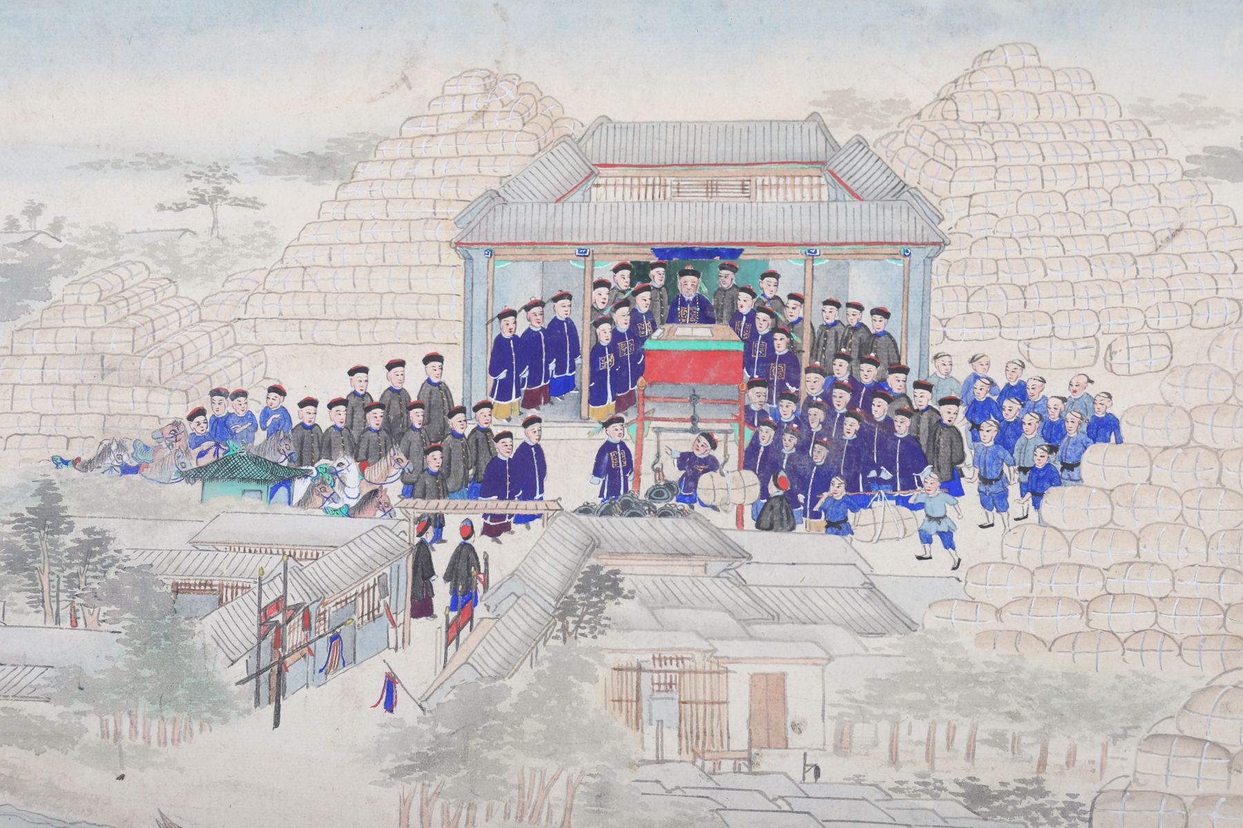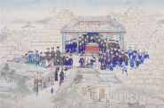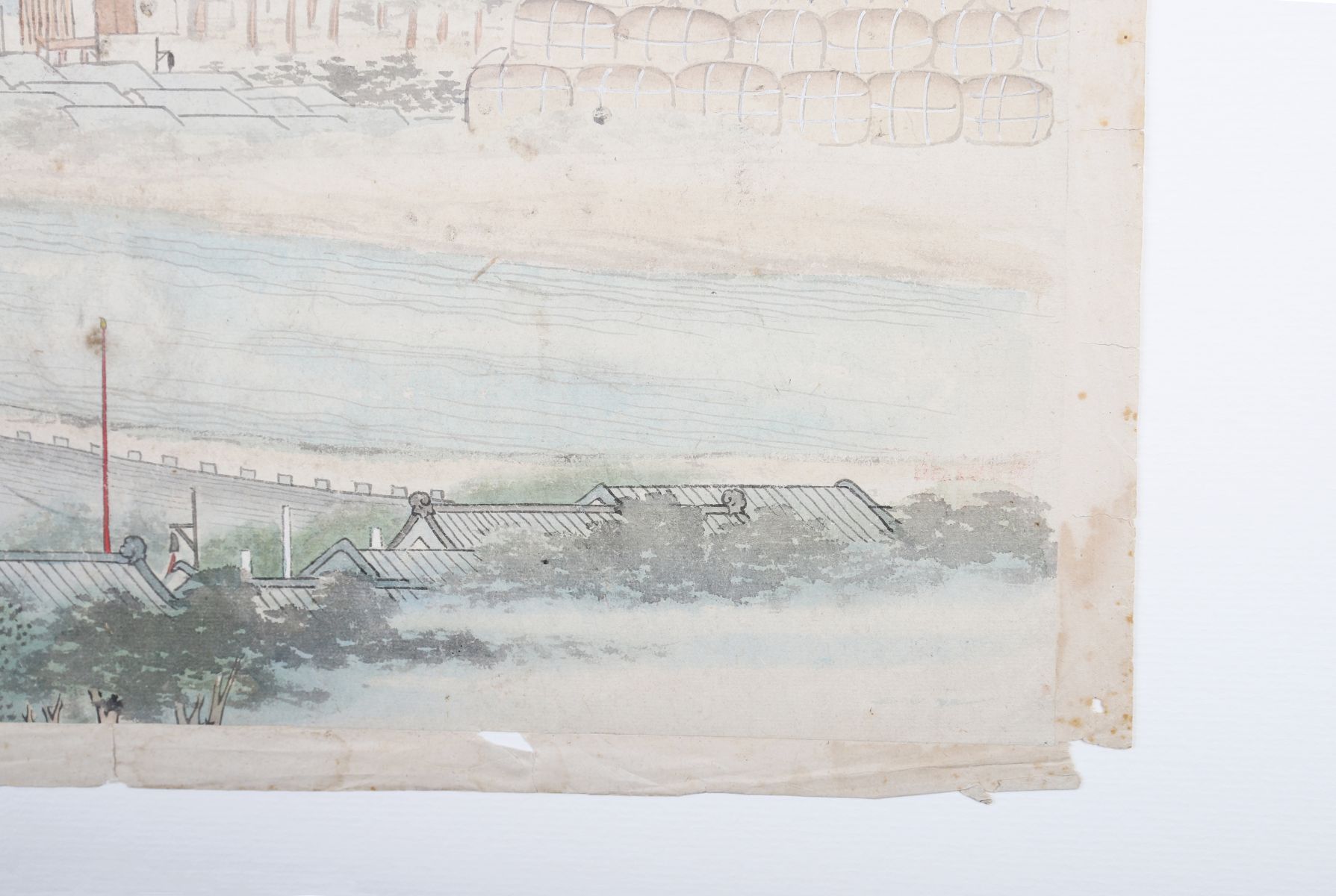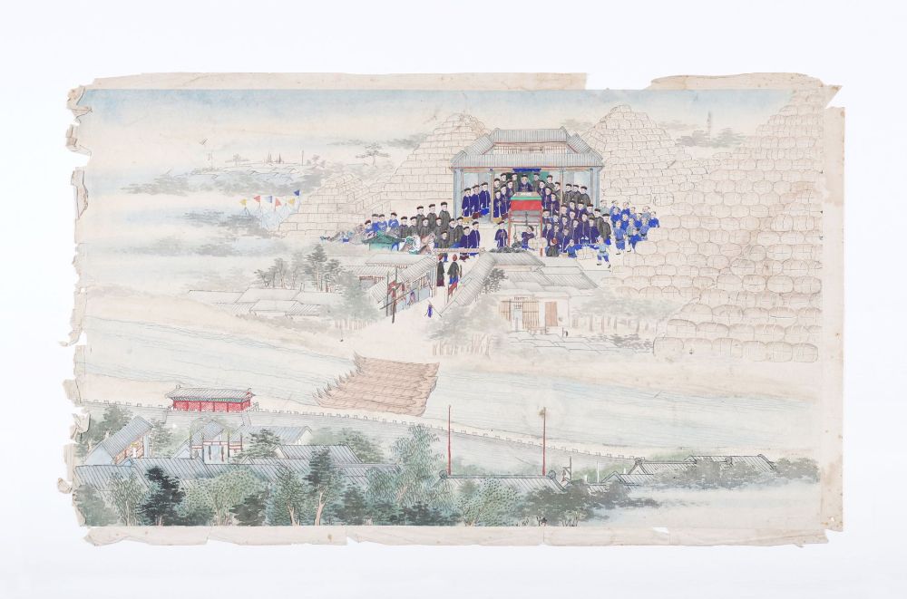 A Chinese gouache painting on paper depicting an extensive river landscape with figures assembled on a pavilion terrace overlooking the water. The detailed composition includes stone bridges, architectural structures, and distant wooded hills, rendered in muted tones with fine brushwork. The gathering of officials or attendants in formal dress suggests a ceremonial or diplomatic occasion. Mounted on backing paper, with edge wear and creasing consistent with age.