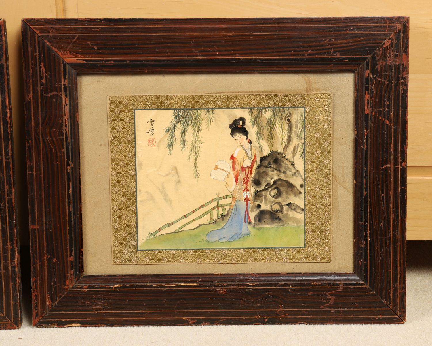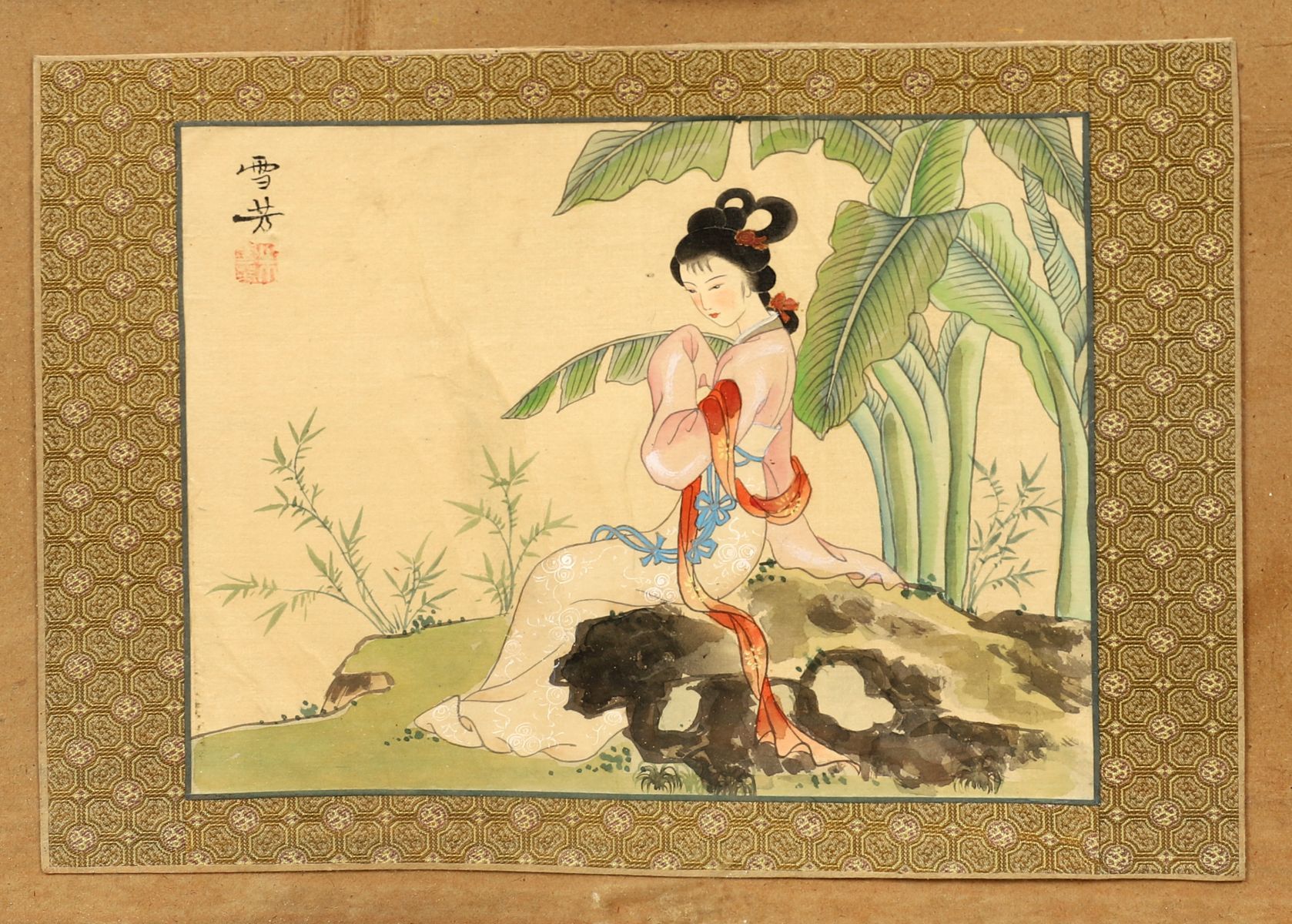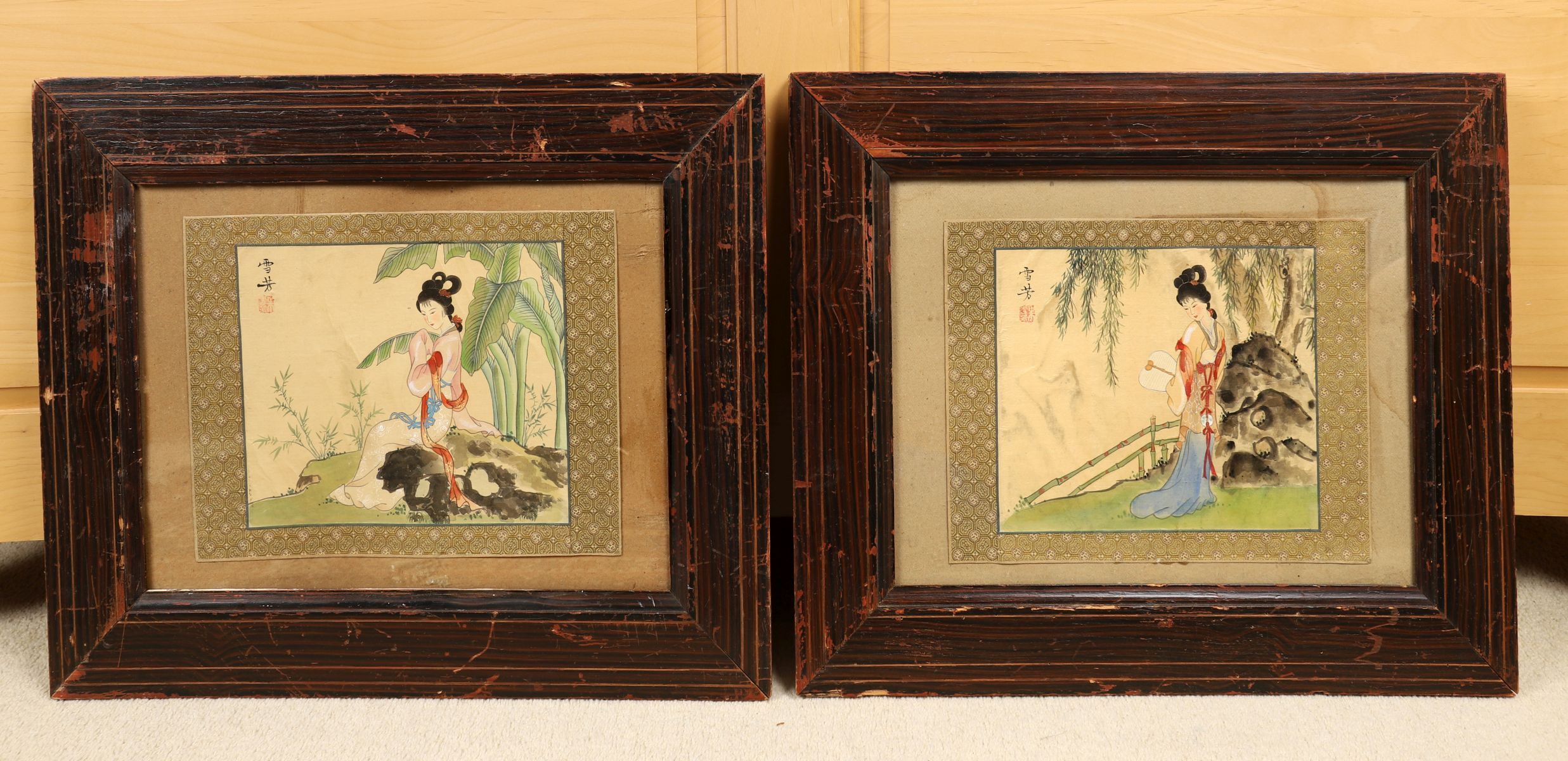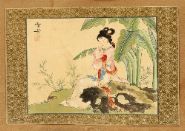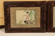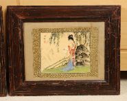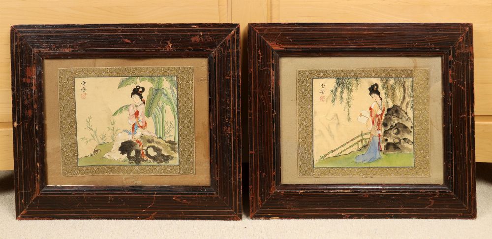Young woman in a landscape; Young woman in a landscape. Each a watercolour on silk. Framed.