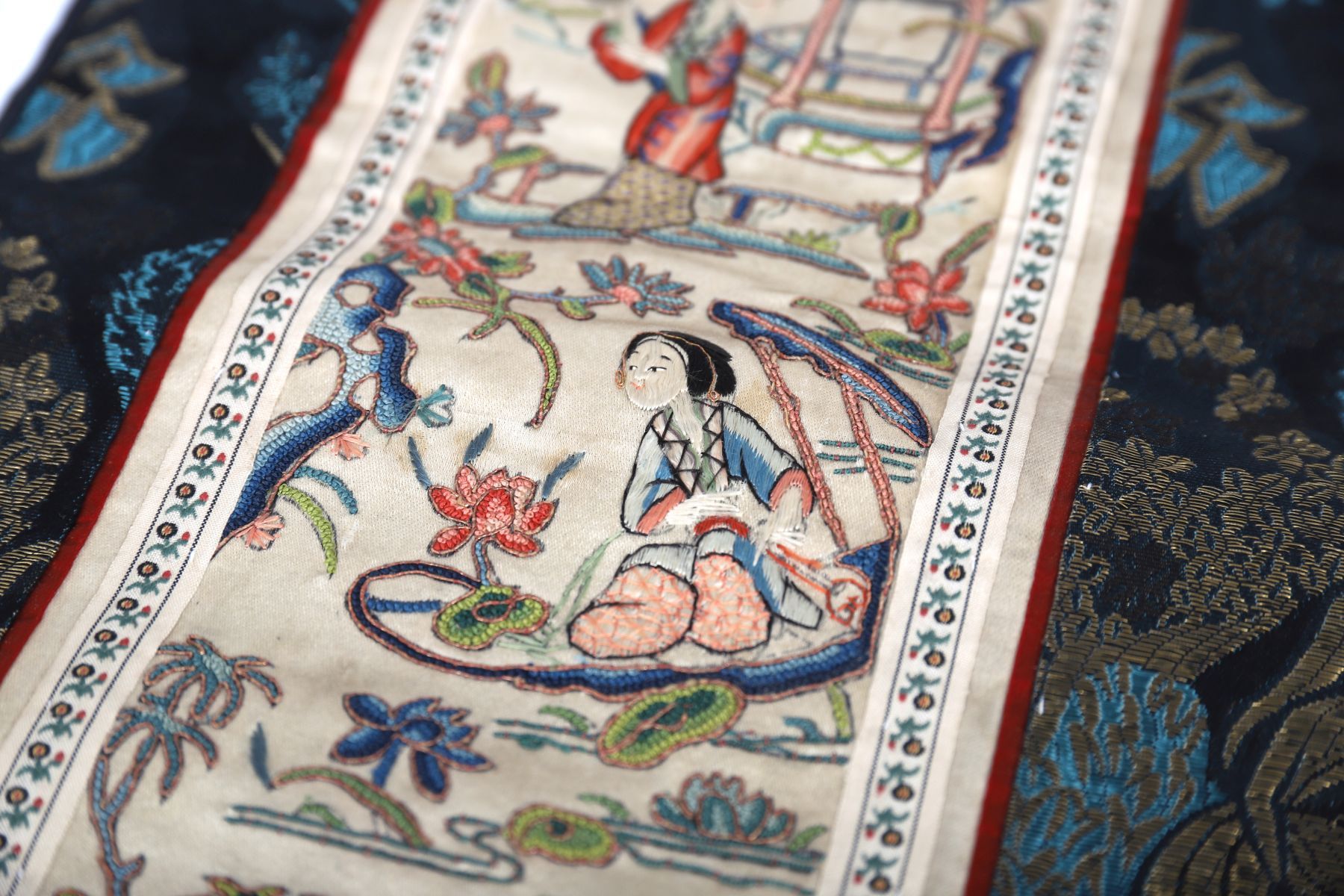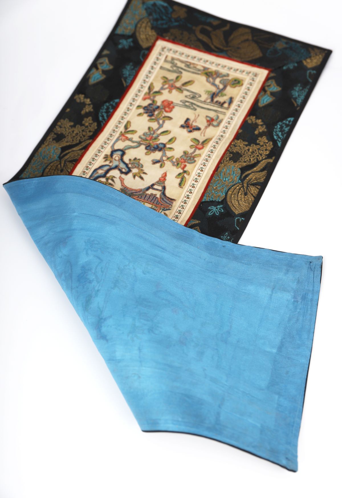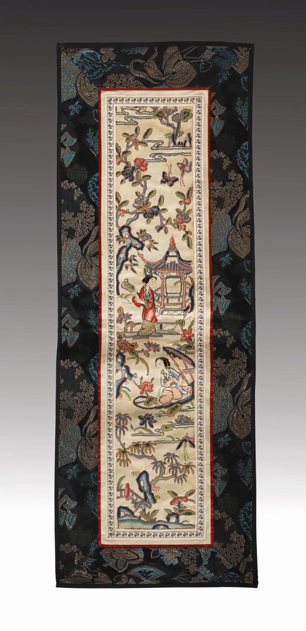 A finely worked Chinese silk embroidery panel, depicting a lady and attendant in a garden sitting beside a pavilion, surrounded by flowering trees, birds, and butterflies. Executed in satin and couching stitches in shades of blue, green, red, and gold on an ivory silk ground, with a later black silk brocade border woven with floral motifs.