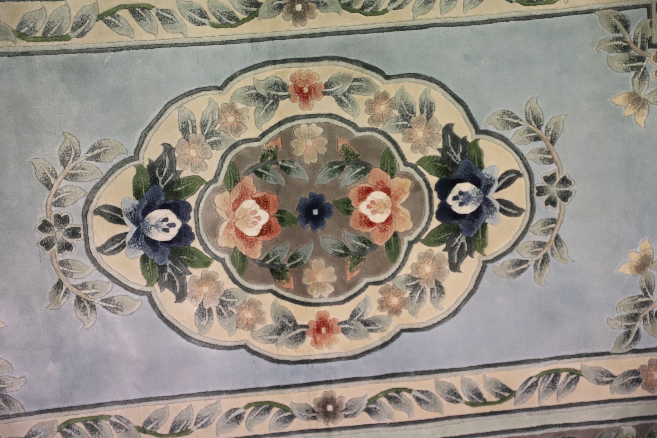 A fine Chinese silk rug of rectangular form, the soft turquoise ground centred by an oval medallion of stylised blossoms in shades of rose, ivory, and indigo. The border richly decorated with trailing foliage and bold flowerheads, framed by multiple guard stripes. The rug is finished with knotted fringes at each end.