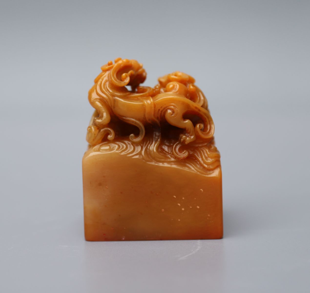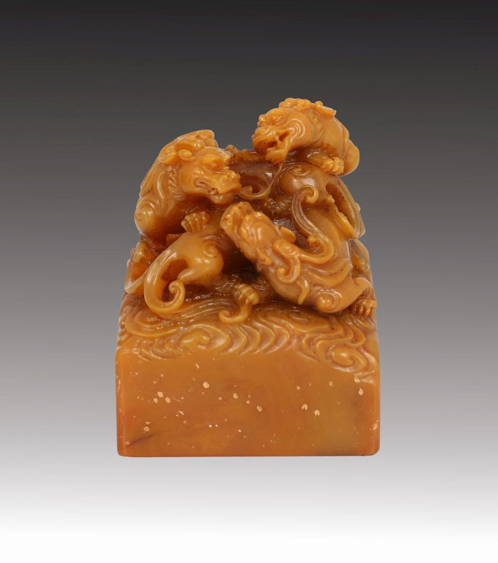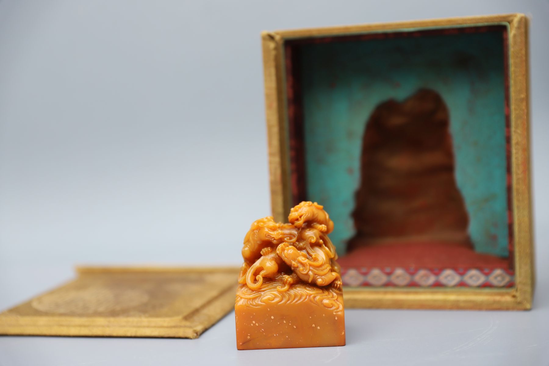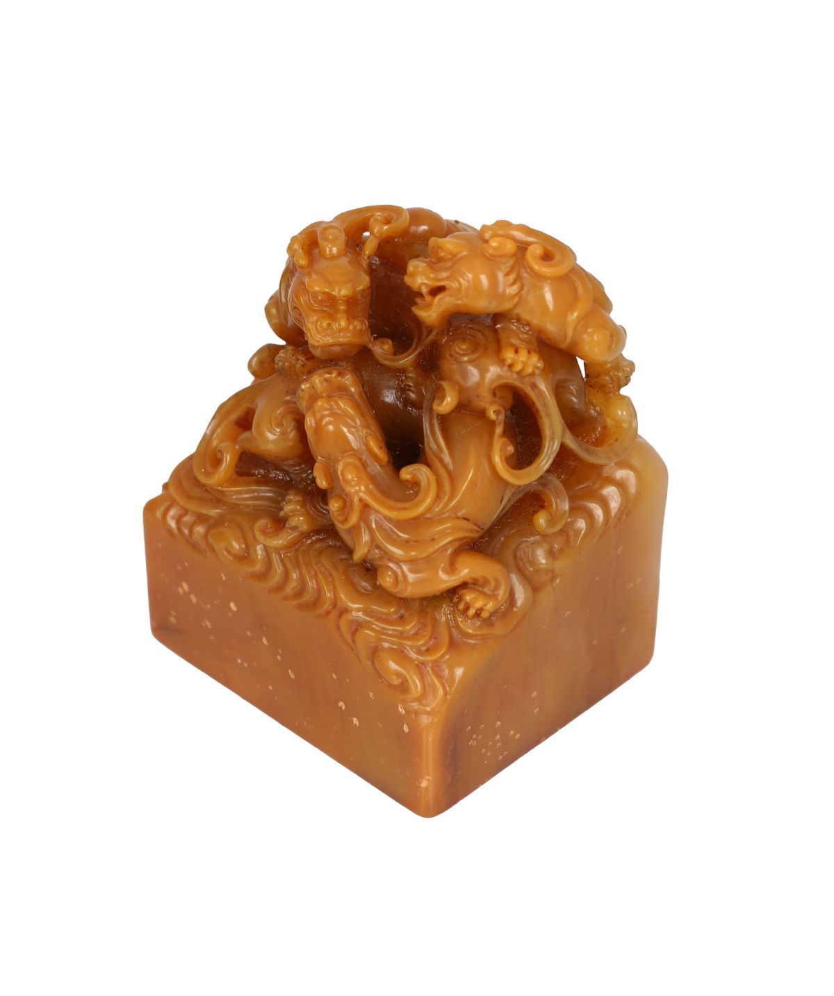 A finely carved Chinese soapstone seal of square form, surmounted by a group of entwined chilong dragons in high relief above a wave-carved plinth. The base deeply incised with archaic-style seal script, retaining traces of red cinnabar paste. The warm ochre stone exhibits natural veining and mottling characteristic of soapstone. Housed within a fitted silk-lined case.