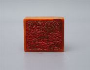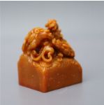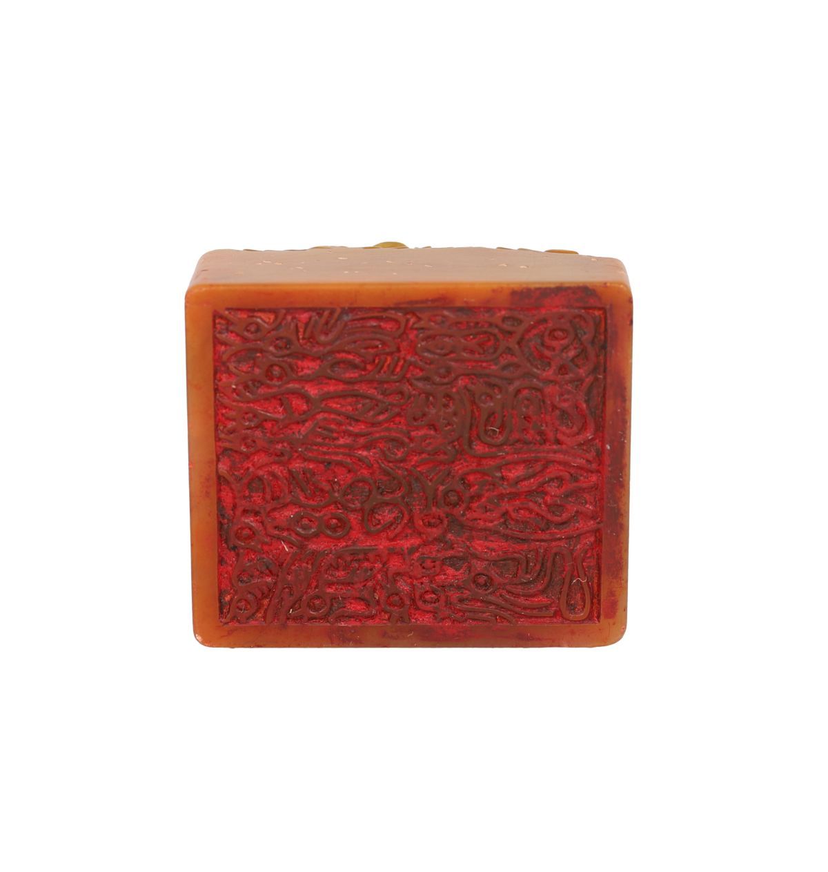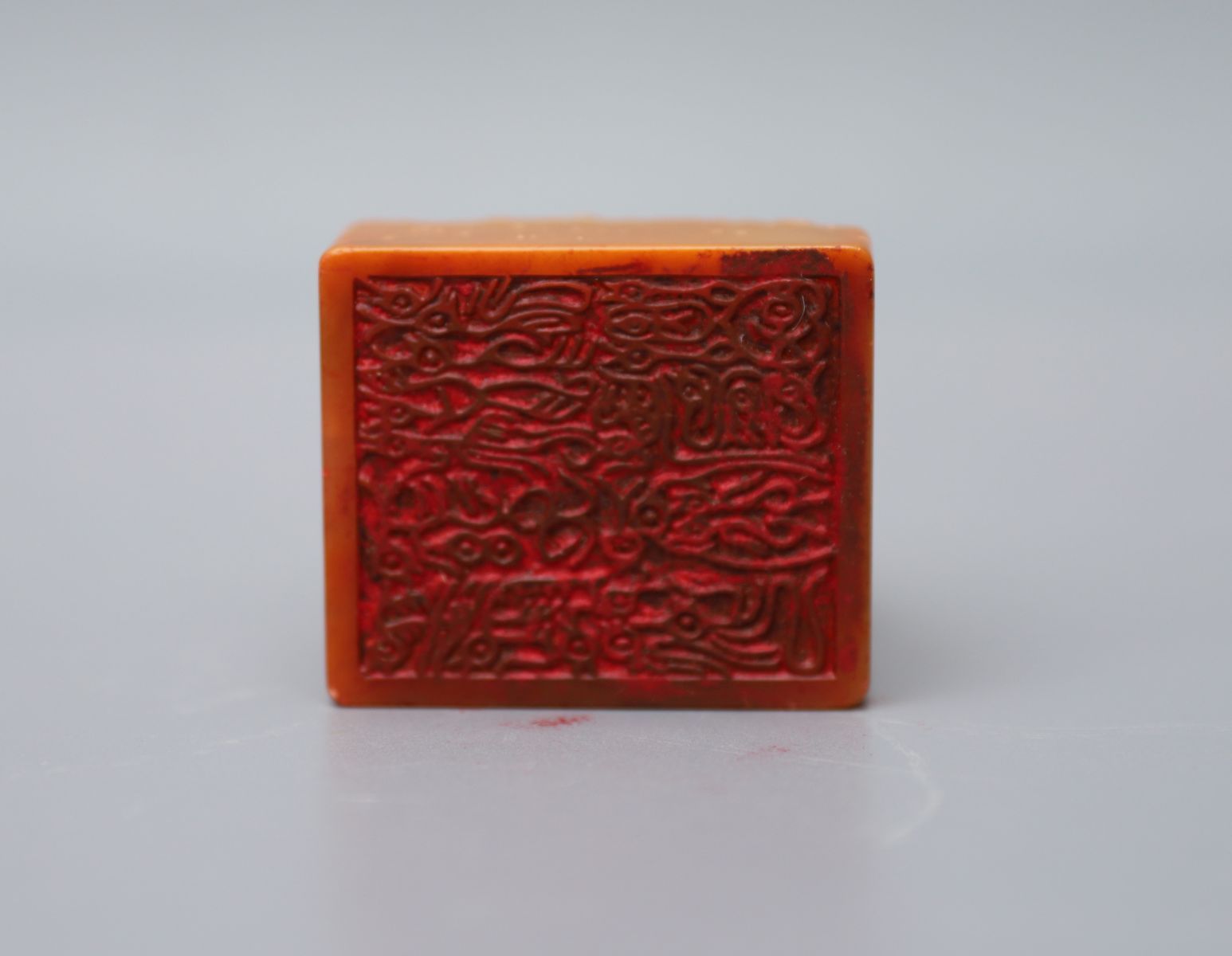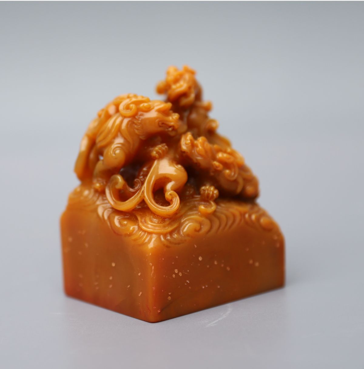 A finely carved Chinese soapstone seal of square form, surmounted by a group of entwined chilong dragons in high relief above a wave-carved plinth. The base deeply incised with archaic-style seal script, retaining traces of red cinnabar paste. The warm ochre stone exhibits natural veining and mottling characteristic of soapstone. Housed within a fitted silk-lined case.