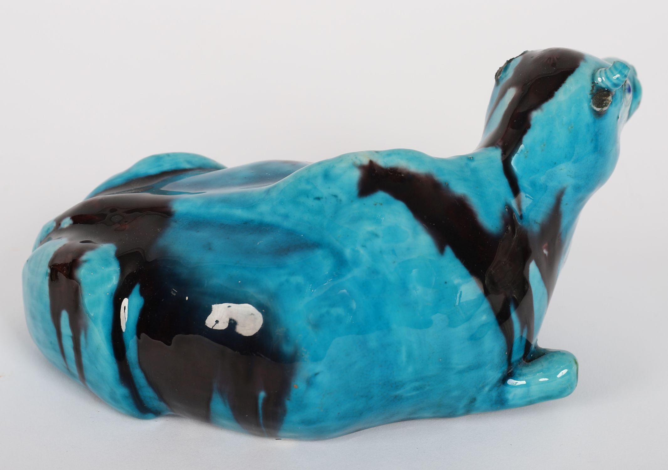 A Chinese pottery figure of a reclining water buffalo, glazed in turquoise and aubergine tones.