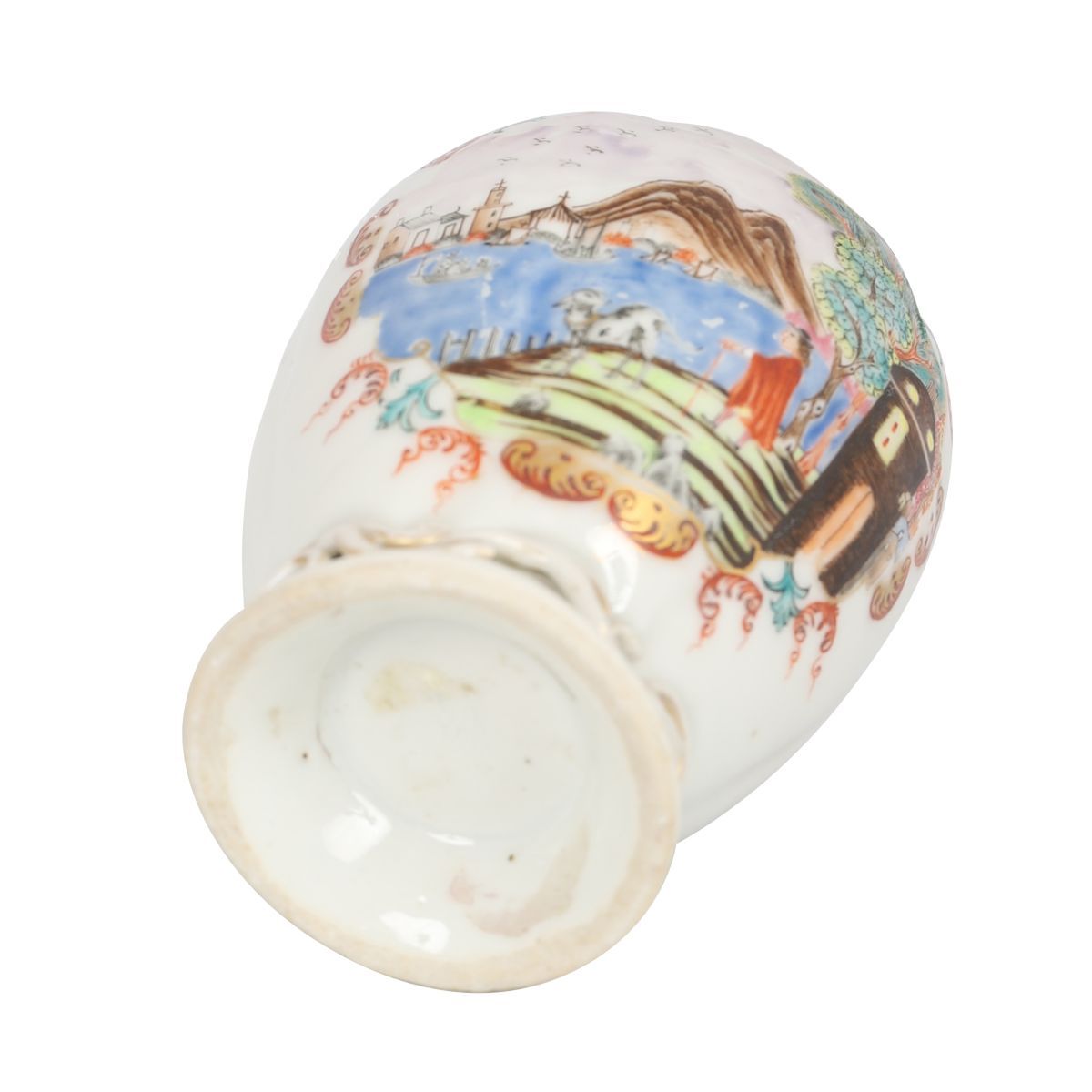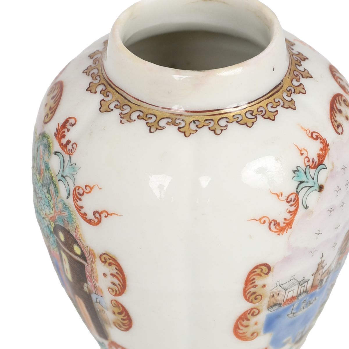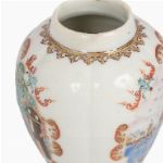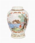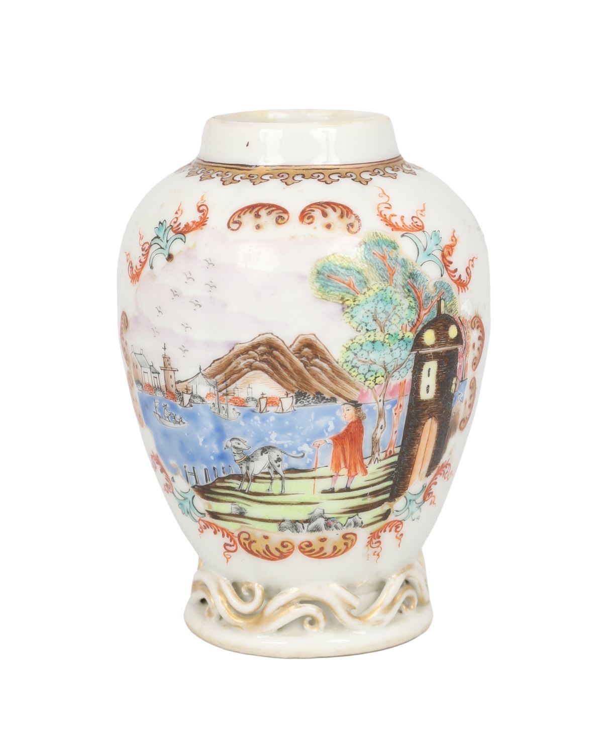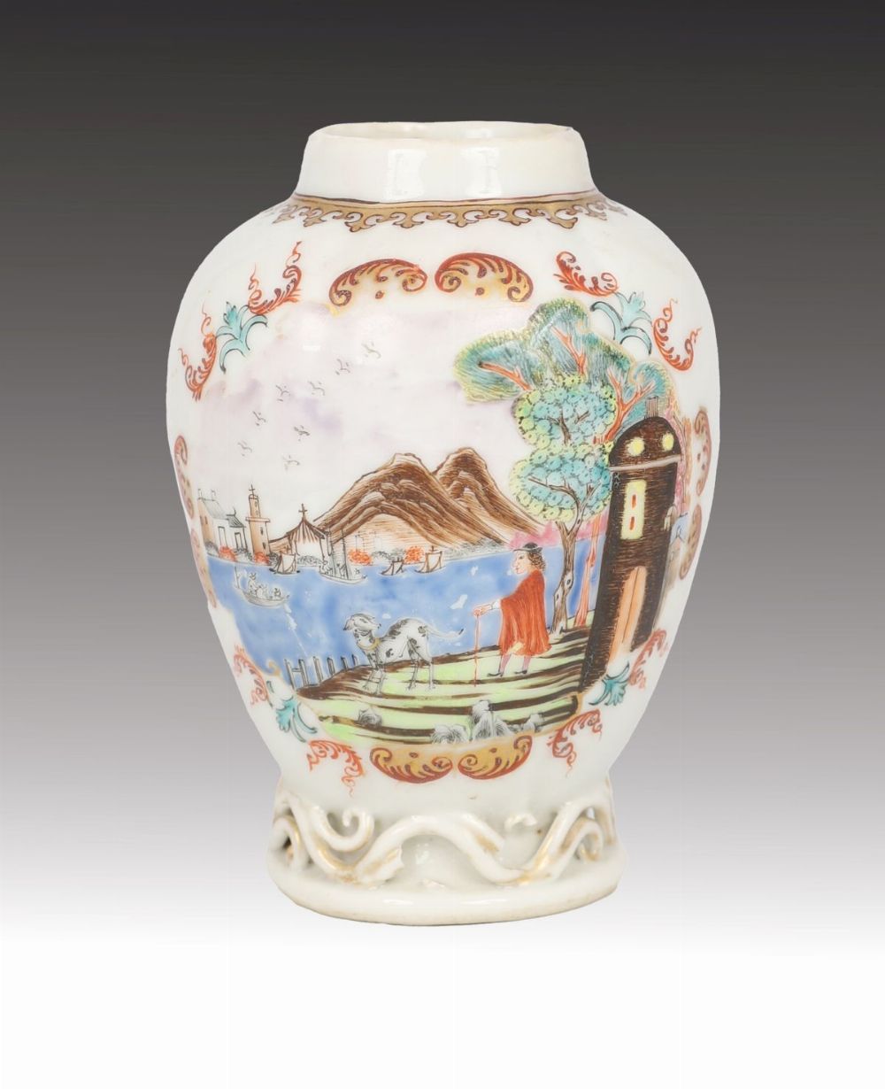 with polychrome overglaze panels, depicting a Dutch port scene.