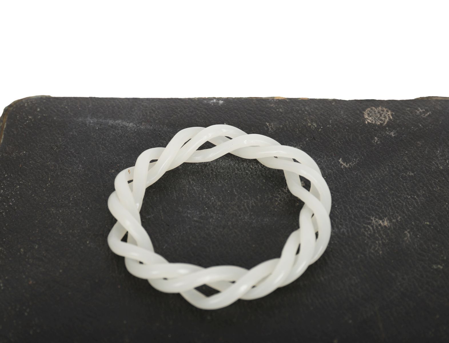 A Chinese white hardstone bangle of twisted rope design, finely polished and of even tone, likely jade or jadeite.