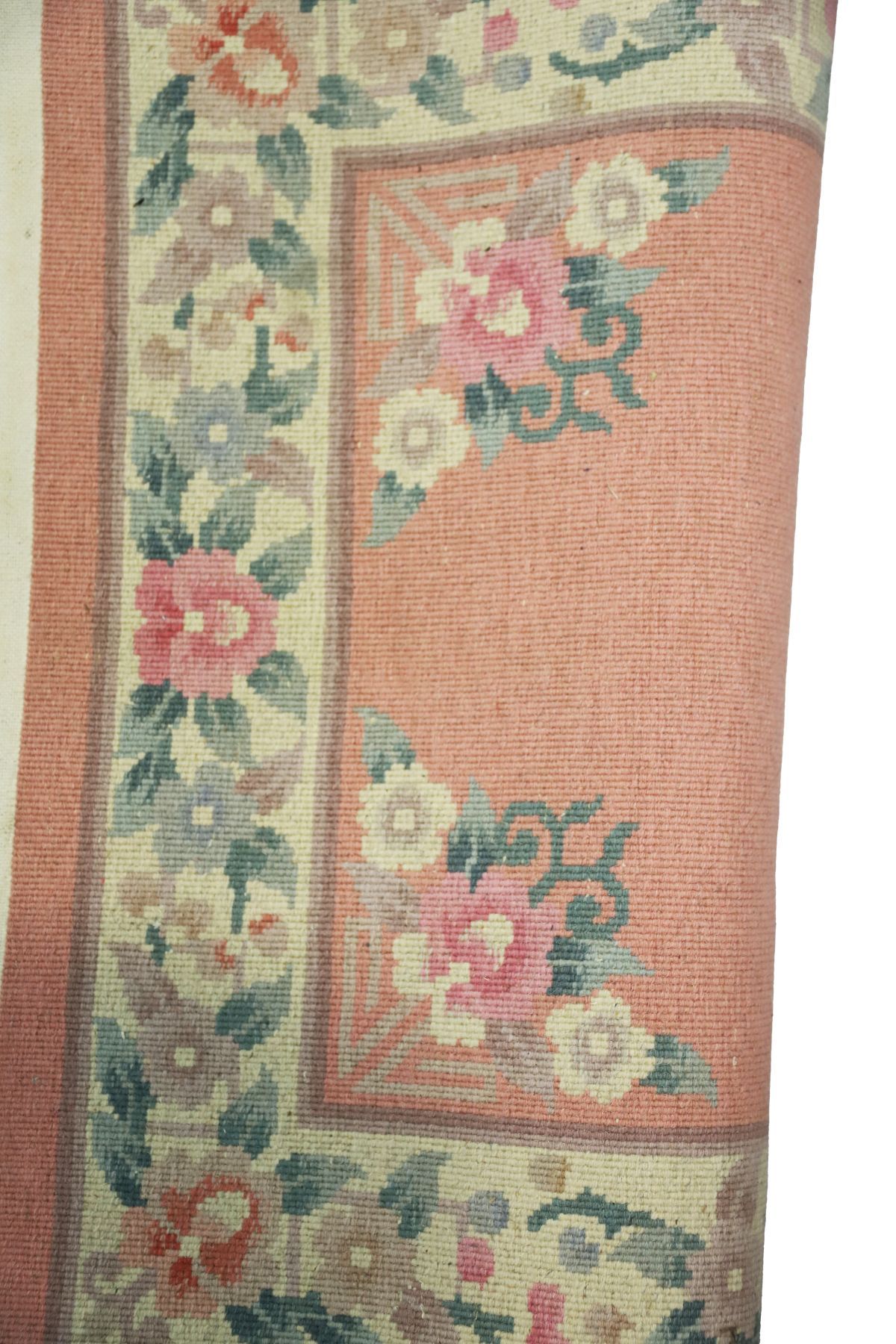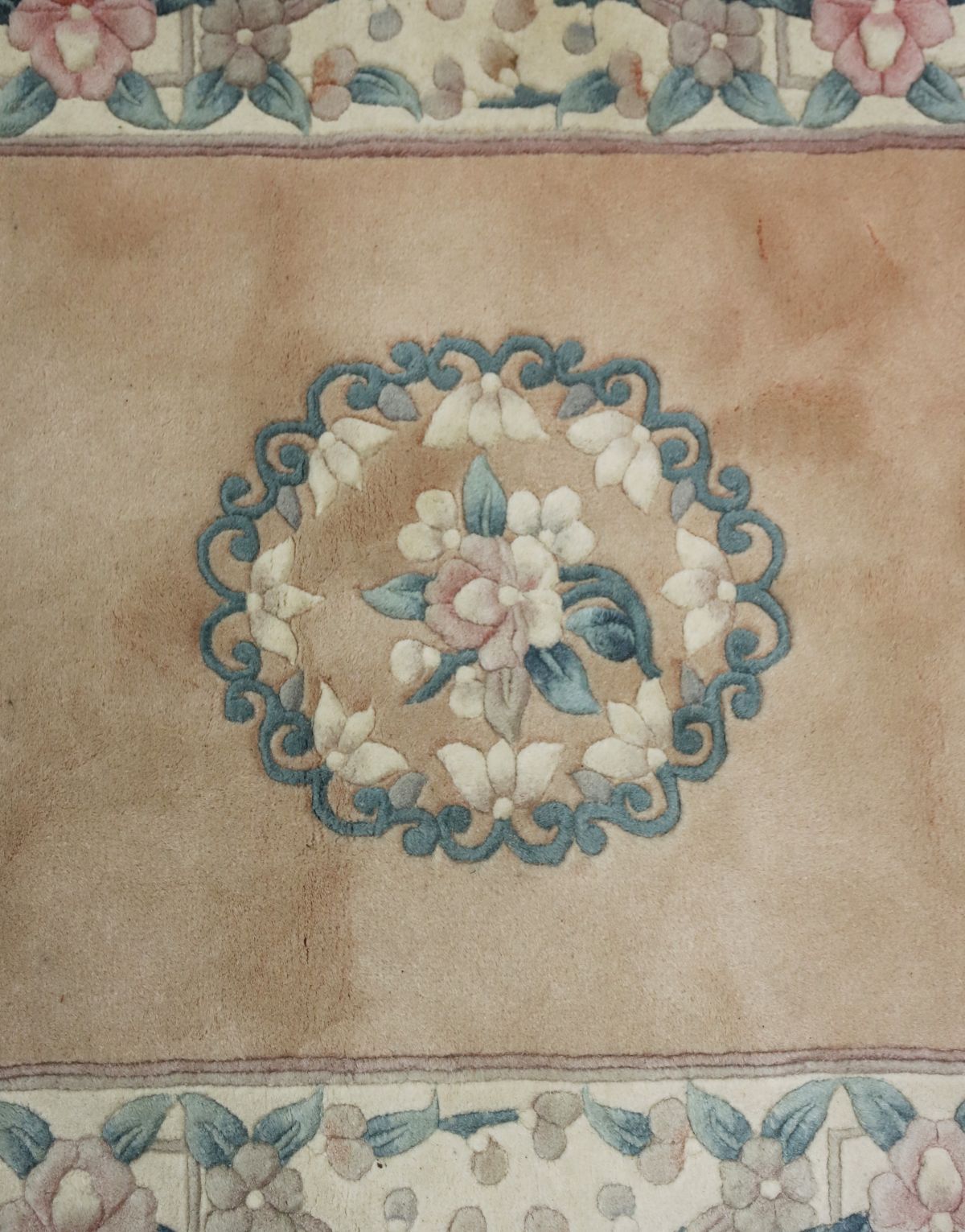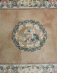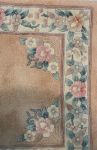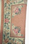 Salmon ground with central floral cartouche enclosed by spandrels and outer border.
