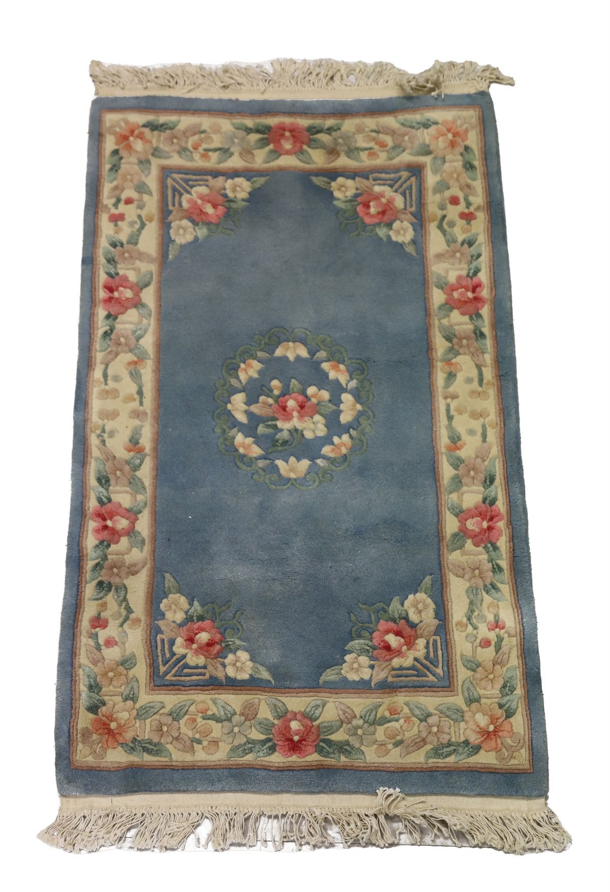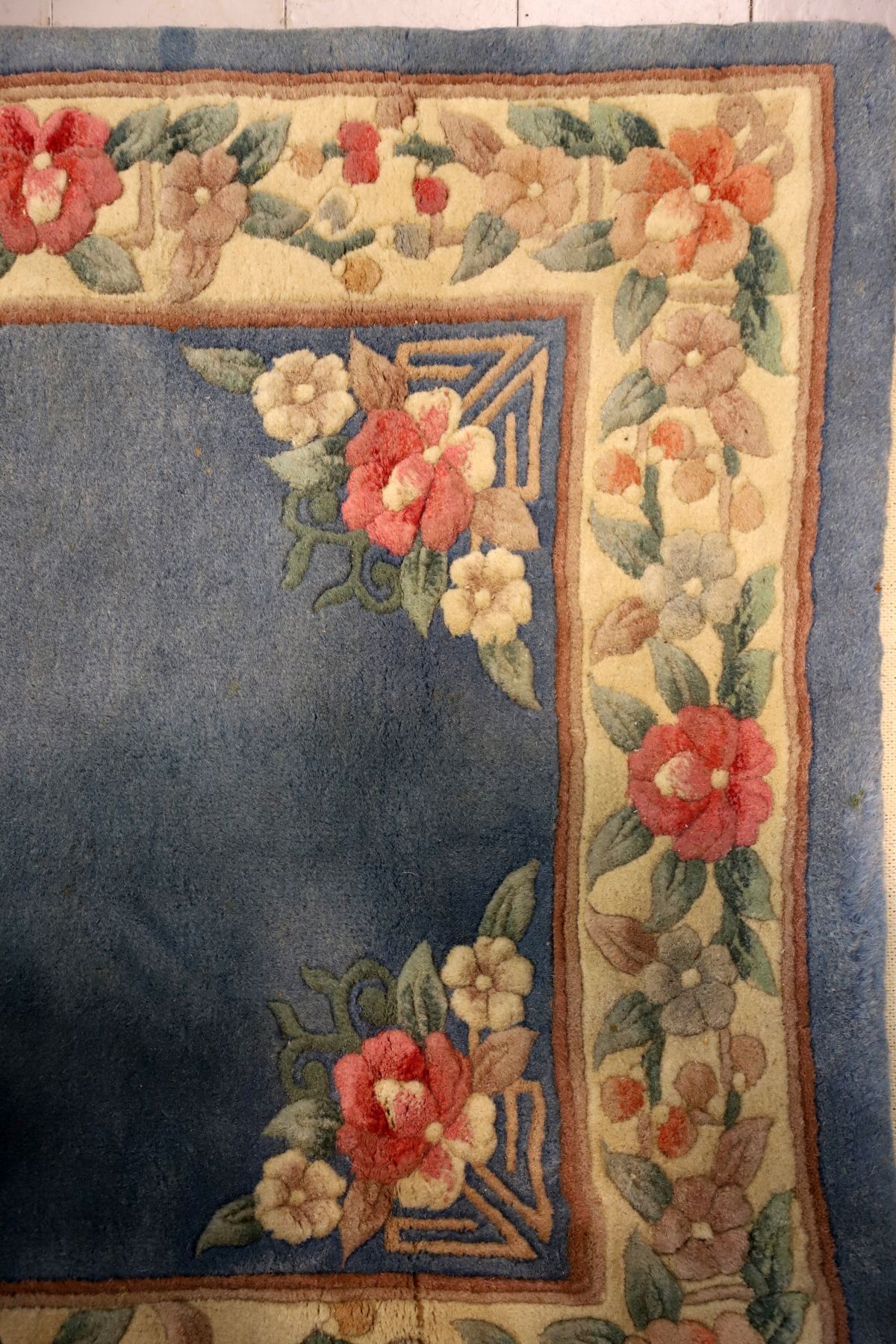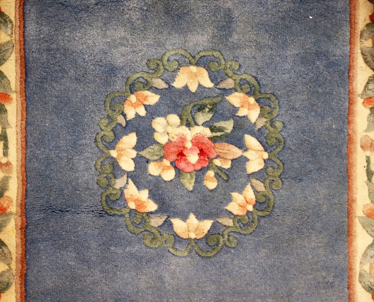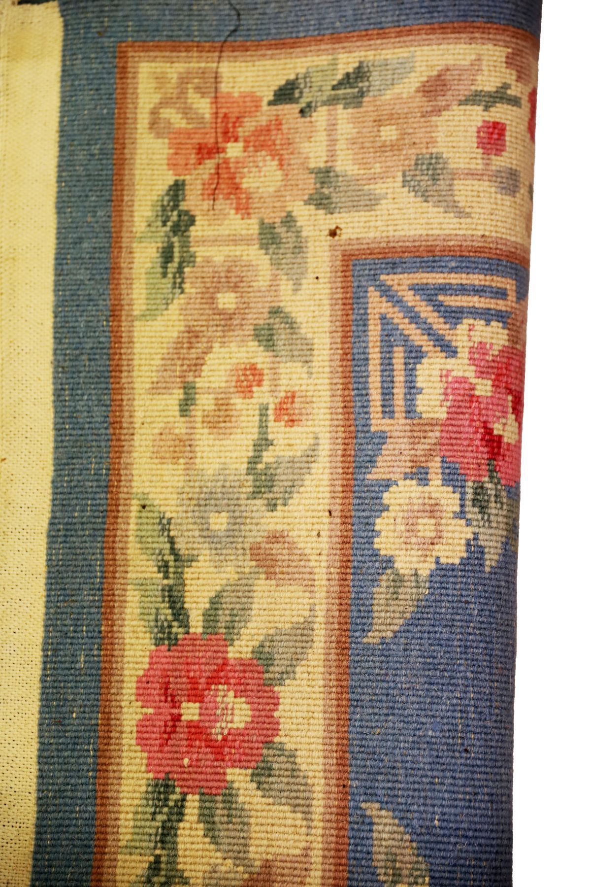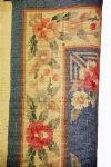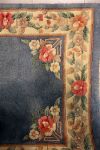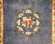 blue ground with central floral cartouche enclosed by spandrels and outer border.