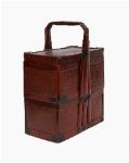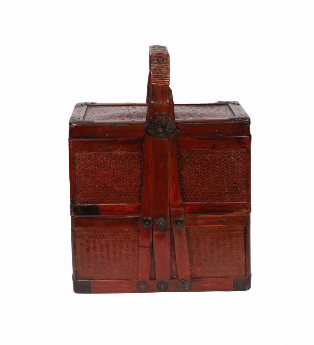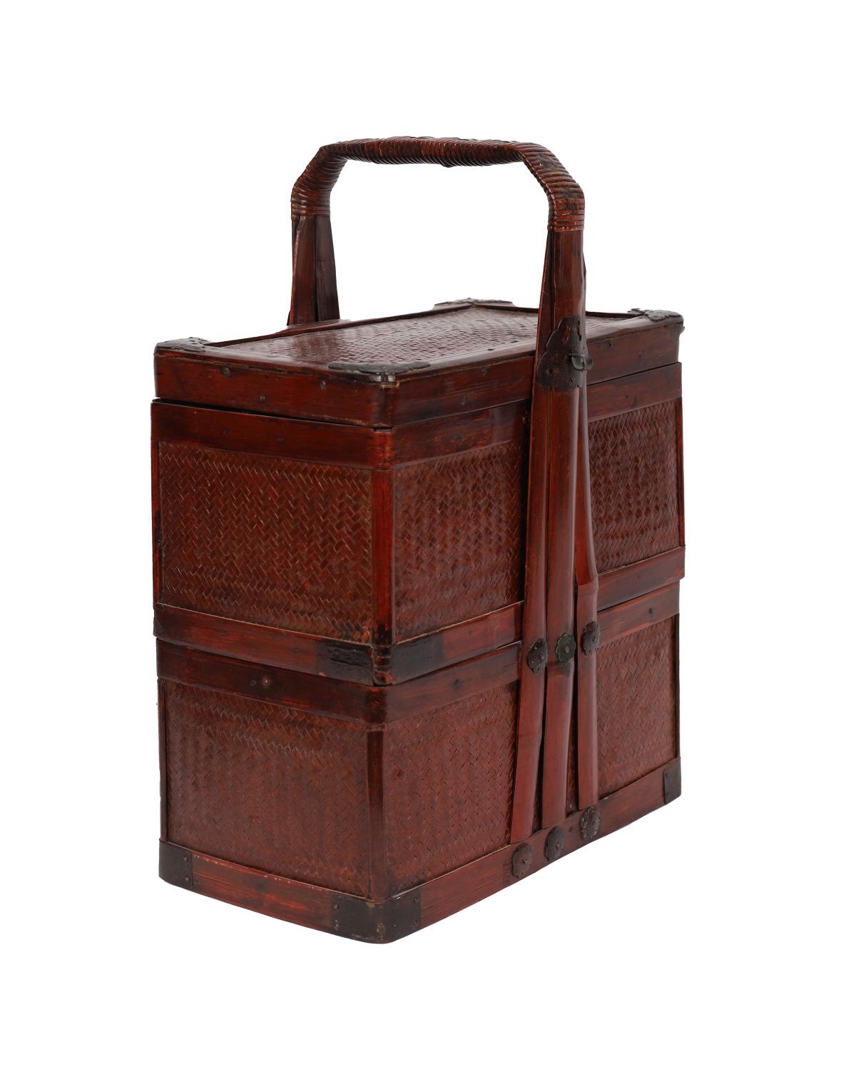 A Chinese two-tier woven rattan wedding basket with hinged carrying handle and metal clasp, of rectangular form with latticework panels and patinated finish.