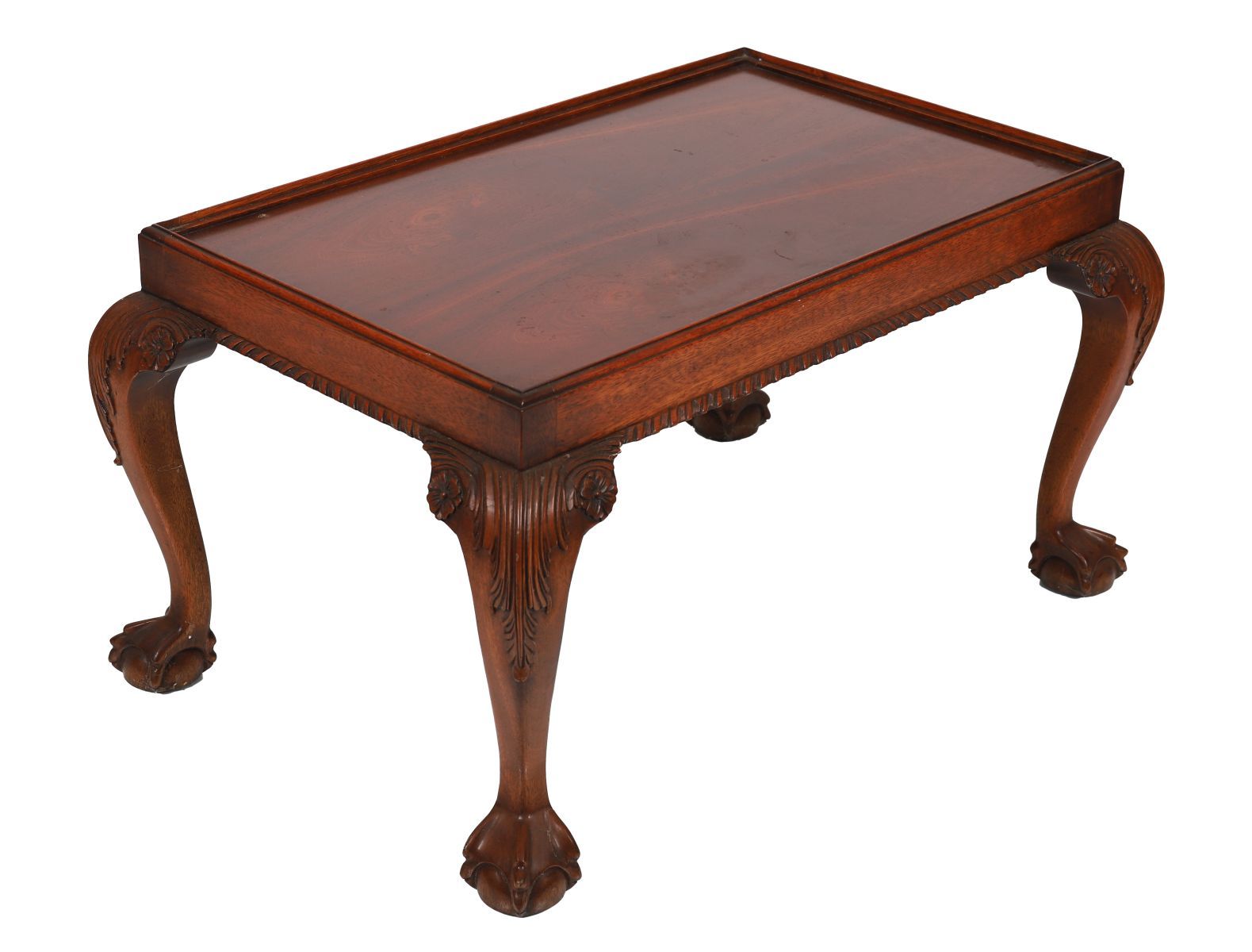 Early 20th century. A Chippendale revival mahogany coffee table, rectangular top with moulded edge above a gadrooned apron, raised on cabriole legs with acanthus carving and ball-and-claw feet.