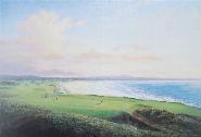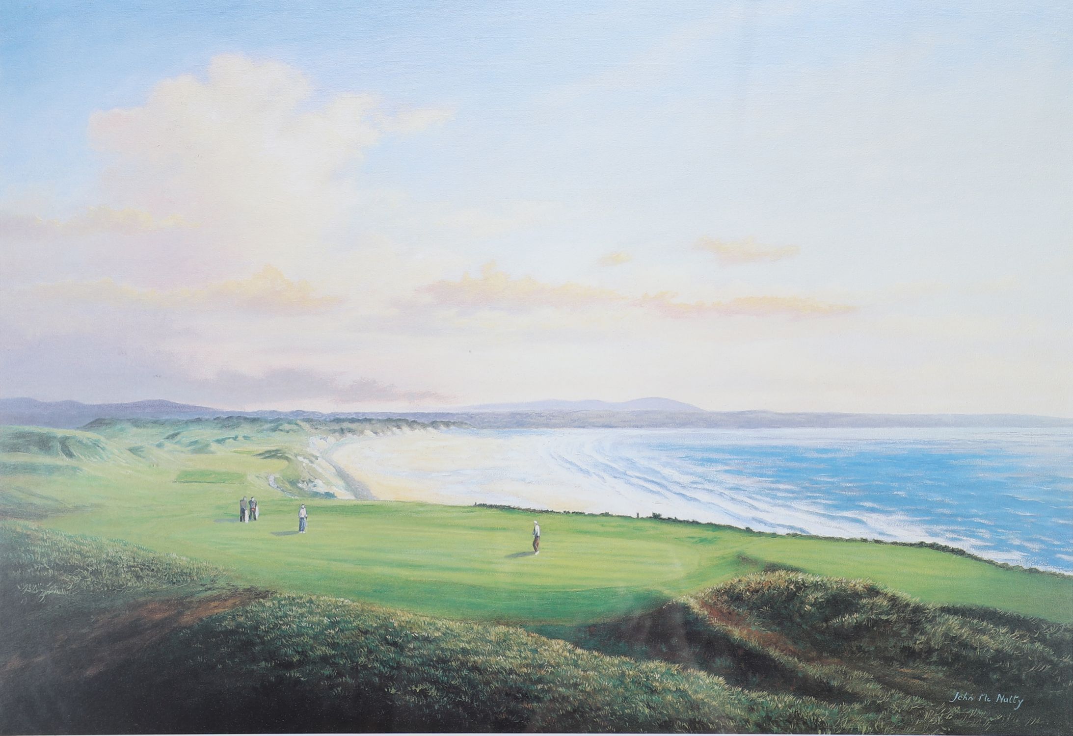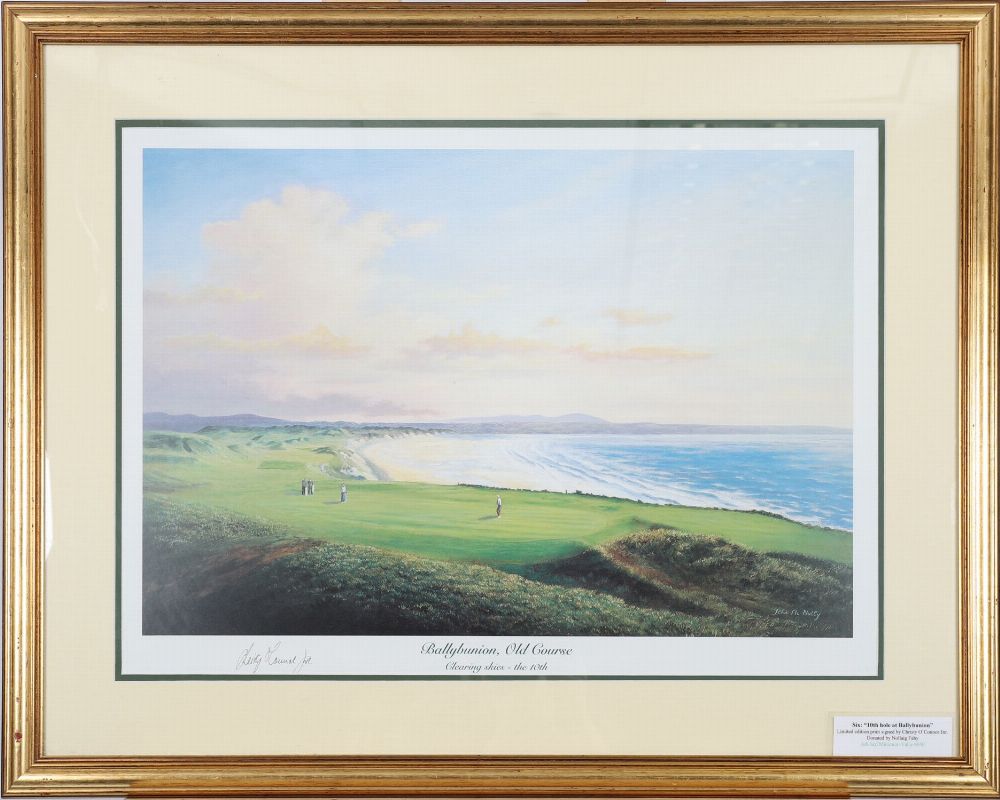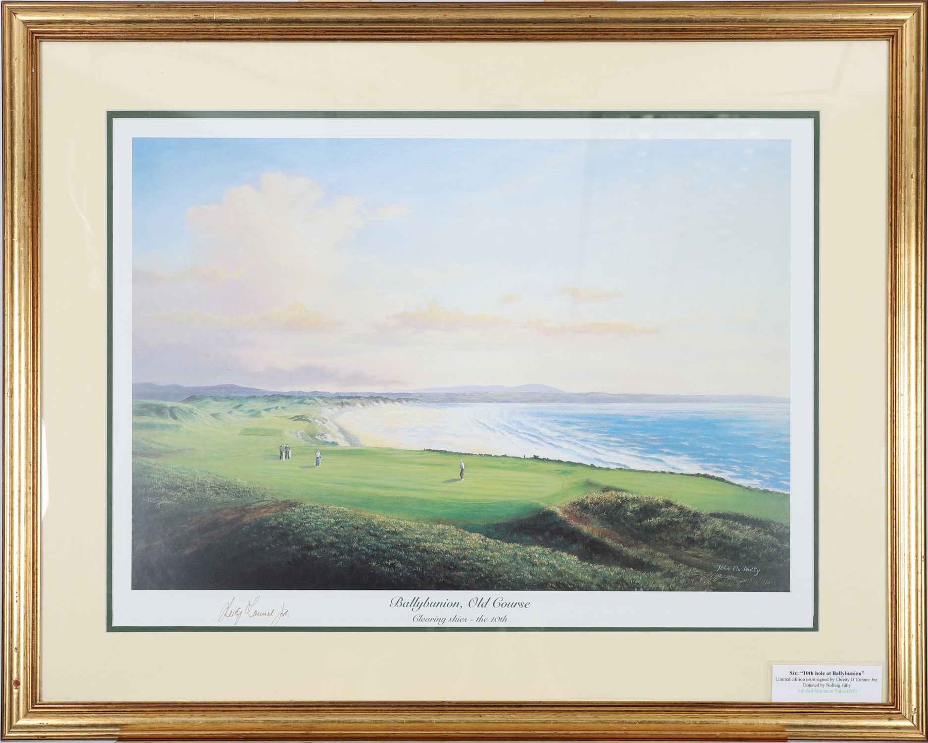 Limited edition print of the renowned Ballybunion Golf Club's Old Course, depicting the dramatic coastal 10th hole under brightening skies. Signed in pencil by the artist/golfer Christy O'Connor Jnr and by the painter John McNulty, mounted and framed.