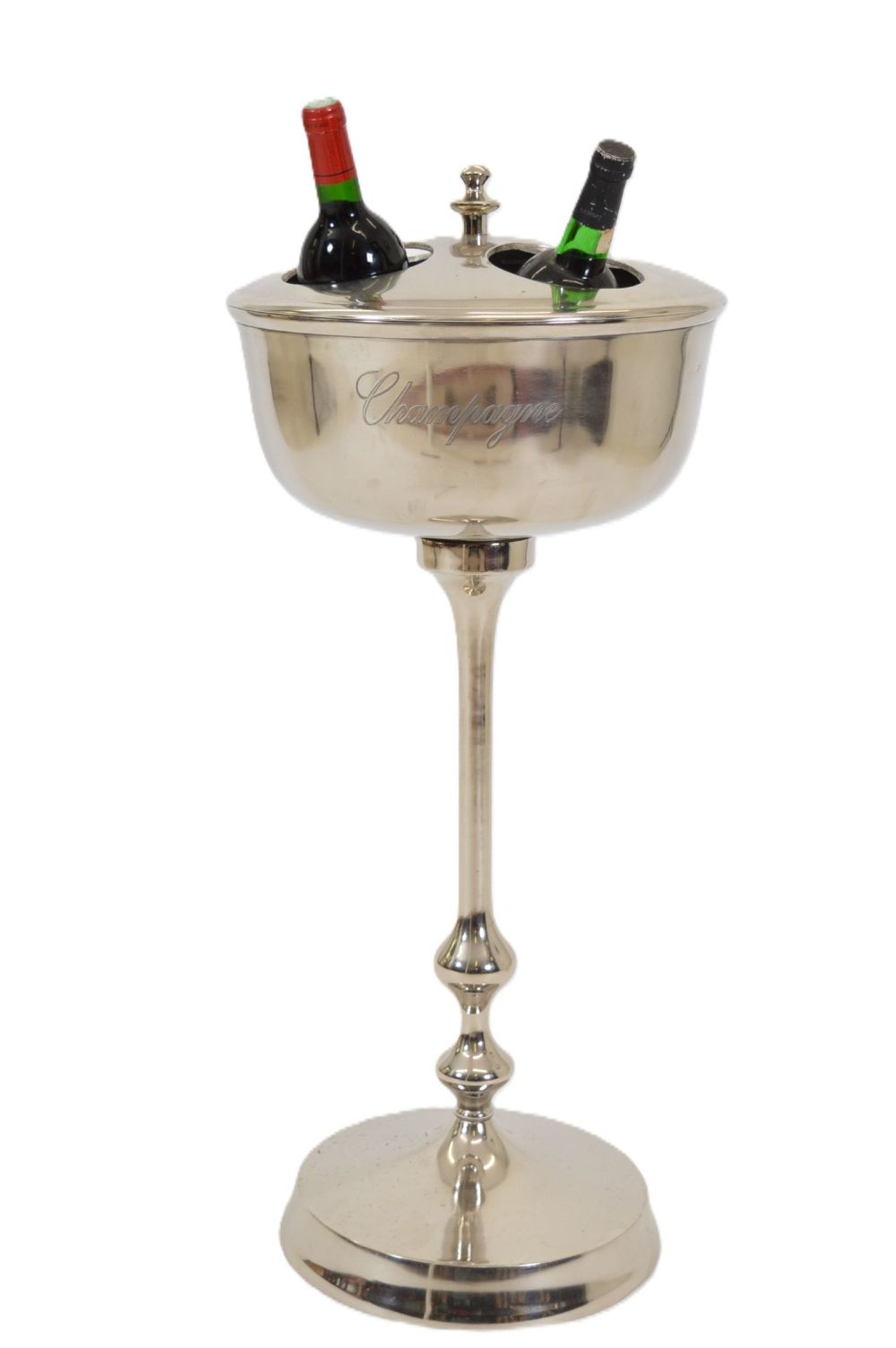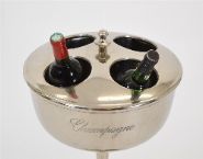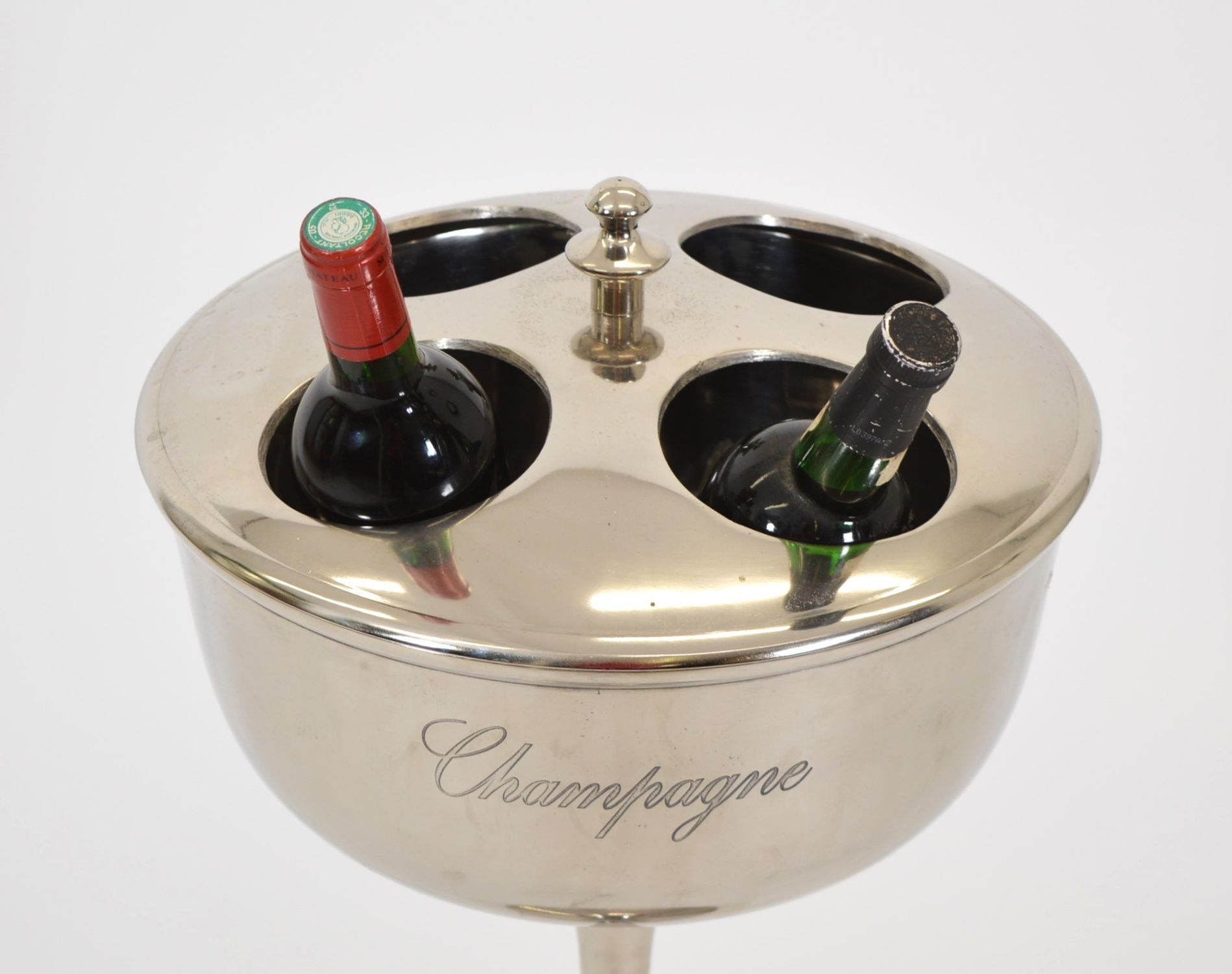 A contemporary chrome-plated floor-standing wine cooler, circular bowl engraved “Champagneâ€, fitted with four bottle apertures beneath a domed cover, supported on a baluster stem and circular base.
