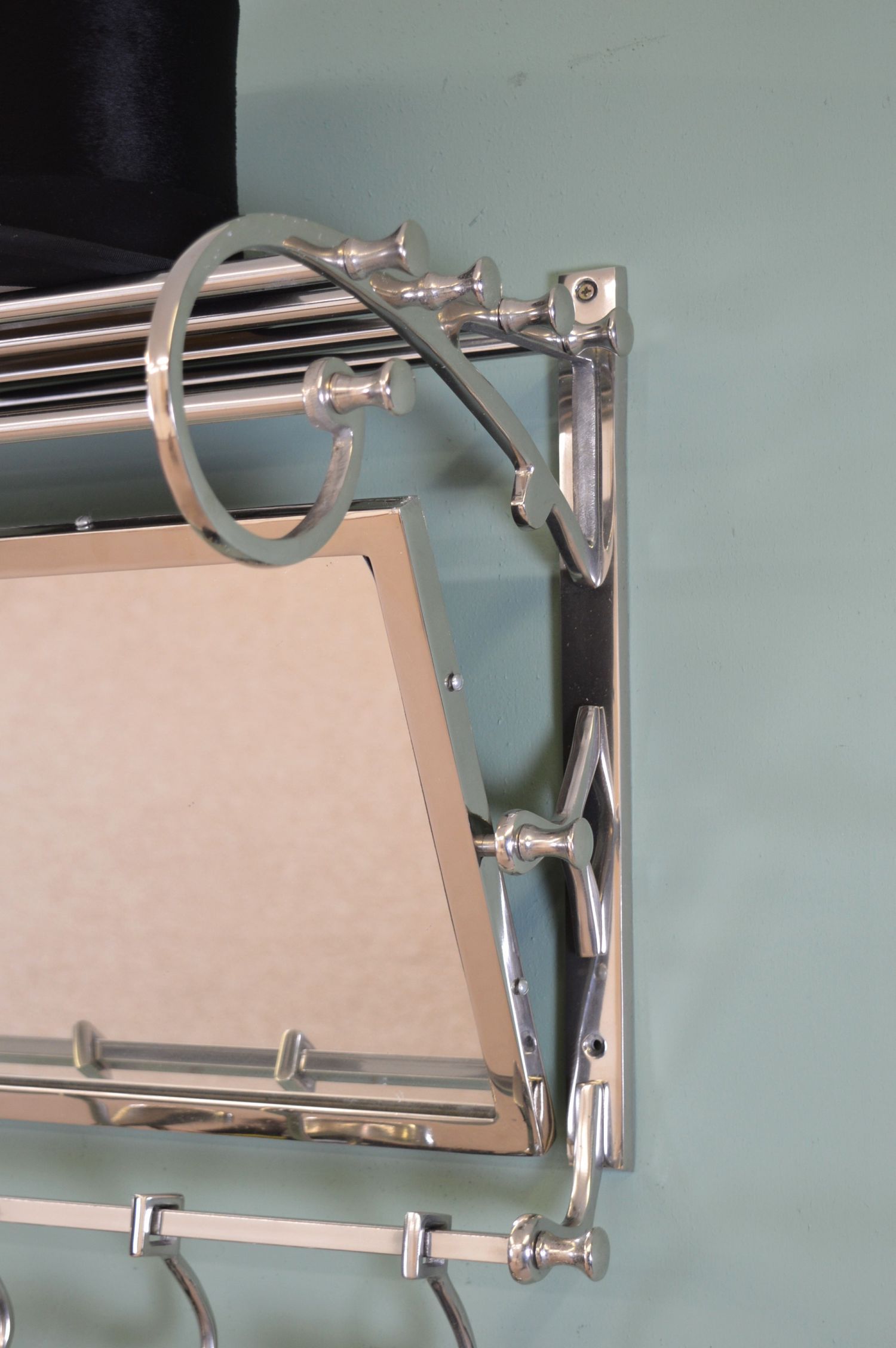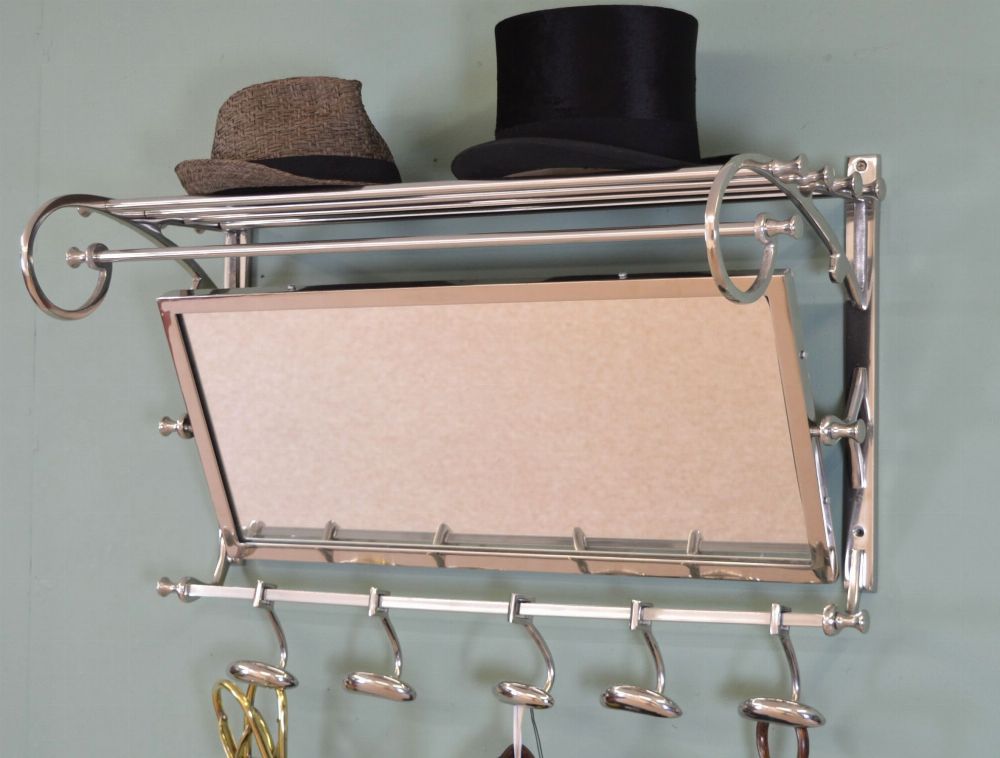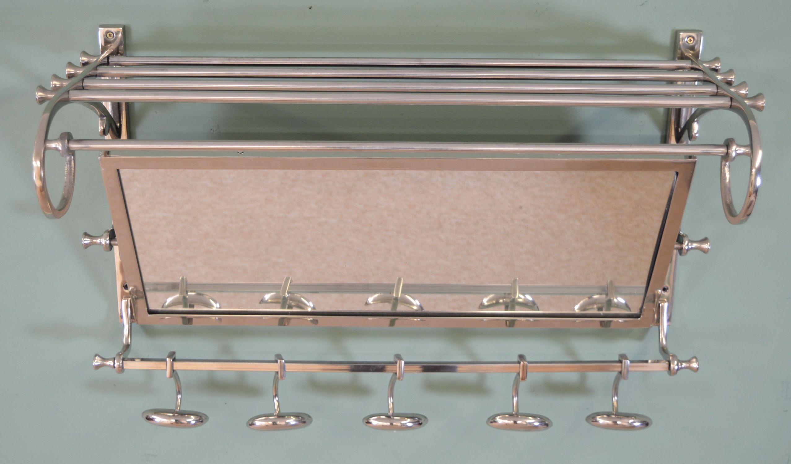A wall-mounted chrome luggage rack, fitted with upper shelf, bevelled mirror, and a row of coat hooks beneath, in a mid-20th century modernist style.