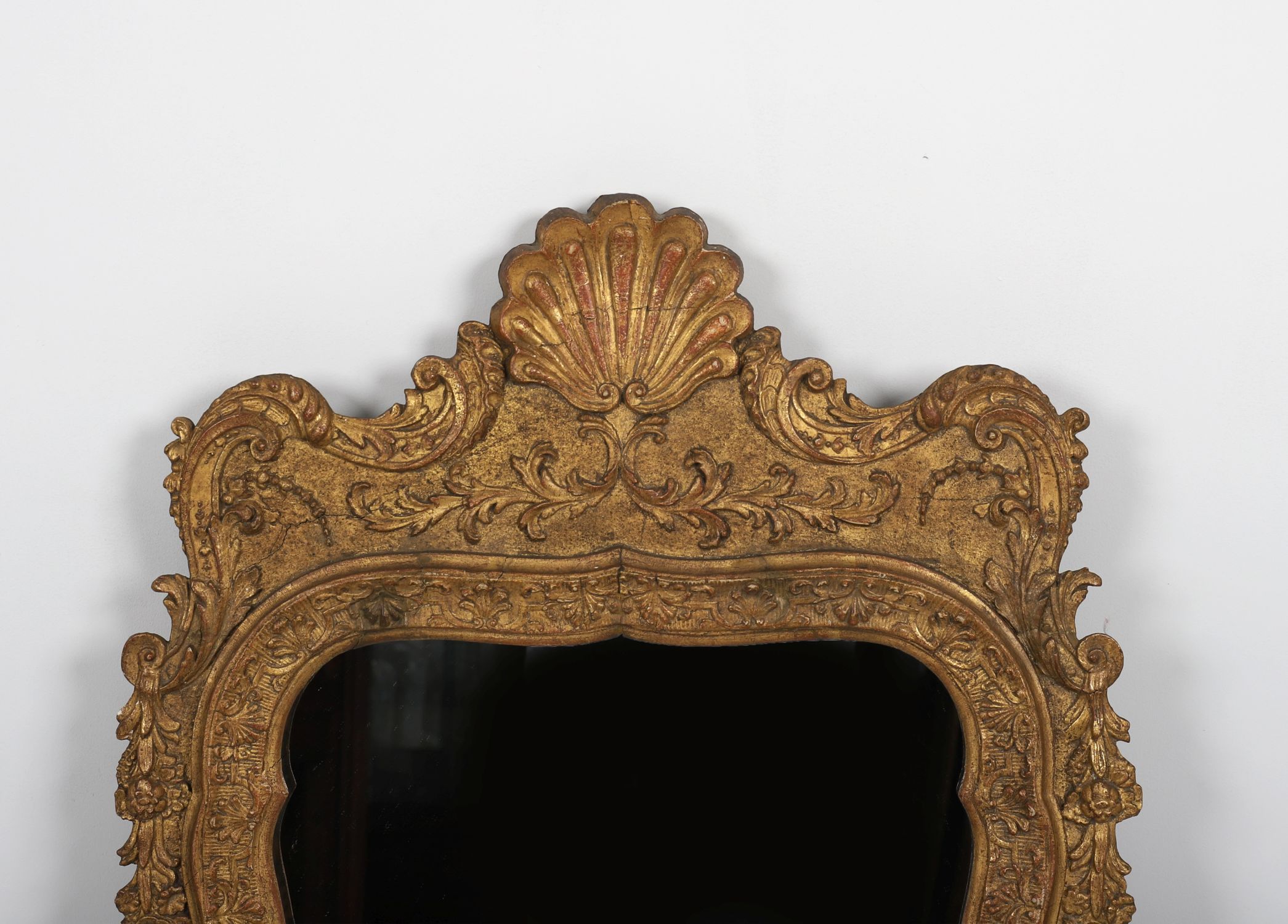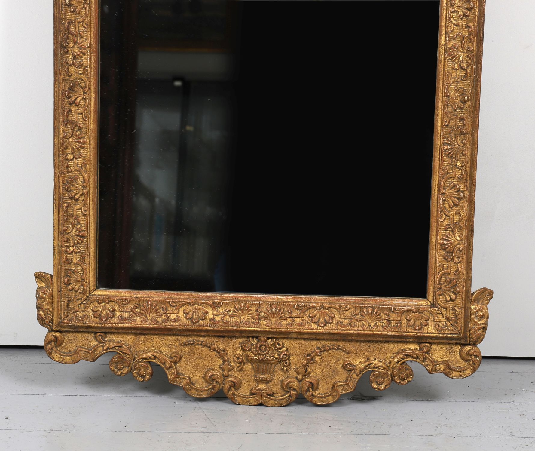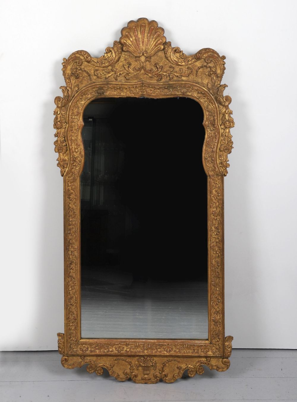 A George II period carved giltwood pier mirror, the rectangular frame surmounted by a bold shell and scroll crest, with scrolled foliate carving throughout. Original mercury plate replaced.