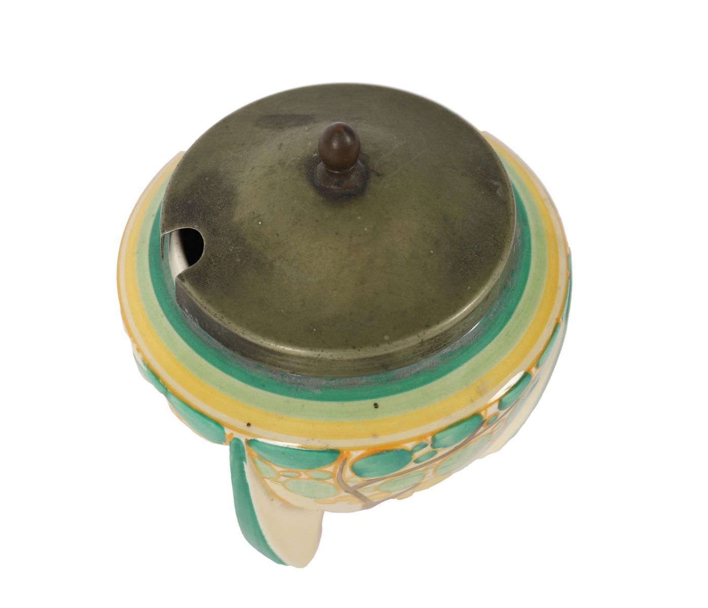 A small earthenware sugar bowl of angular form, hand-painted in the “Autumn Crocus” design with stylised flowers in orange, yellow, green and blue enamels.