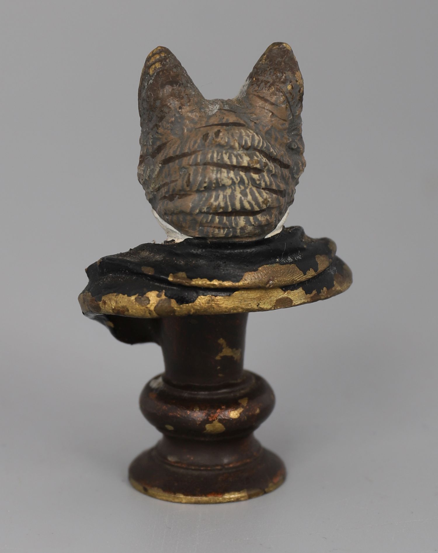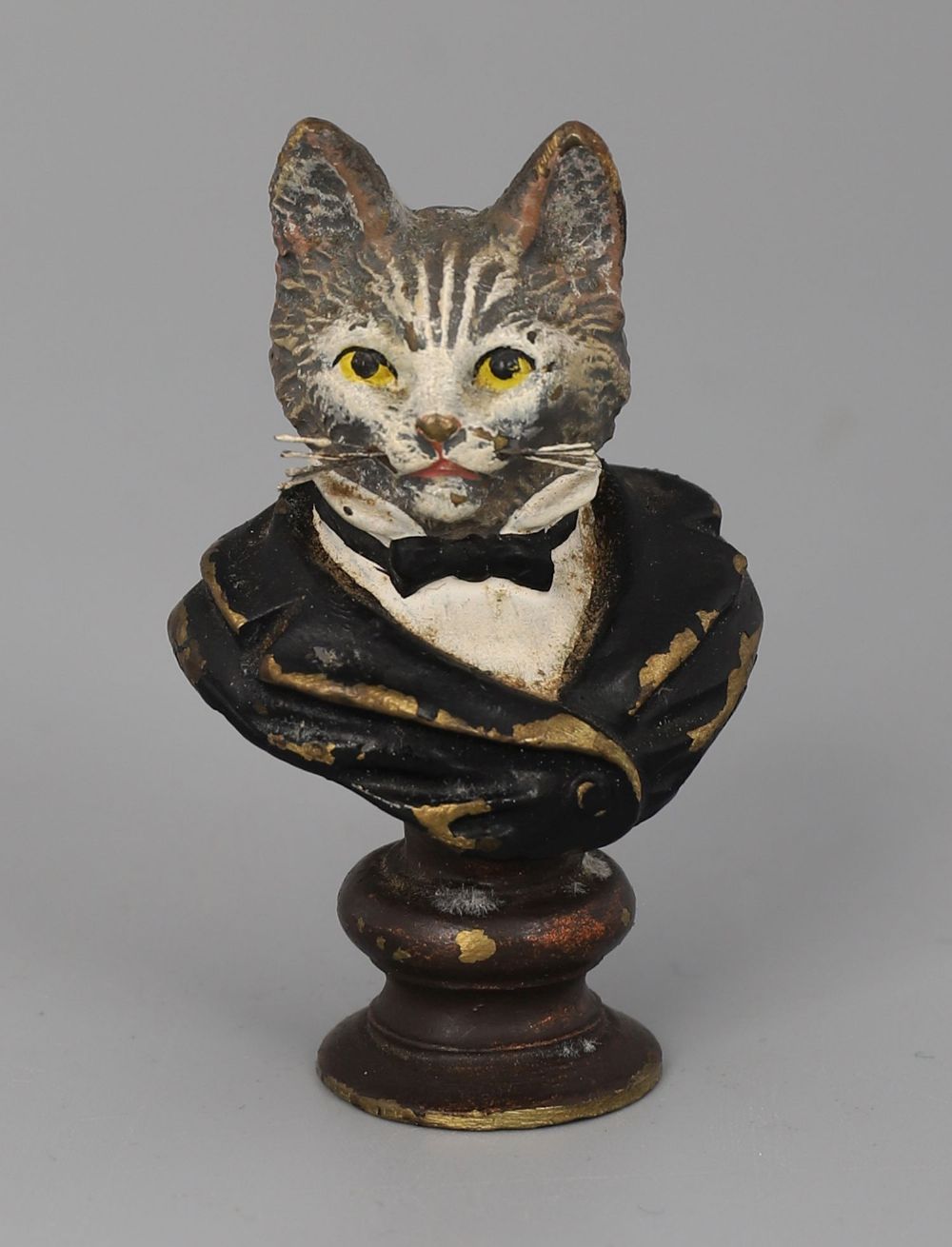 A 19th century cold painted bronze desk seal, modelled as a cat dressed in coat and cravat. Retaining traces of original polychrome decoration.