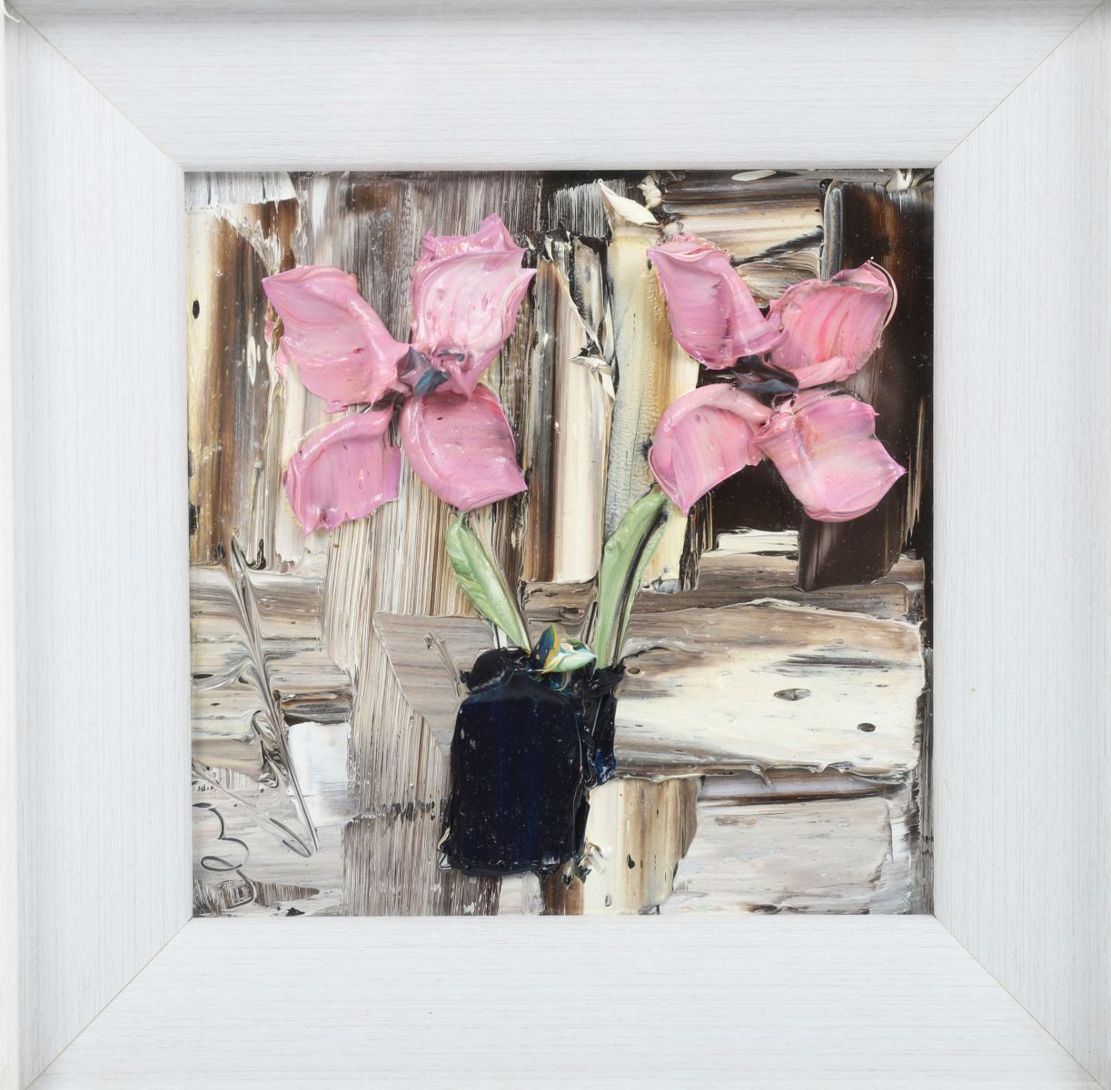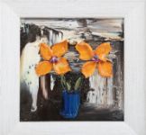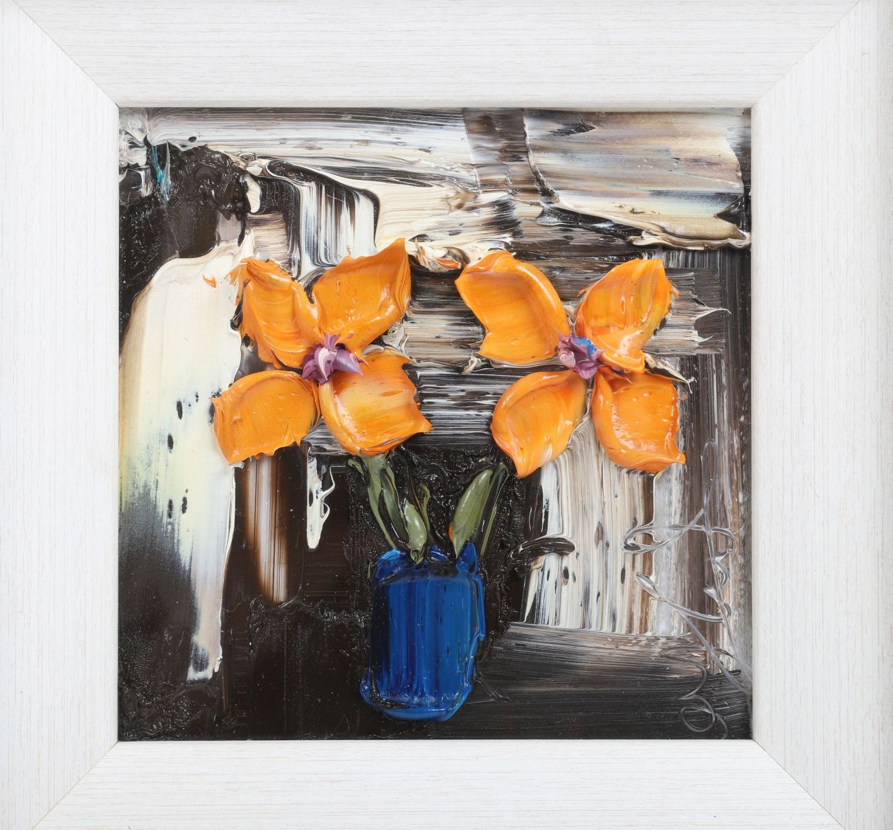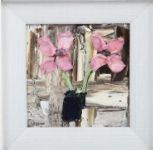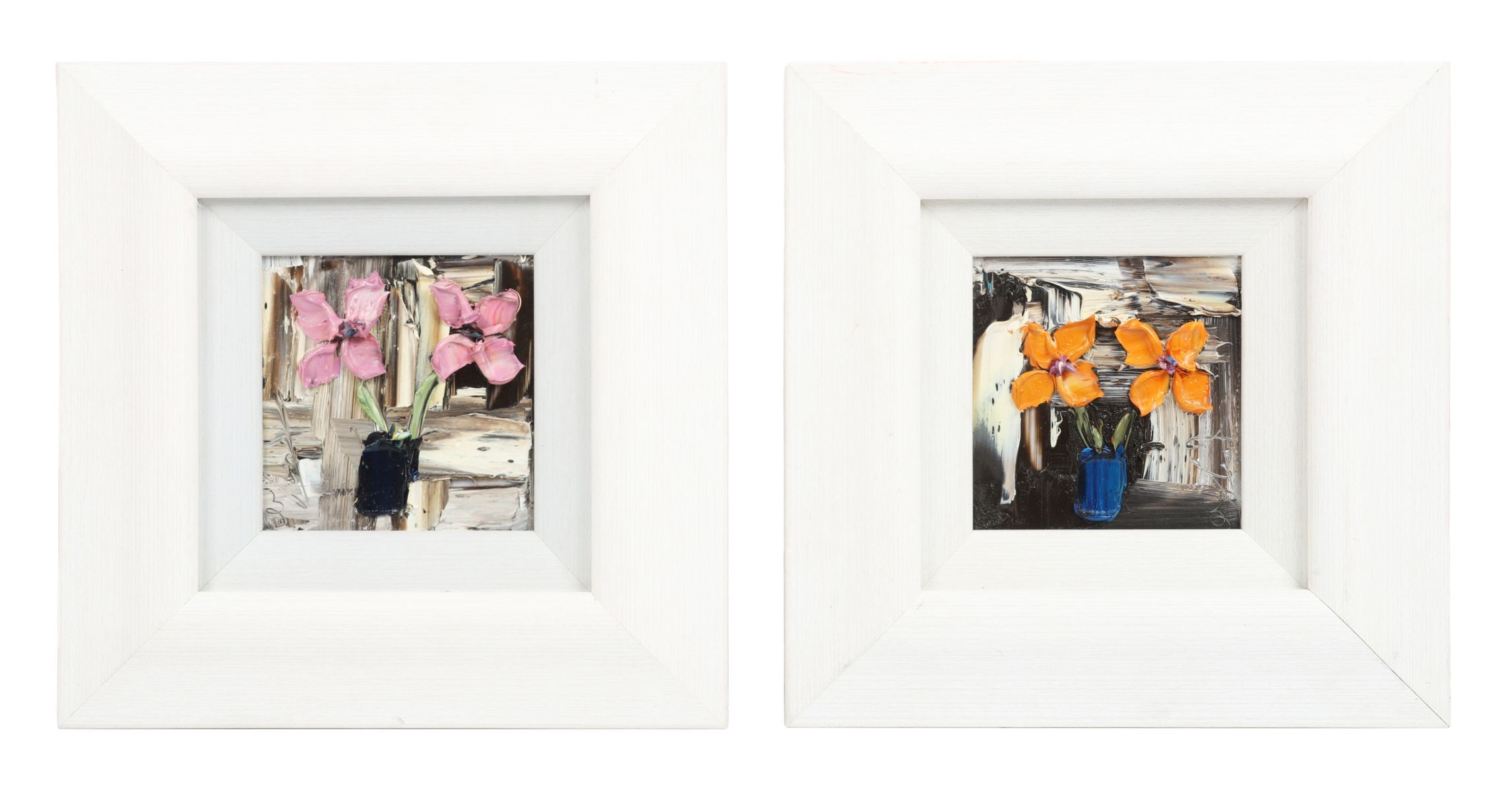 A pair of impasto floral studies depicting vibrant blooms in textured paint against neutral grounds. These intimate works display Flack’s expressive control of colour and surface, balancing abstraction and form.