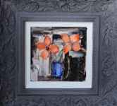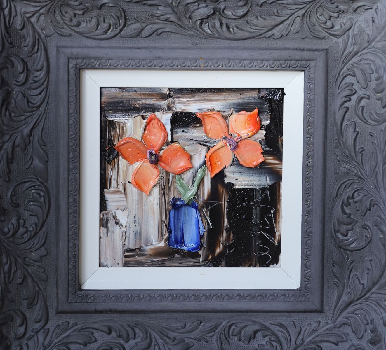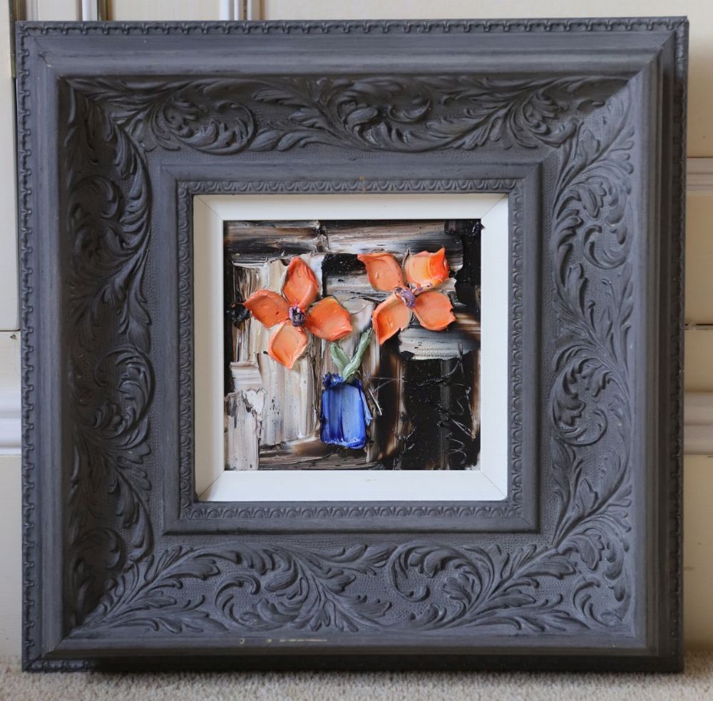 Still life depicting flowers arranged in a blue vase, executed in heavy impasto. Signed indistinctly. Framed. Oil on panel.