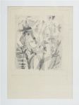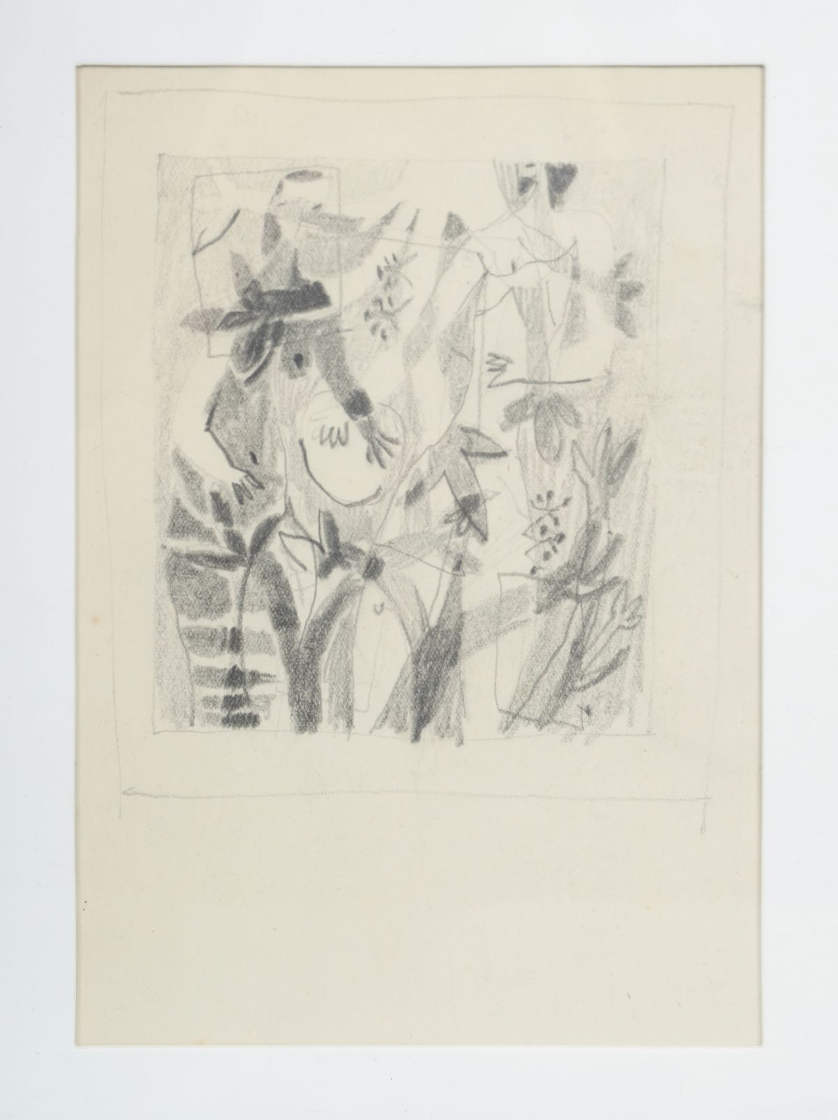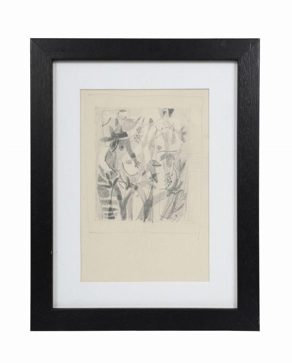 A graphite drawing on paper featuring abstracted avian and human forms intertwined within a rhythmic composition. Framed and glazed.