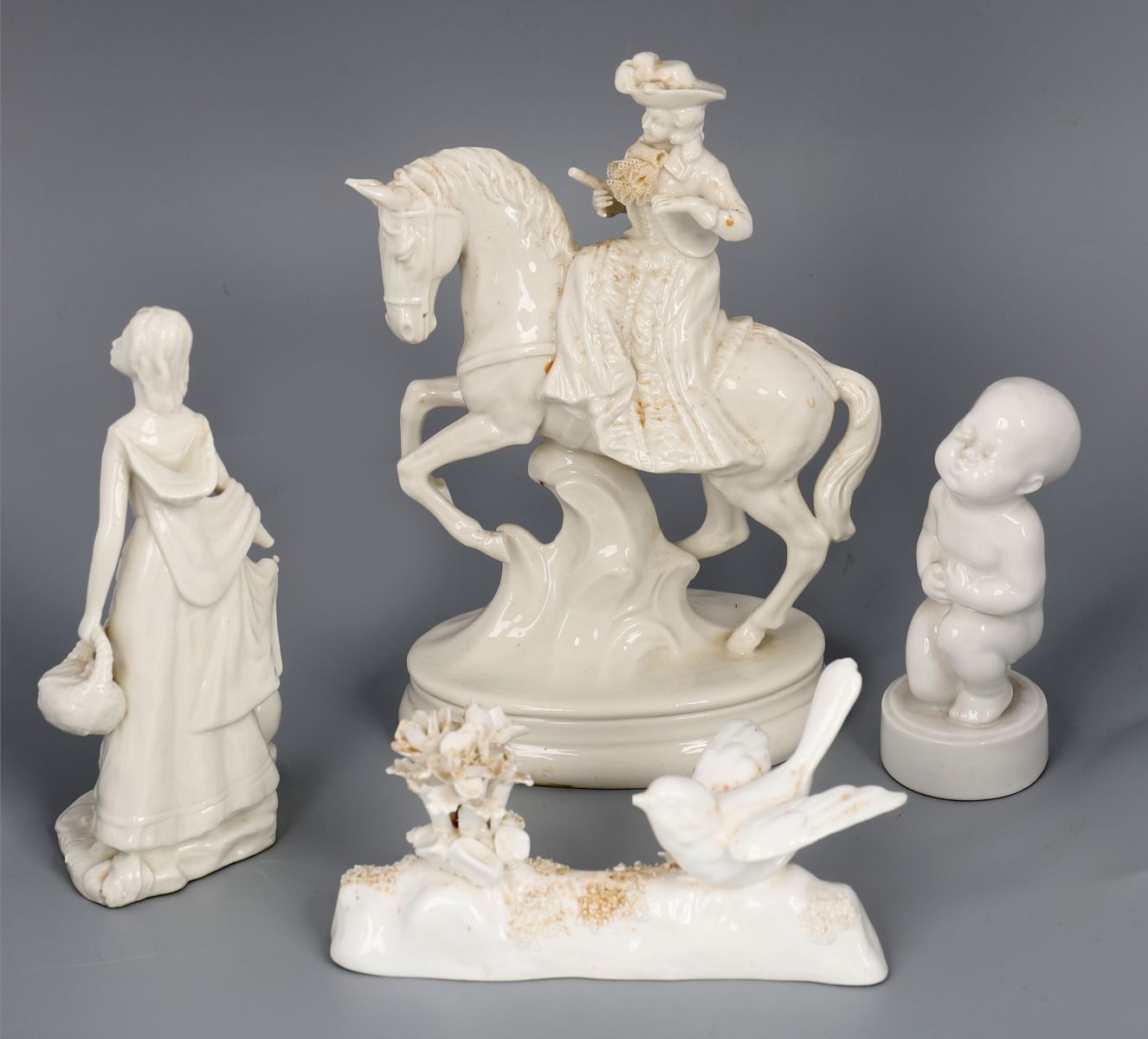 A group of four small porcelain figures, comprising a lady carrying a basket, a mounted rider, a child with bird, and a floral encrusted group.