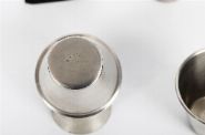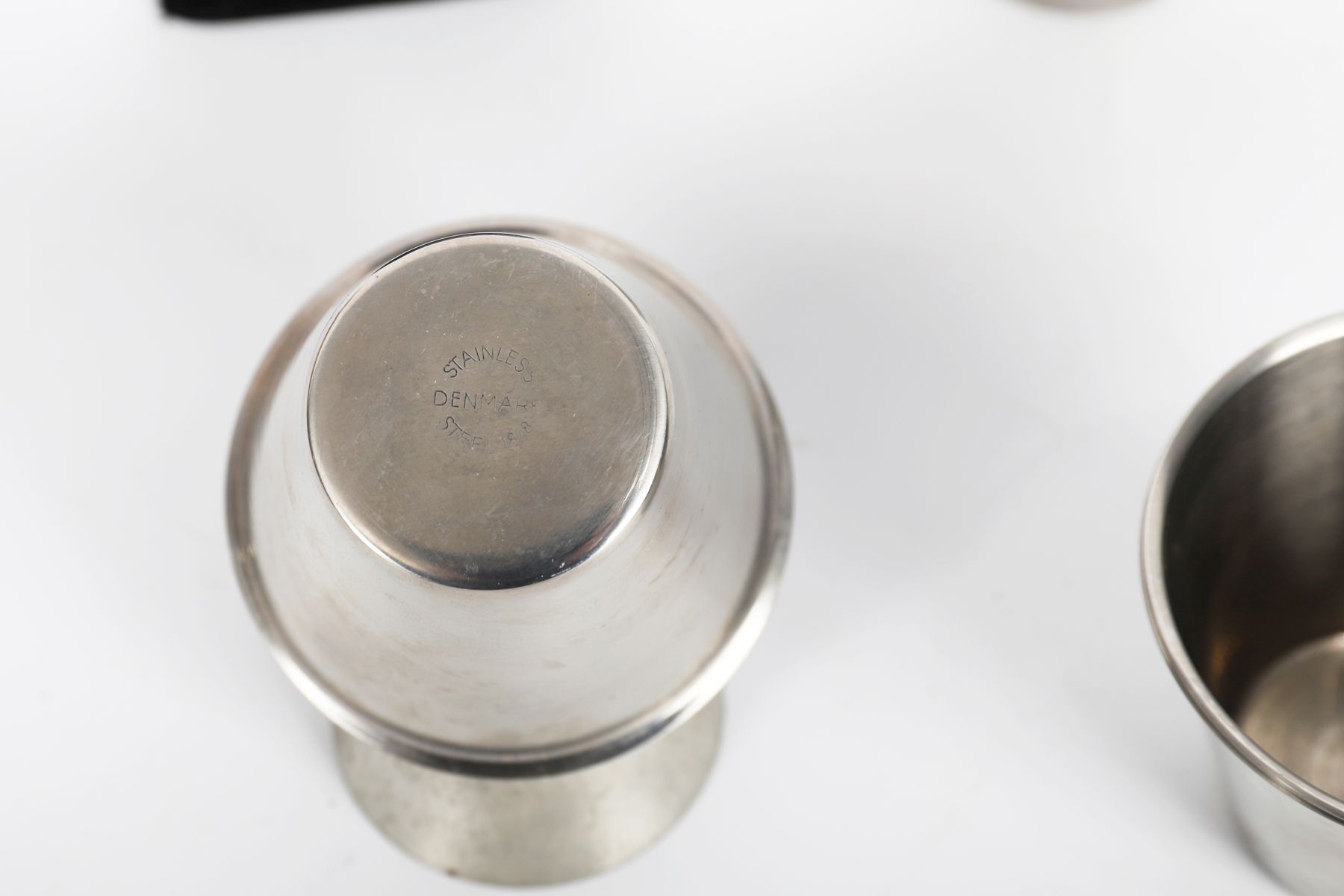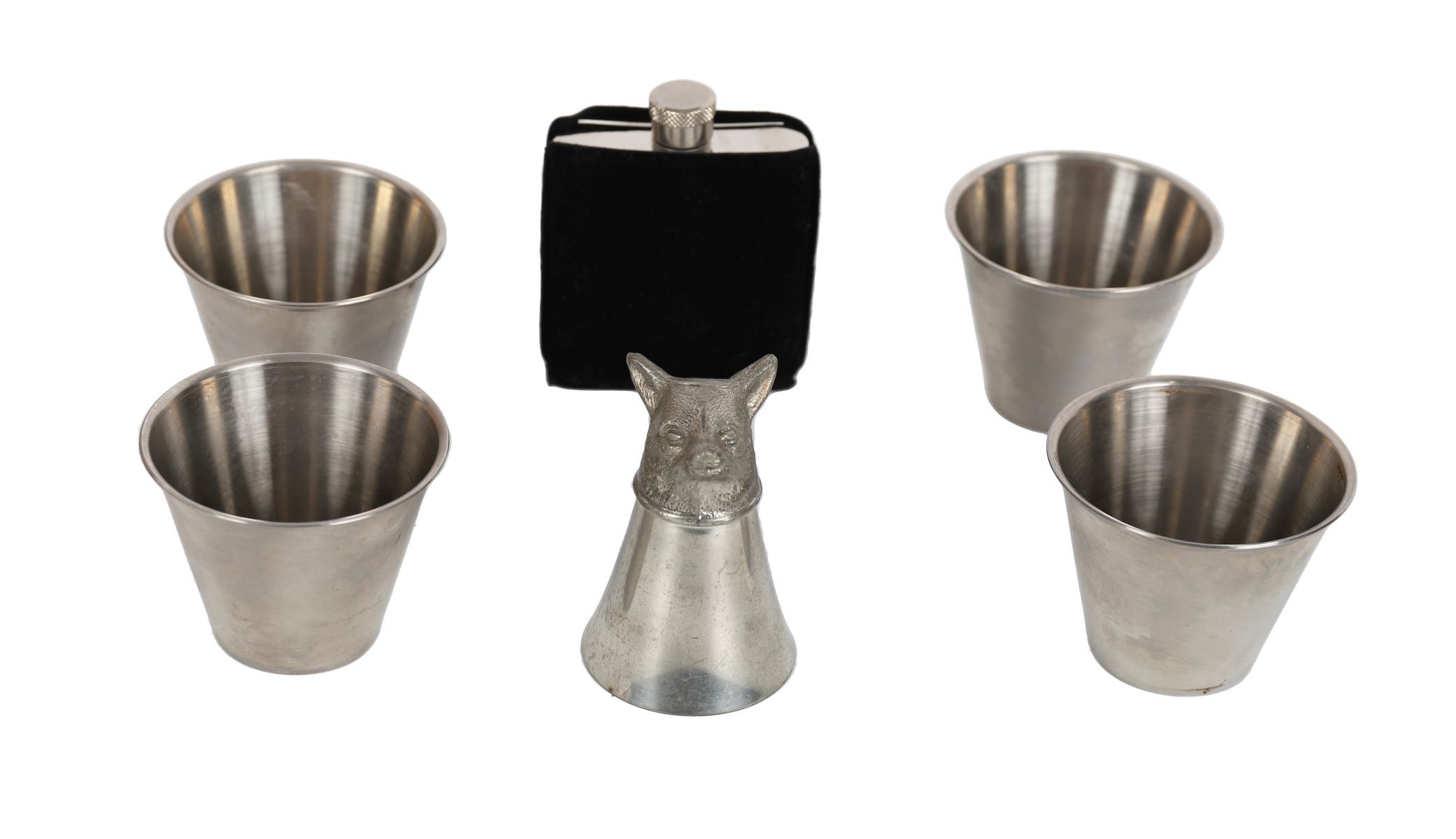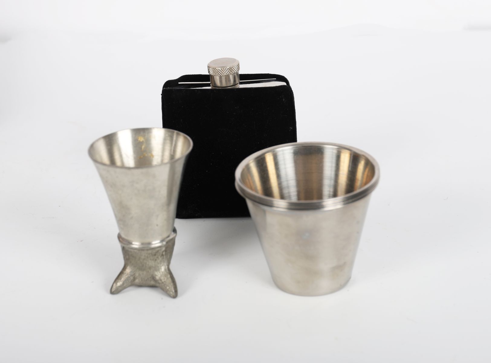 A small group of vintage hunting-related accessories comprising a fox-head silver-plated stirrup cup, a collapsible set of stainless spirit beakers in leather case, a compact circular black leather hip flask, and a miniature flask in velvet pouch. The fox-head cup finely modelled and of traditional design.