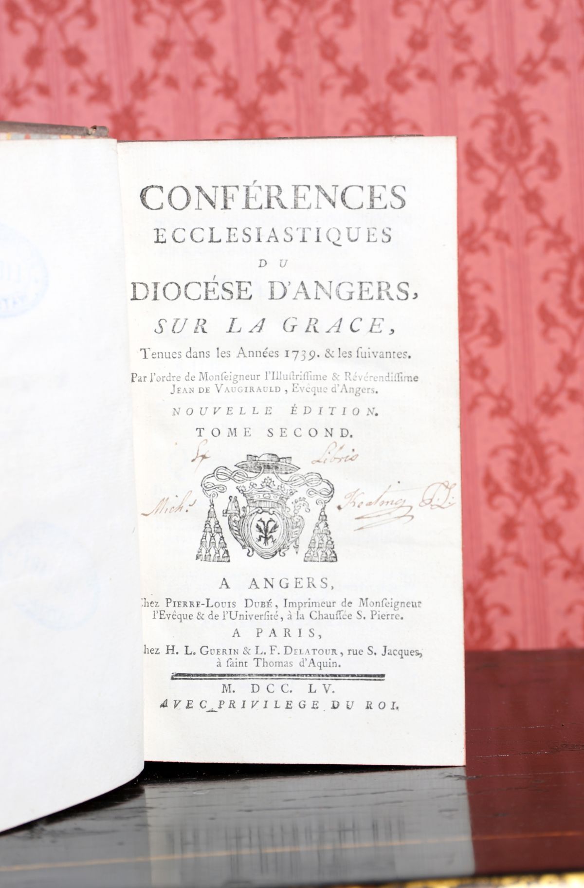 "A substantial collection of volumes from Conférences Ecclésiastiques du Diocèse d’Angers sur la Grâce, being ecclesiastical conferences held from 1739 onwards, published by order of Jean de Vaugiraud, Bishop of Angers. Nouvelle édition. Angers, Pierre-Louis Dubé, Imprimeur de Monseigneur l’Évêque & de l’Université; and Paris, H. L. Guerin & L. F. Delatour, 1755 (MDCCLV).