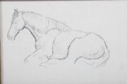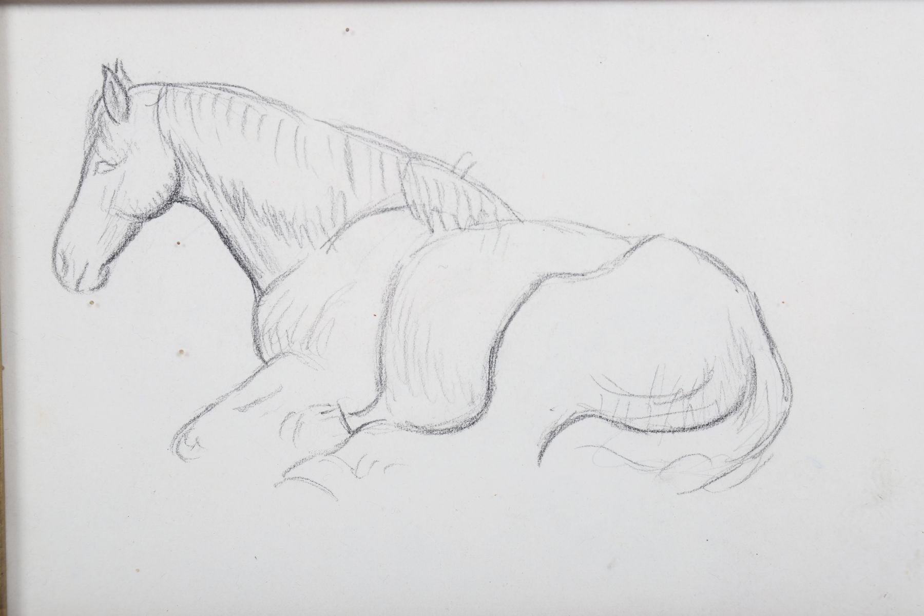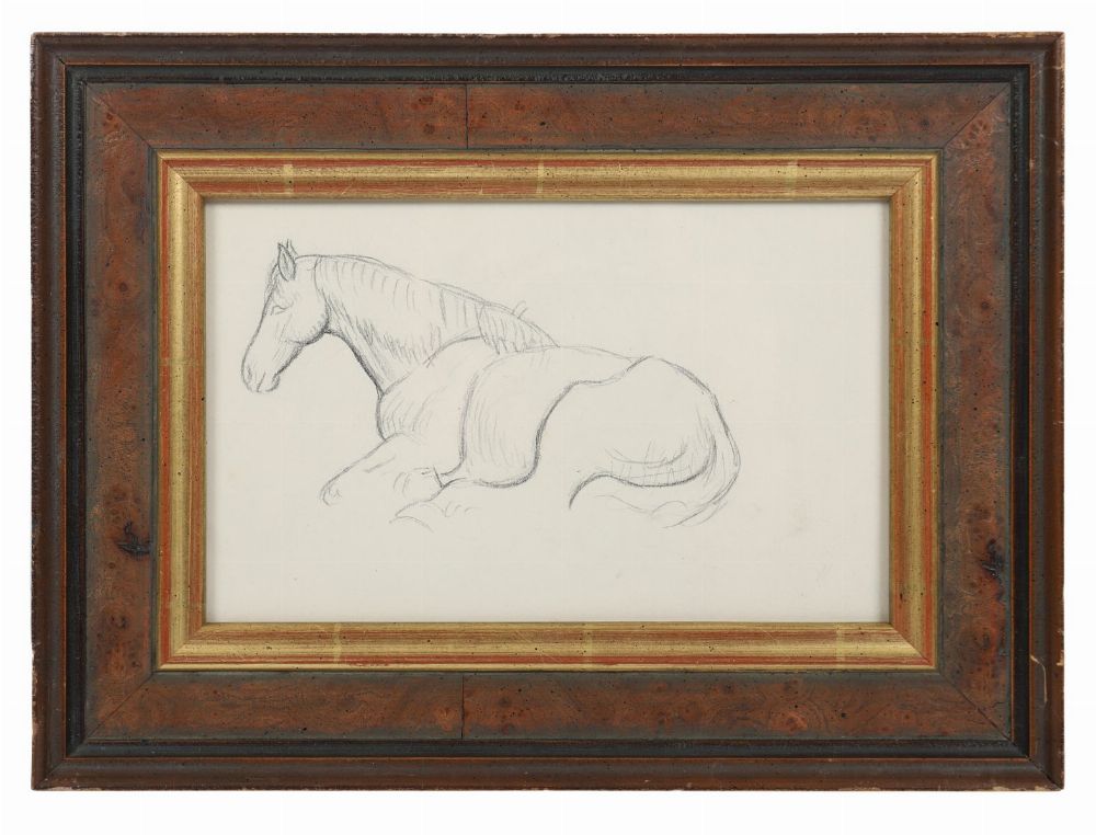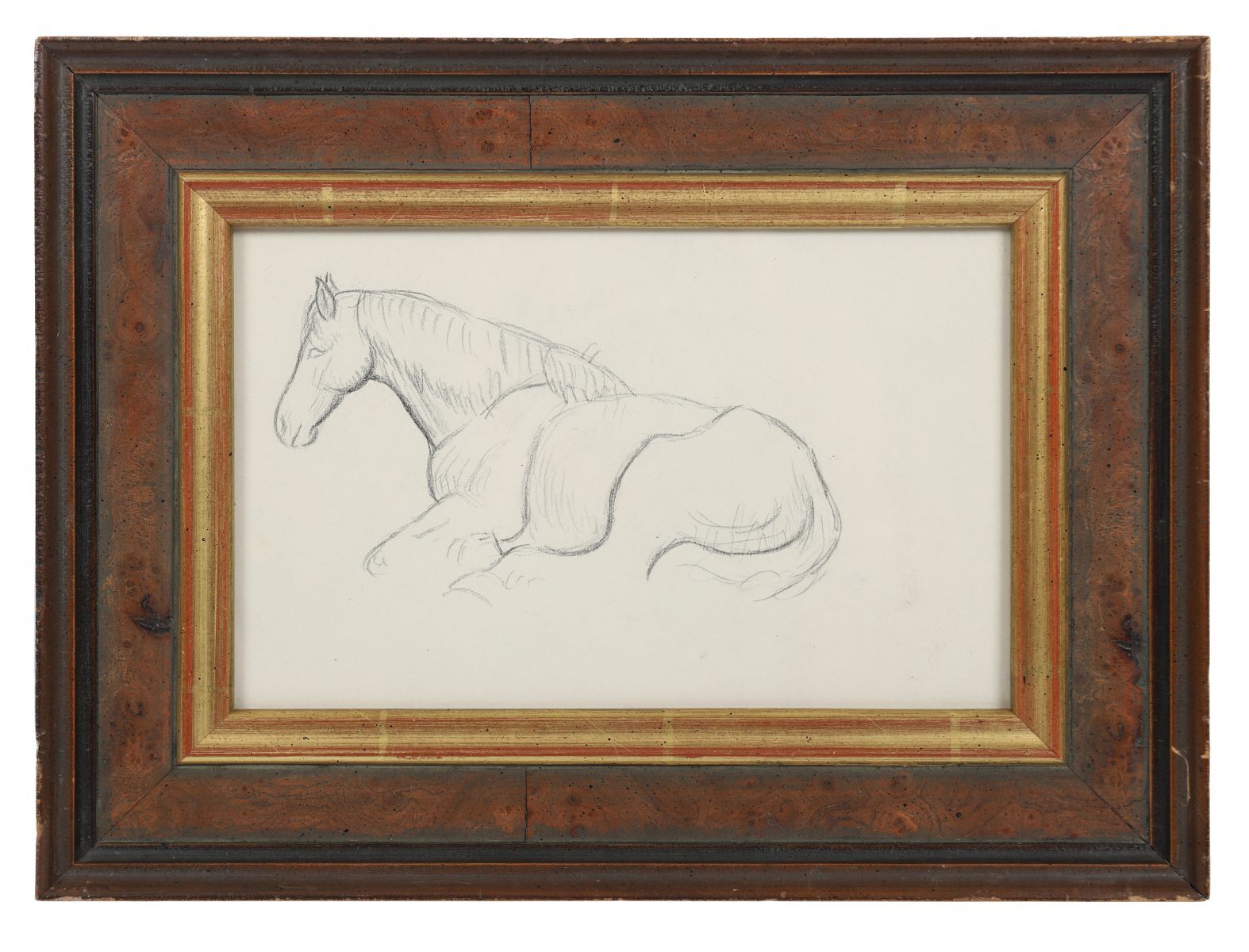 A finely observed pencil drawing depicting a horse lying down, displaying the artist’s understanding of anatomy and form. Presented in a gilt-lined walnut frame.