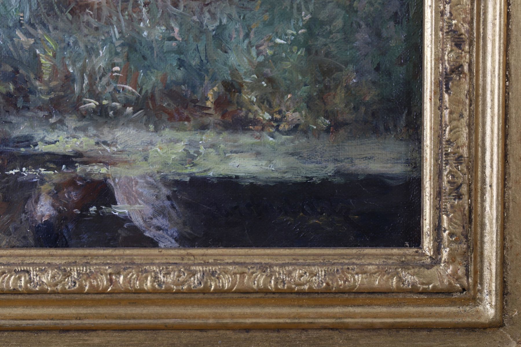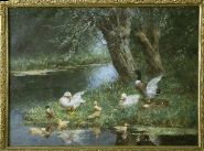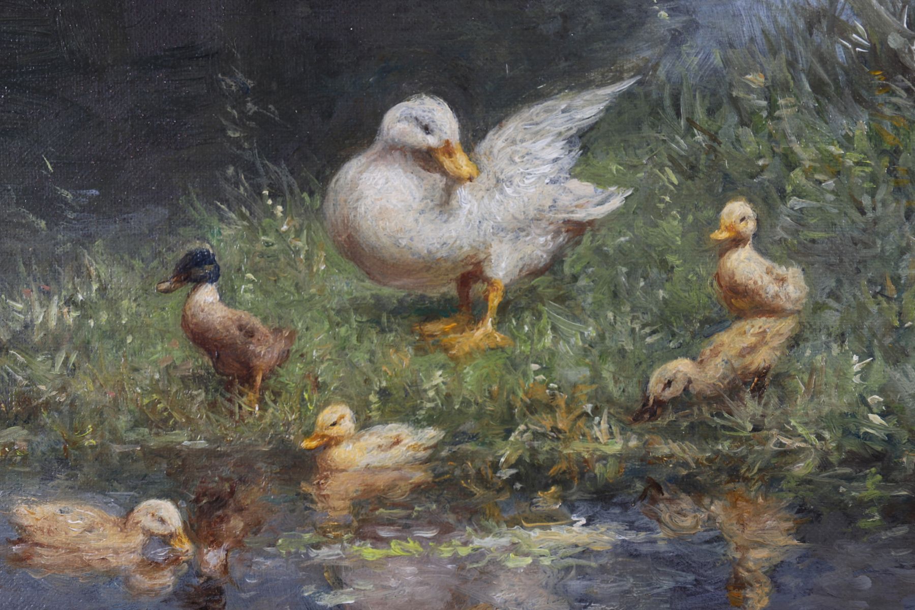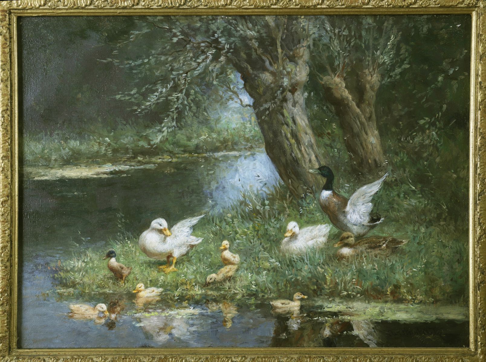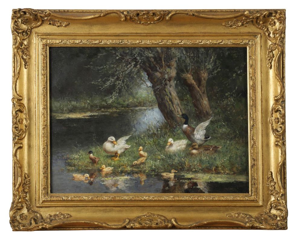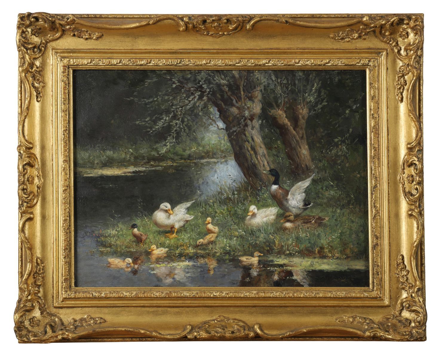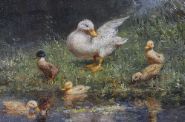 A lively composition depicting ducks and ducklings beside a pond beneath shaded trees. Oil on board, signed lower right. Presented in a gilt frame.