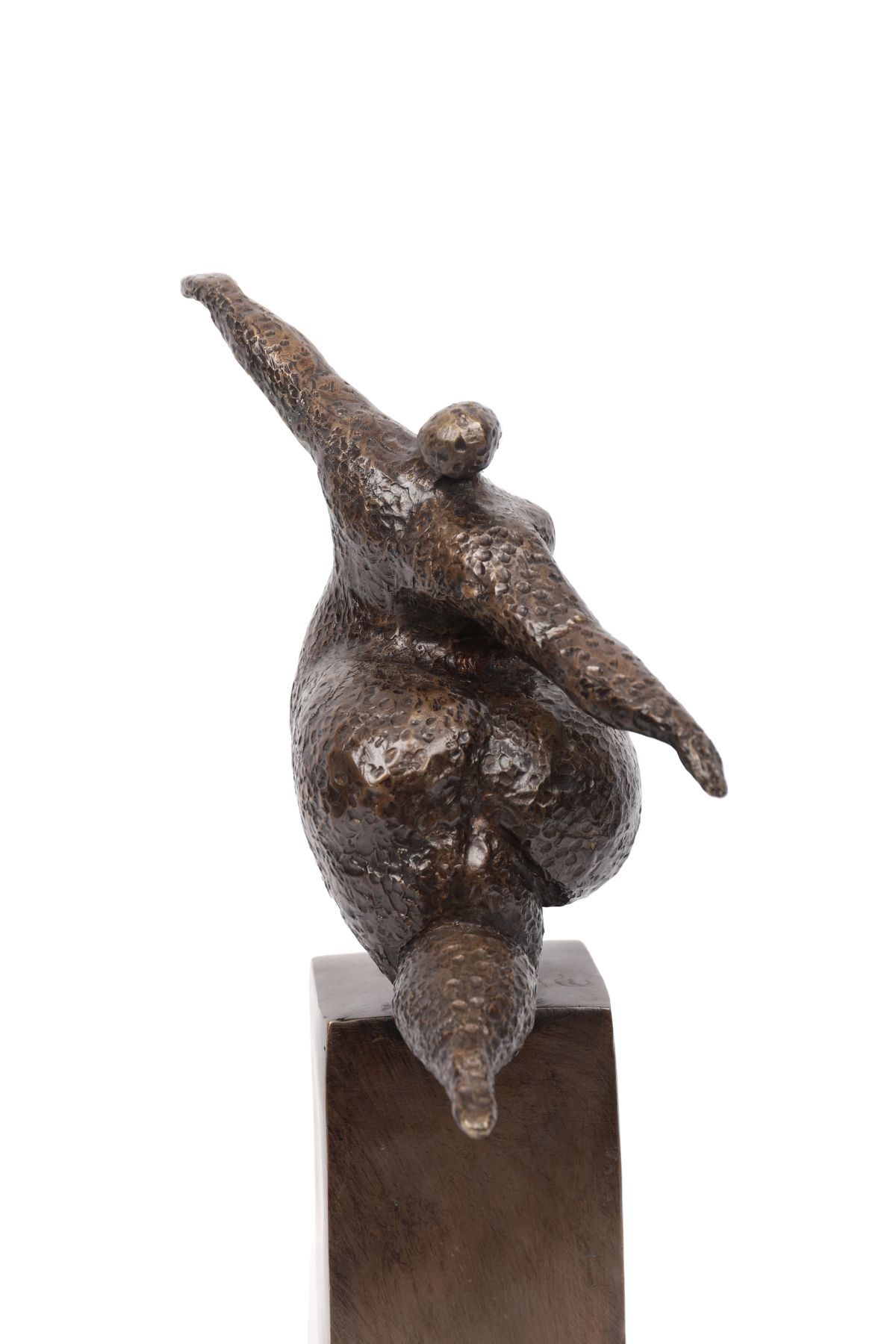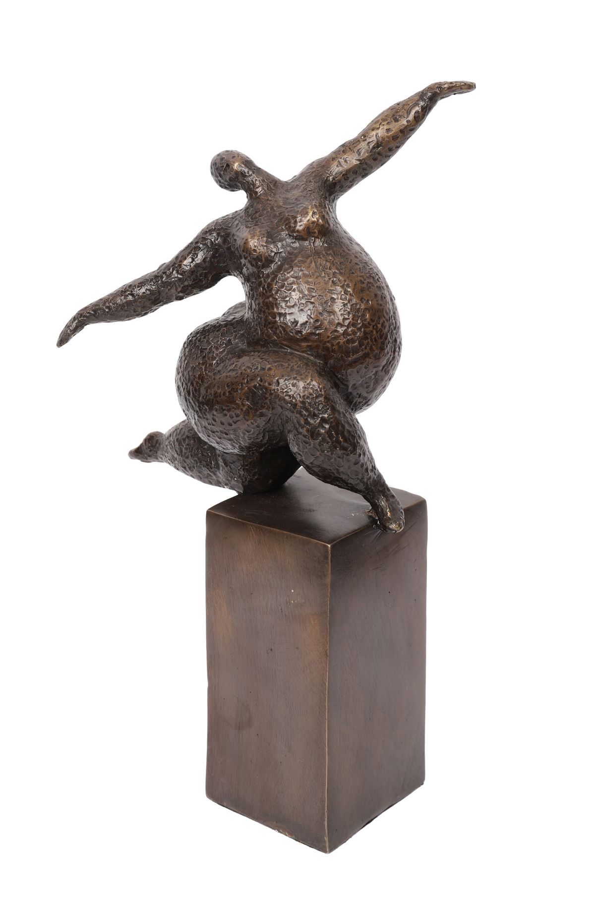 A contemporary abstract bronze sculpture of a dancing female figure, raised on a square plinth.