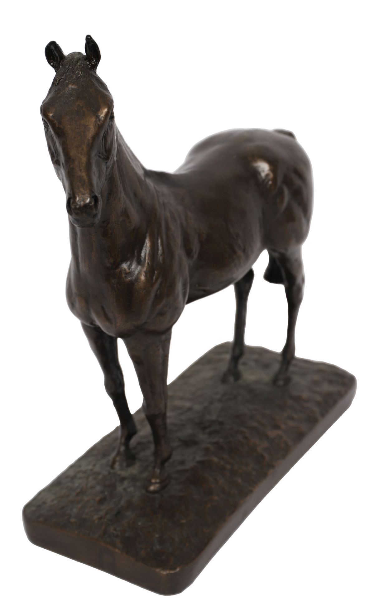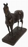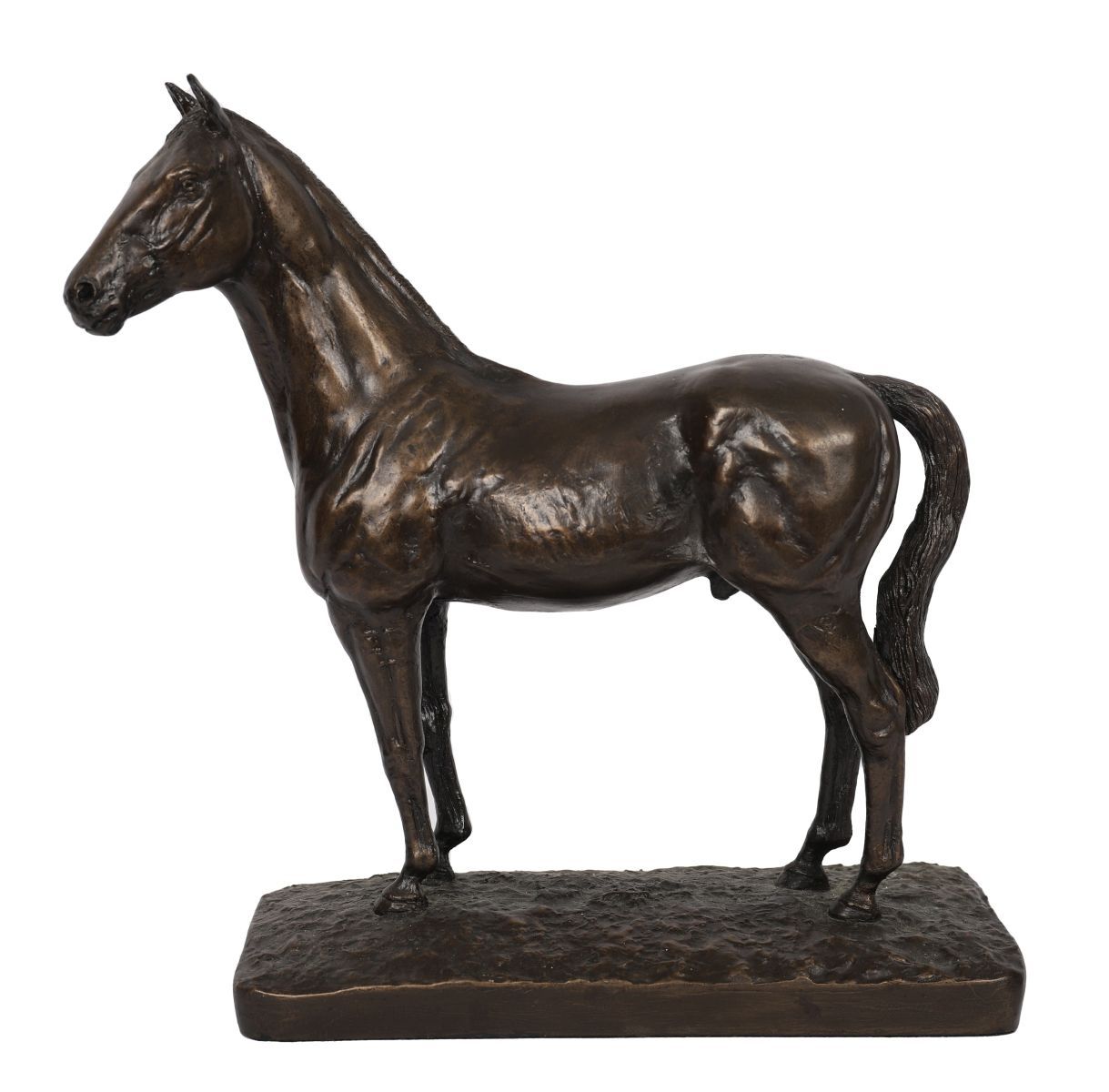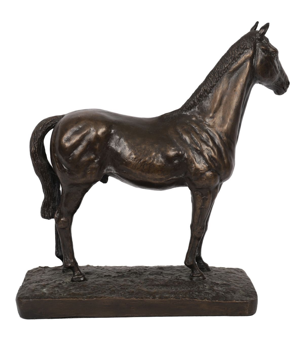 A contemporary bronze sculpture of a standing racehorse, modelled in naturalistic form and raised on a rectangular base.