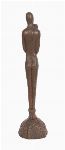 A contemporary metal sculpture depicting an embracing couple, of elongated stylised form, raised on a naturalistic base.