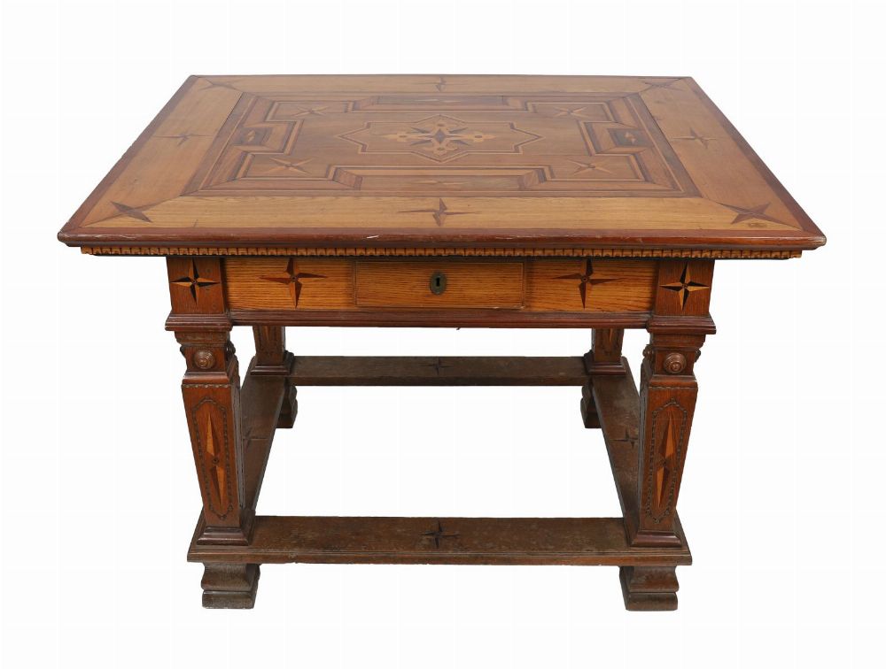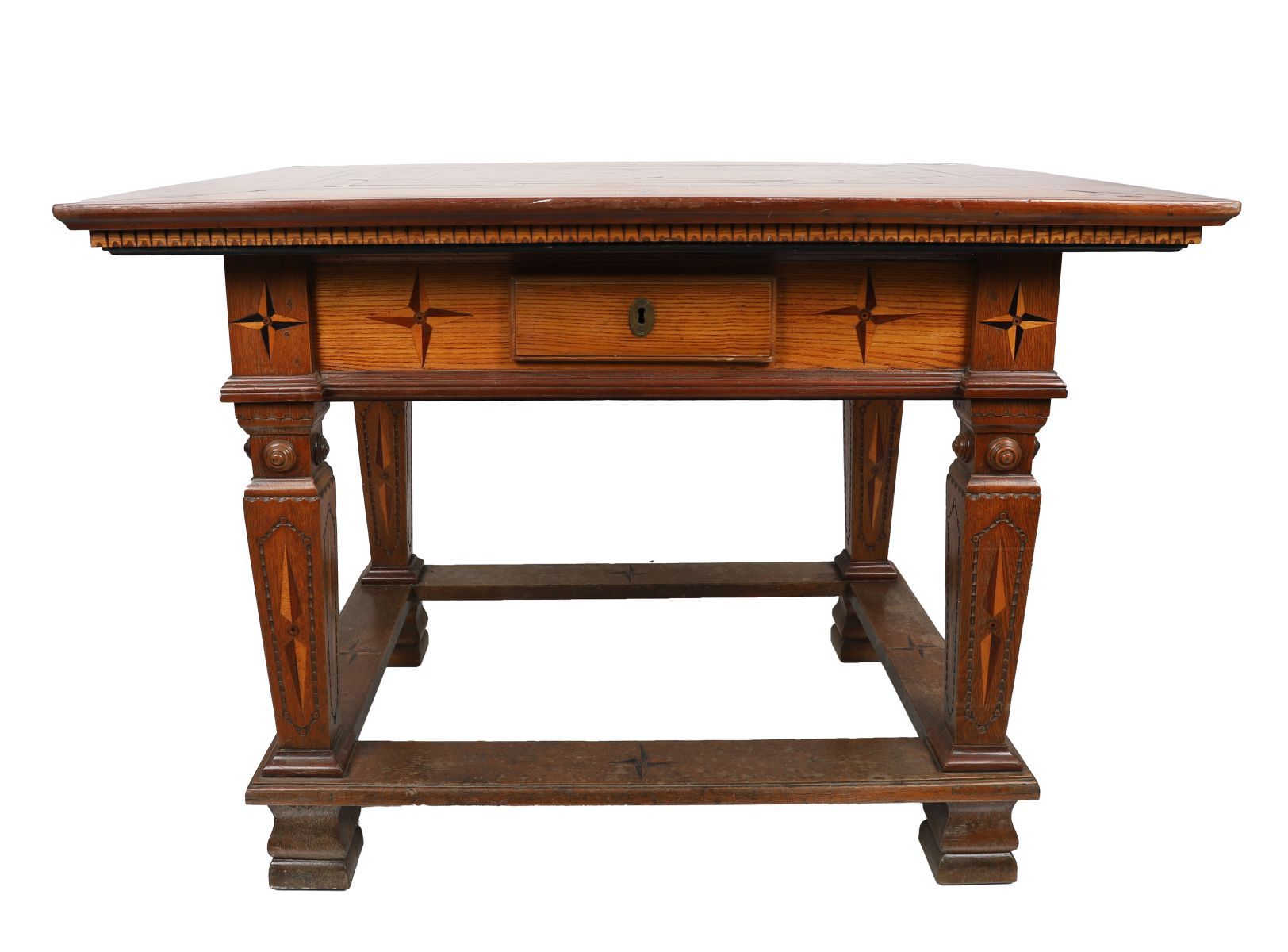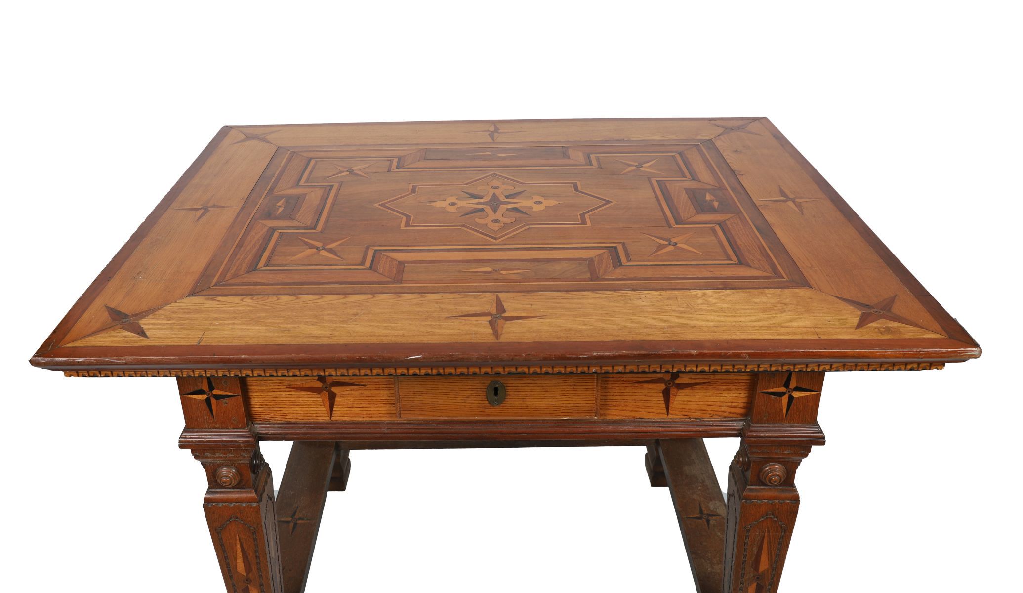 Finely crafted late 19th-century Continental writing table, richly decorated with geometric parquetry and star inlays in contrasting timbers. The interior bears an inscription reading “fait à… l’an 1897”, indicating its date and likely the maker’s mark. Raised on square tapering supports with matching inlay detail.