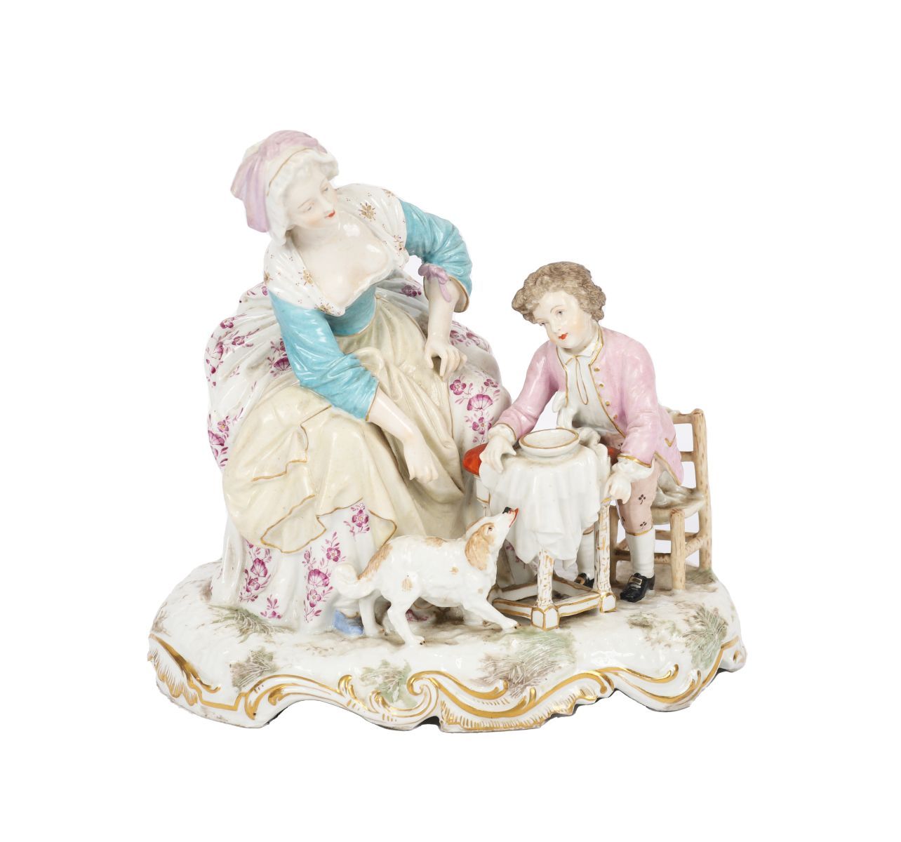 A charming Continental porcelain group depicting a lady seated beside a boy and small dog, finely painted in pastel tones with gilt highlights.