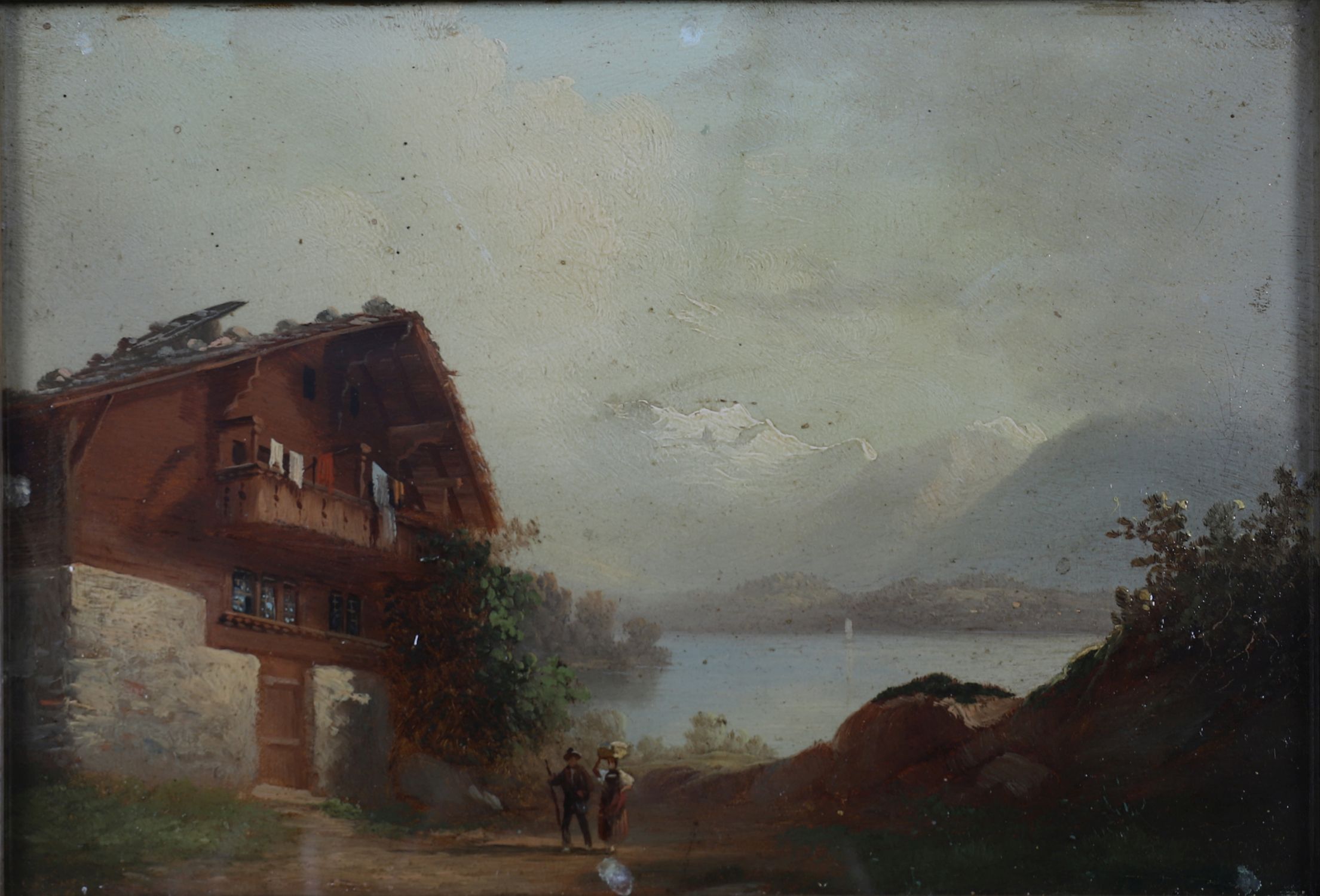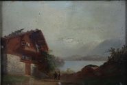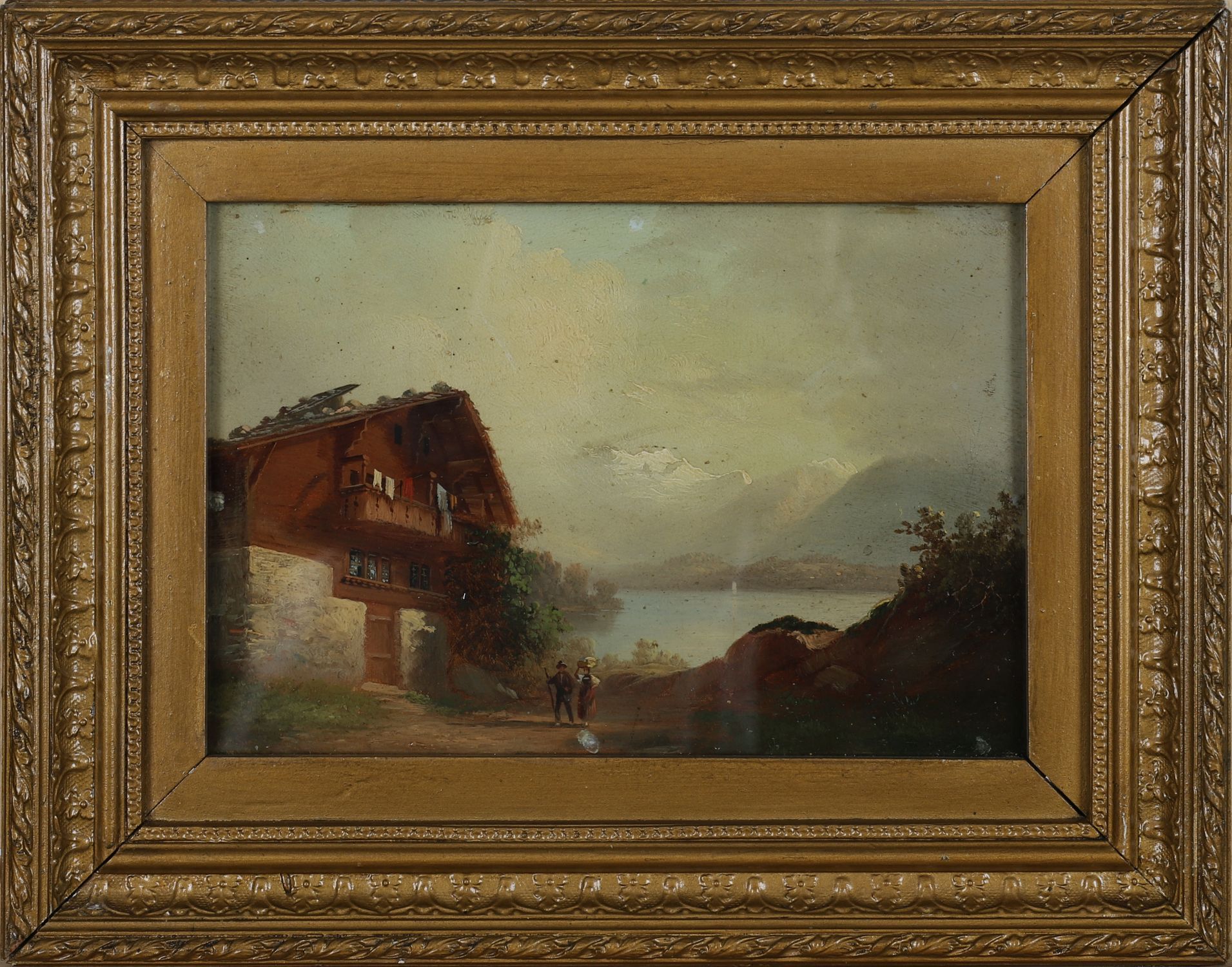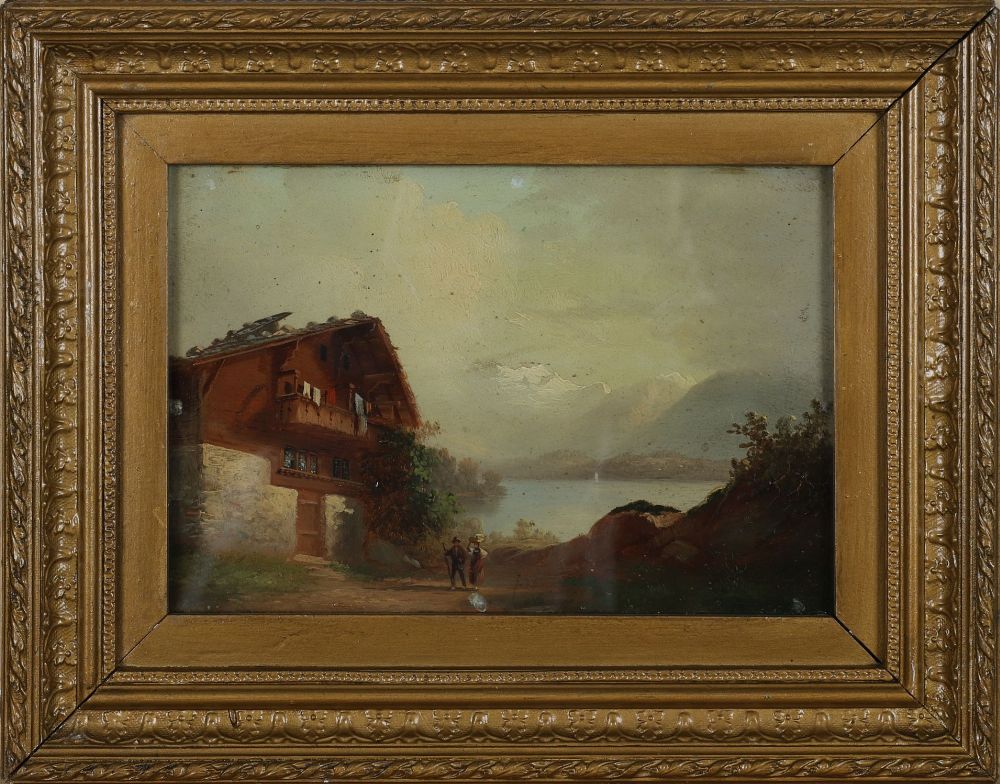 A 19th century oil painting depicting travellers before a chalet with mountain peaks and a lake beyond, painted in warm tones. Enclosed in a gilt frame. Oil on card.