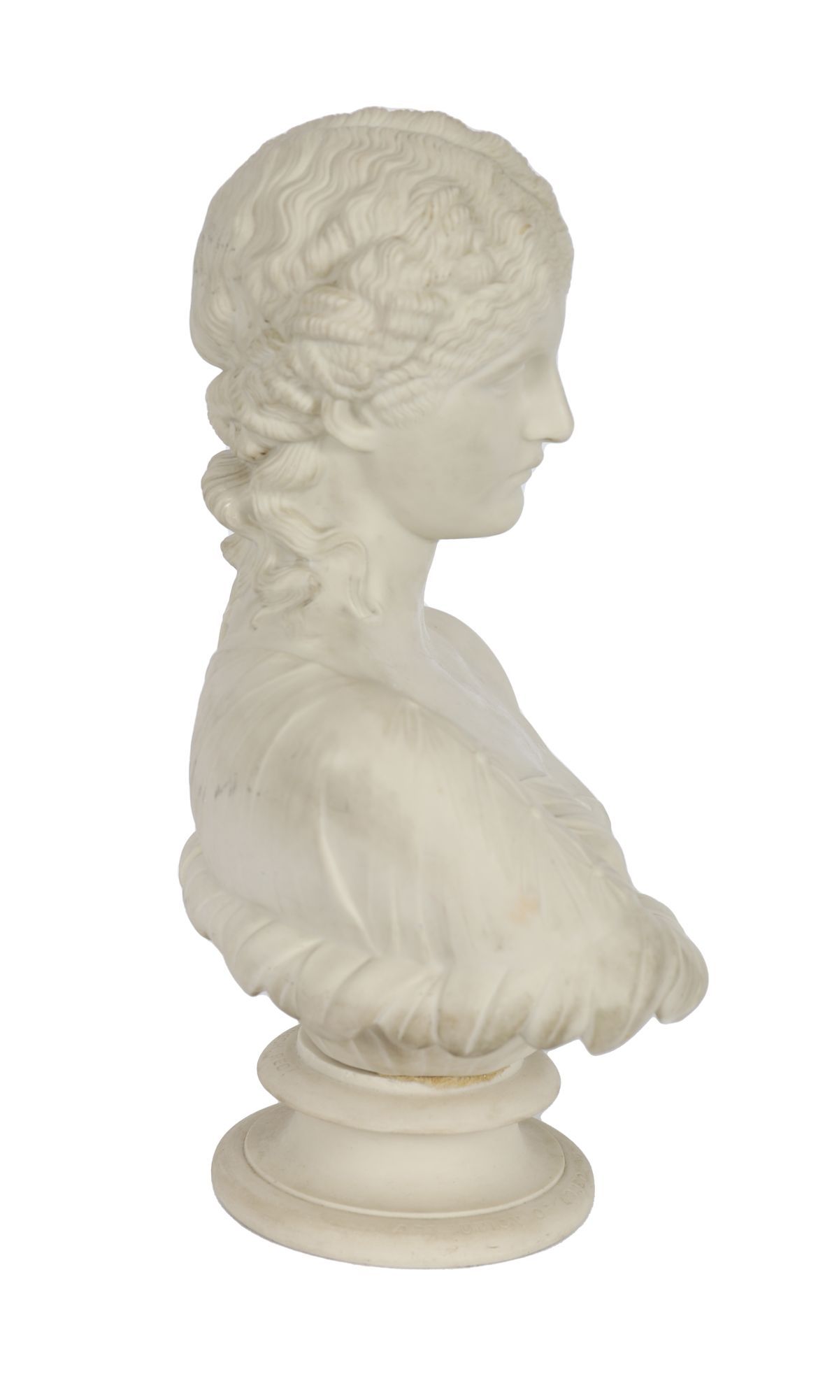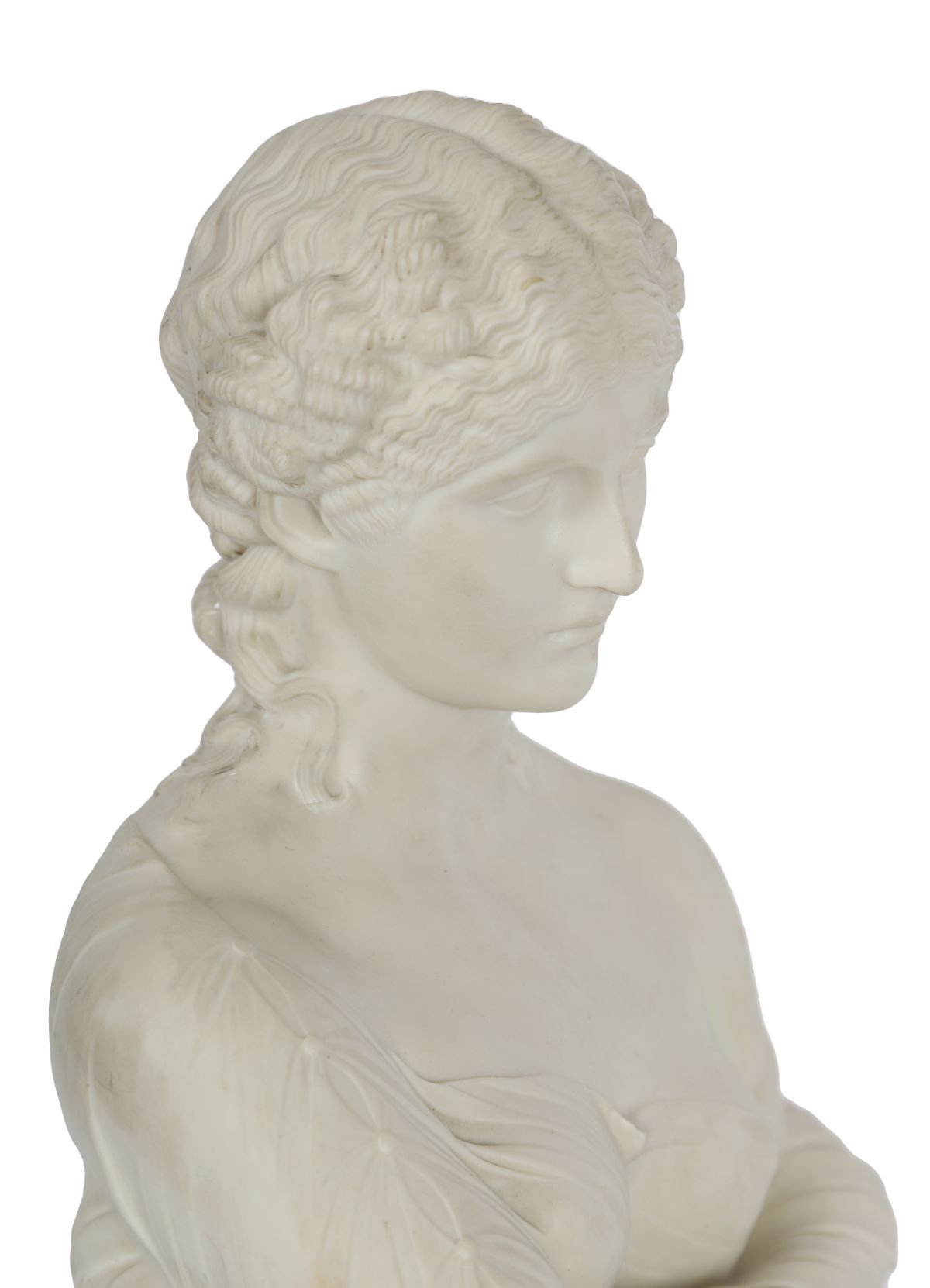 A Copeland Parian porcelain bust representing Clio, Muse of History, modelled with classical drapery and finely detailed hair, raised on an integral socle. English, 19th century.