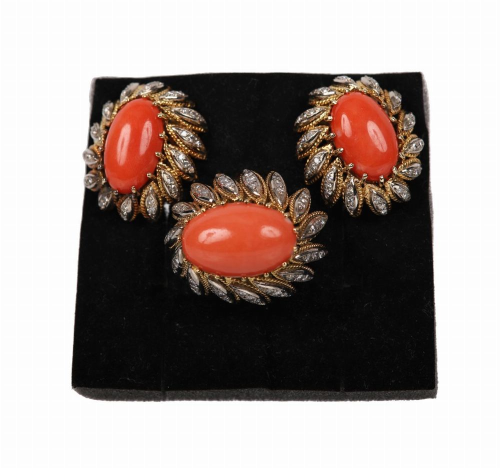 Comprising a ring and matching earrings, each featuring oval cabochon coral within diamond-set foliate borders.