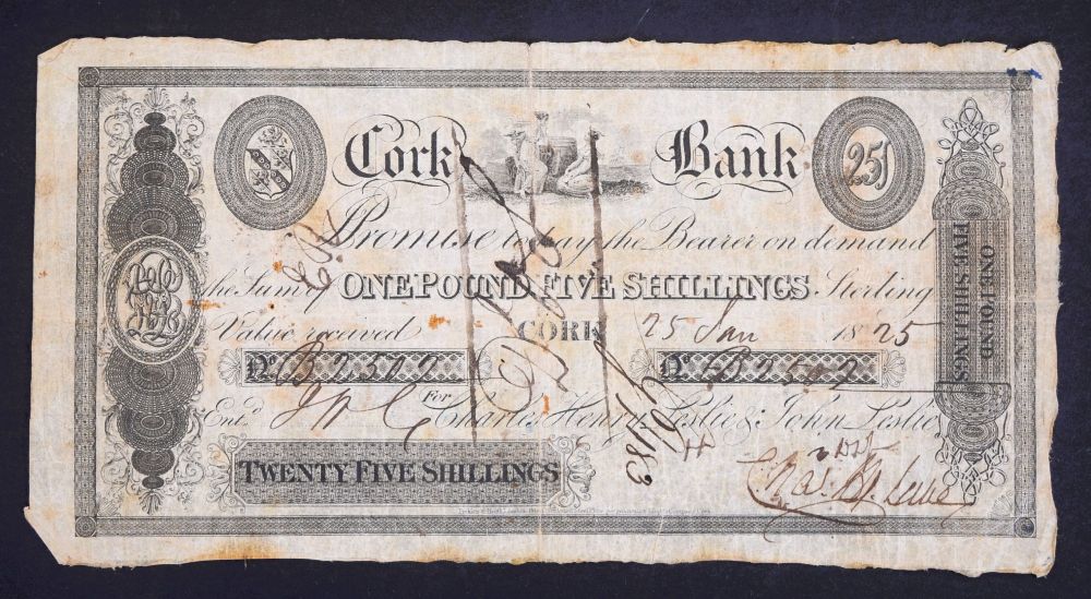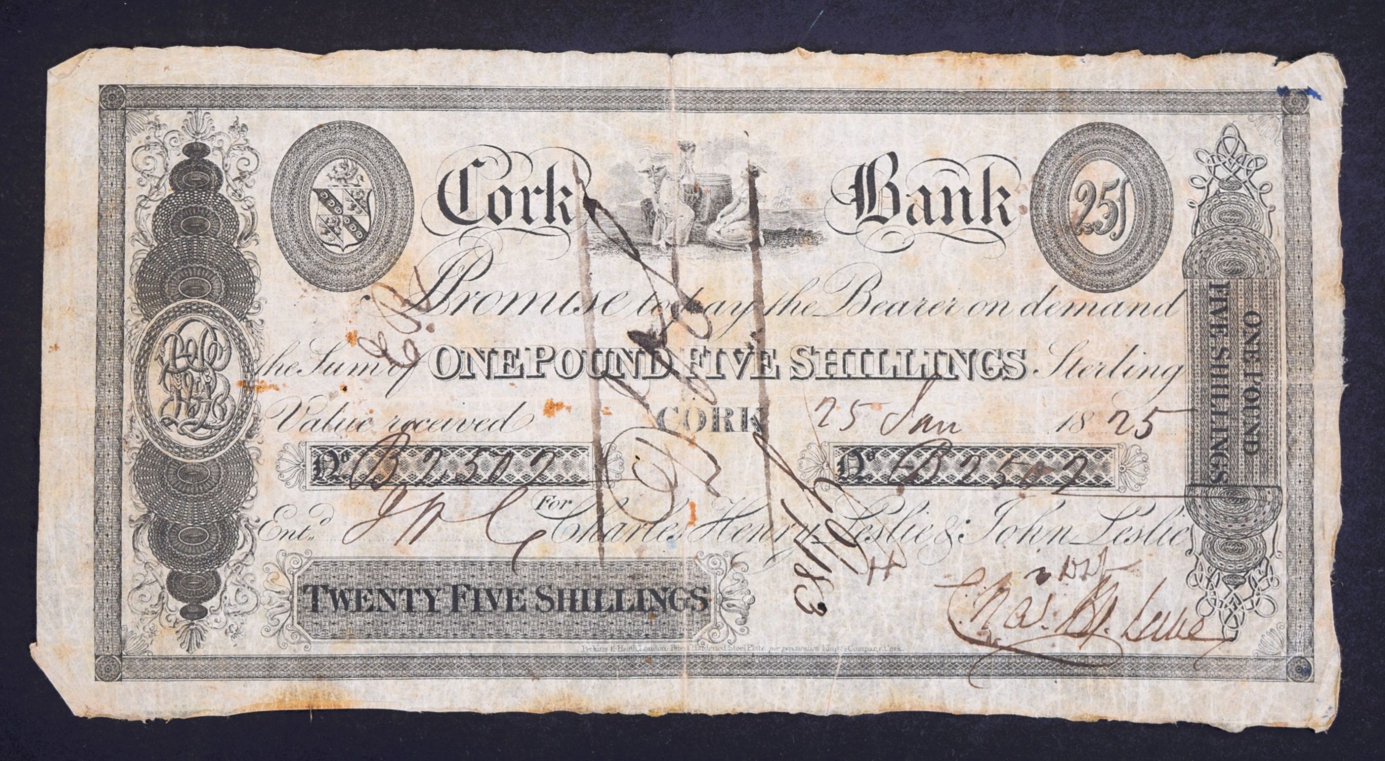 A rare surviving provincial Irish bank note issued by the Cork Bank, denominated one pound five shillings, and dated 25 January 1825. Private and regional bank notes of this period were often issued by local bankers.