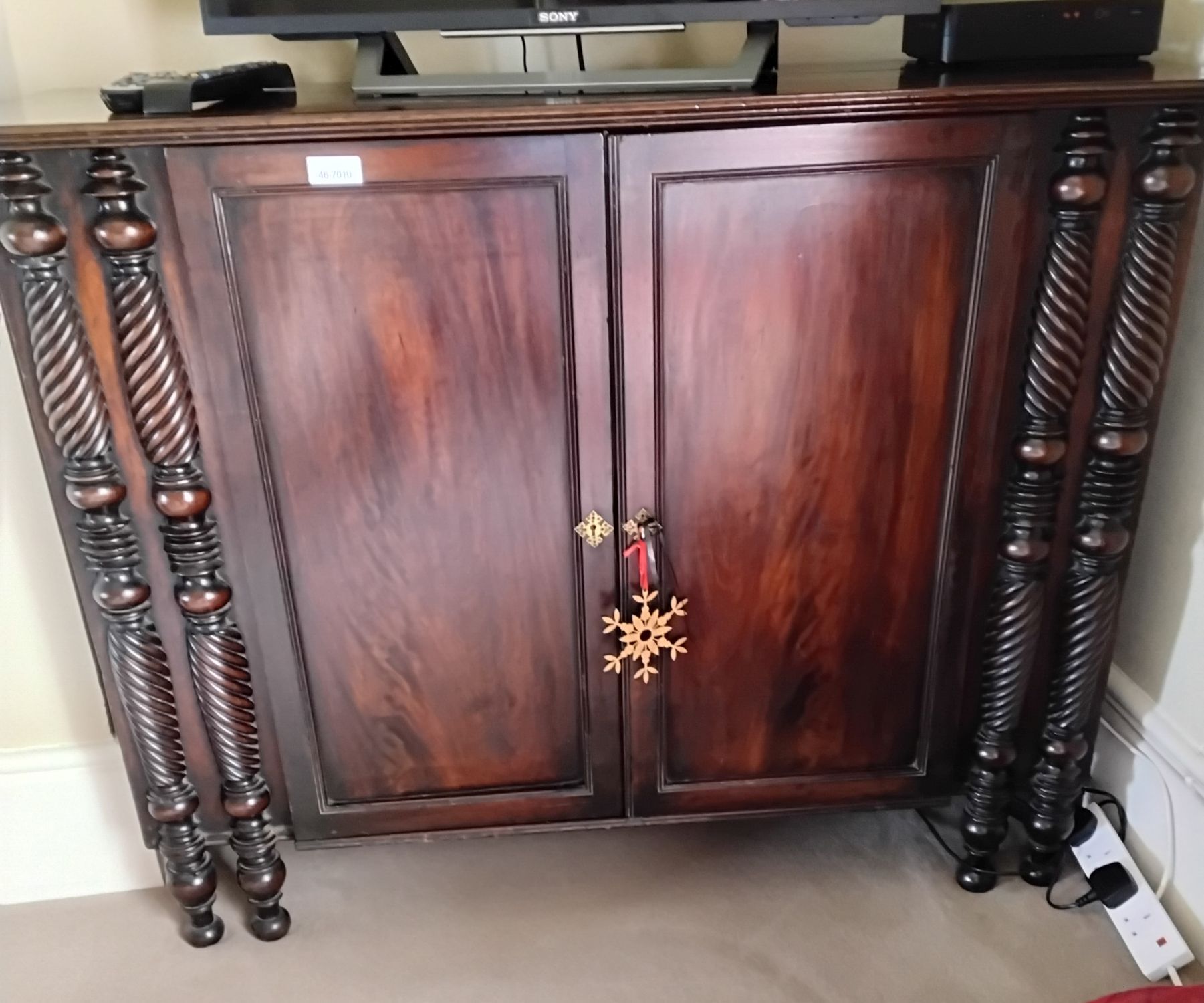 A Cork Regency period mahogany side cabinet, the rectangular top above a plain frieze and two panelled doors between twin spiral-twist supports, raised on boldly turned legs.